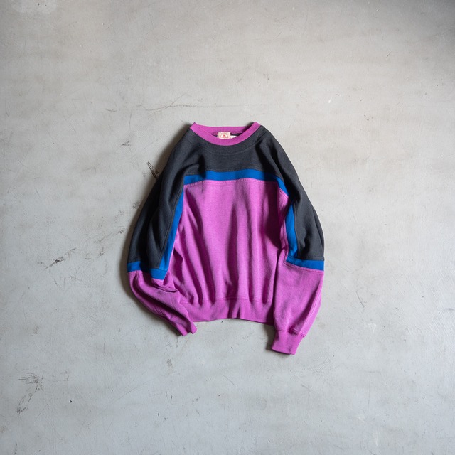 ................ "KNIGHTSBRIDGE" '90s vintage Multi colored jersey pullover ................ KNIGHTSBRIDGE(ナイツブリッジ)という米国ブランドのユーズドカットソーになります。 米国で80年代から90年代に流通したものだと思われます。 主にメンズスポーツ、カジュアルウェアを80-90年代に米国で展開したブランドで、現存はしないと思われます。 今回ピックした個体は、布帛生地とスムースジャージーとのコンビネーションで仕立てれたプルオーバーです。 パープルとライトグレー色の部分は布帛、ブルーの部分はスムース編みのカットソー生地になります。 主にロックミシンで裁断面をかがり、本縫いで剥ぎを縫い合わせています。 布帛とニットを組み合わせるという難しさがありますが、大胆に組み合わせたUSAブランドらしい作りだと思いました。 カラーリングがユニークな、少し派手目のトップスですが、メインでもインナーでも色を頼りにコーデを練ると、楽しさは倍増します。 ぜひご検討ください。 ●サイズ: 表記 S (日本人女性M-Lサイズ、男性S-Mサイズ相当) 肩幅 53cm 身幅 55cm 着丈 68cm 袖丈 59cm 袖口幅 9-12cm アームホール 27.5cm ※若干の誤差はご了承ください。 ●色: ライトグレー・ブルー・パープル ●素材: ポリエステル 65% コットン 35% ●原産国: 台湾製 ●状態: 目立った外傷やほつれなどはございません。 あくまでも中古品/古物ですので、認識できないほどの小さな汚れ、保管時の劣化がある場合がございます。 当店としてはこれらも含めて、古着や古物の味や魅力として解釈しております。 誠に恐れ入りますがその旨ご理解頂いた上でご購入をお願いします。 ※アイテムは他サイトと在庫を共有しており、完売の場合もございます。