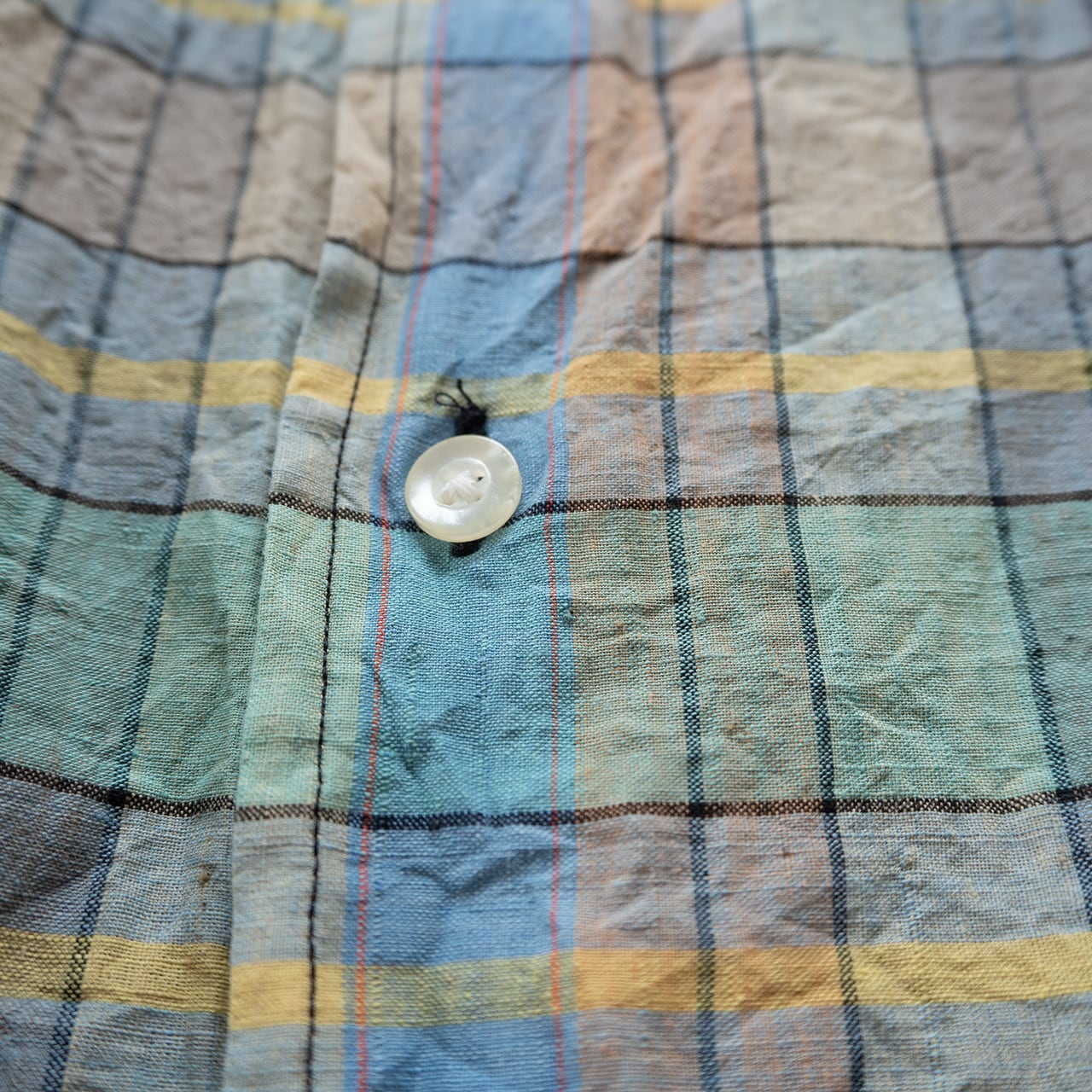 イエロー・ライトグリーン・パープル・レッド・ブラウン・オレンジなど複数色の先染糸を折り合わせた本場のマドラスチェックです。