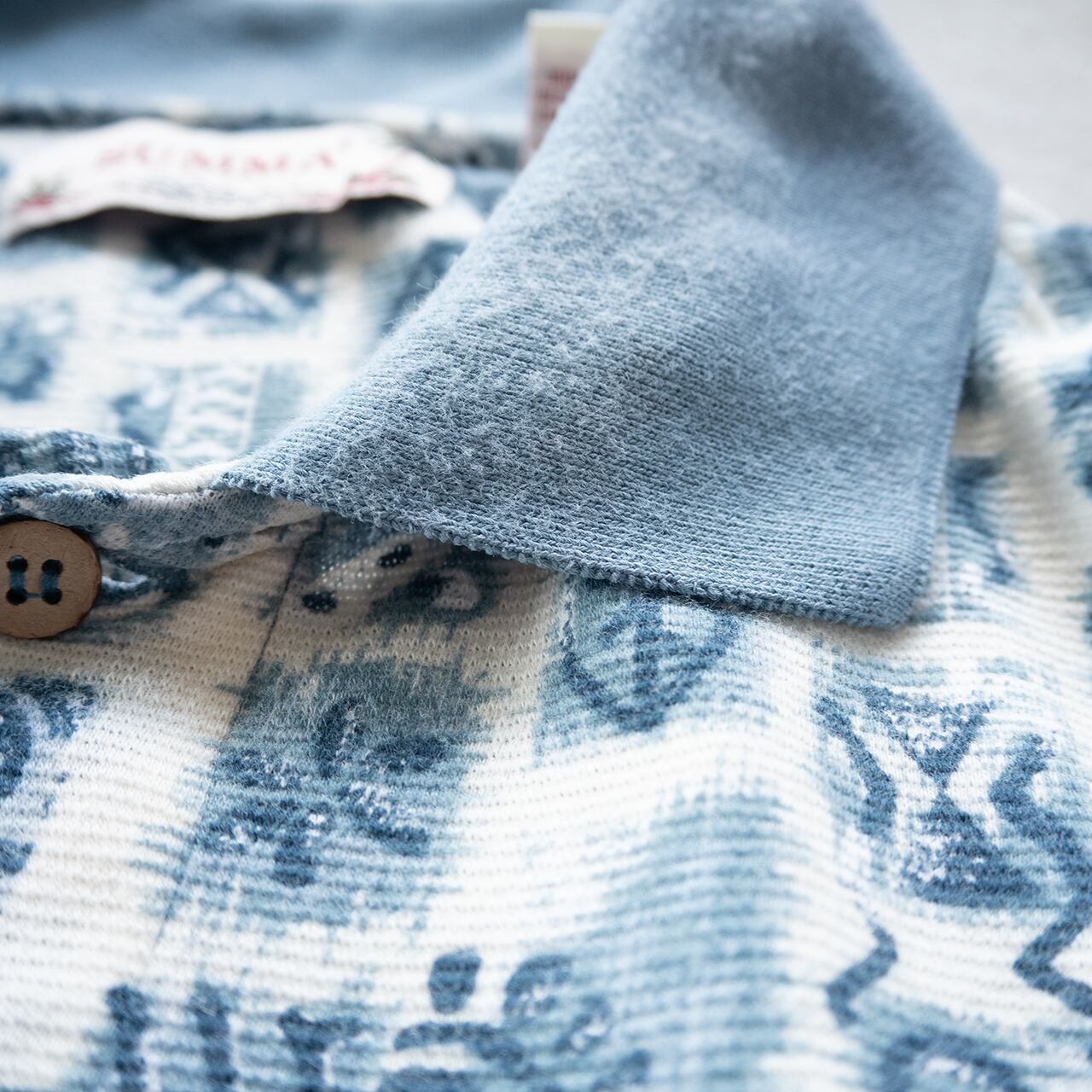 袖口や裾はリブ編みで切り替えられており、柄のブルーを基調にした配色になります。