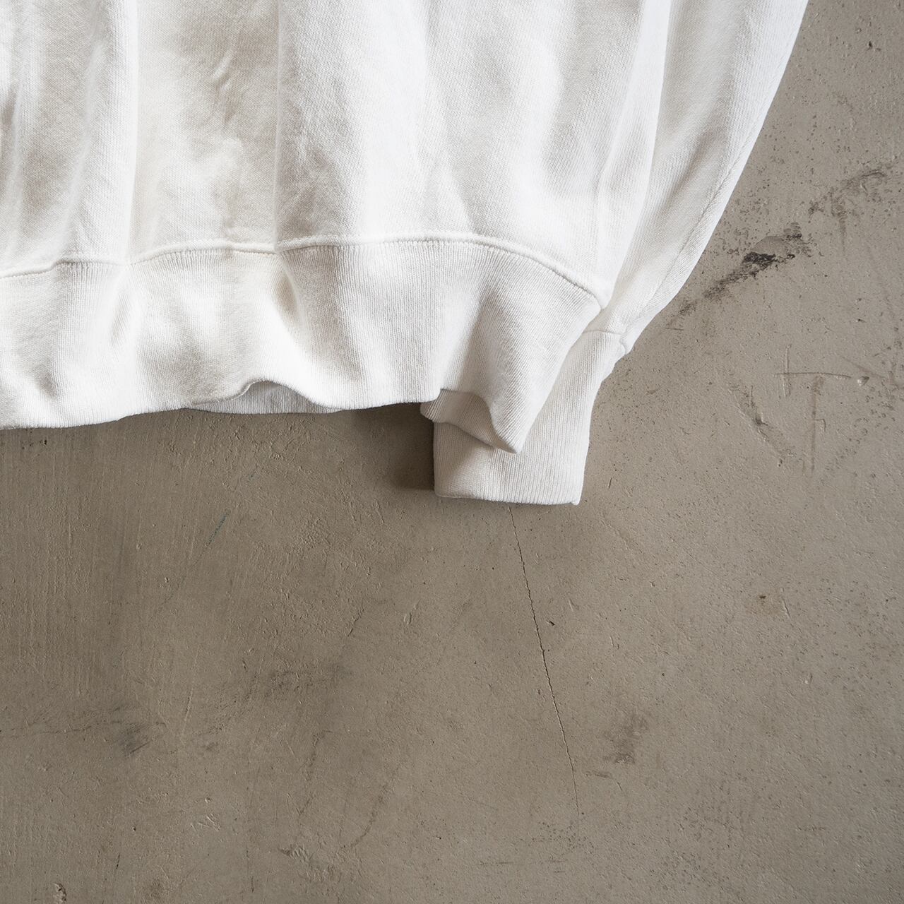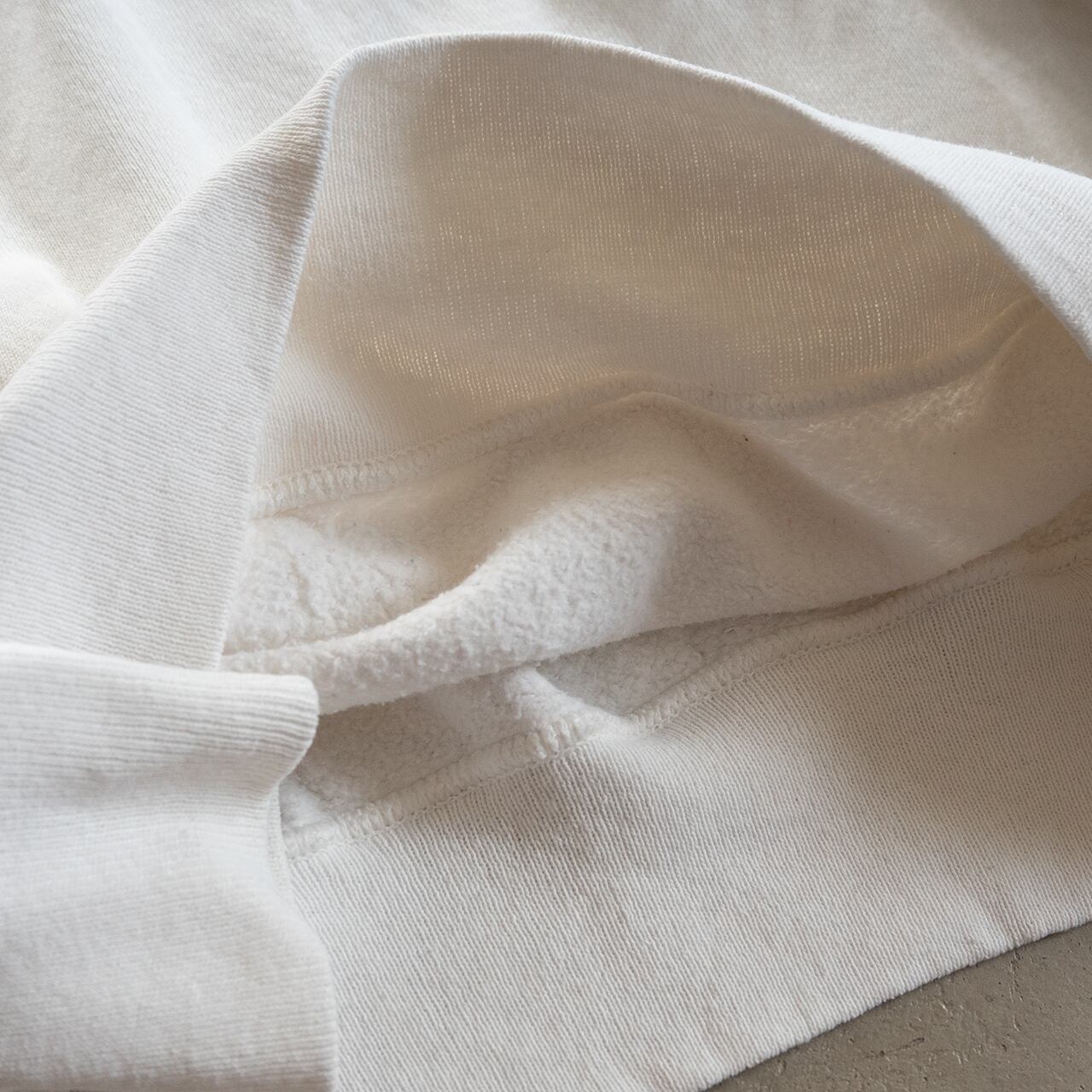 ボディは、ポリエステル50%/コットン50の裏毛で、90年代MADE IN USAの民間カジュアル衣料スウェットの特徴とも言える、やや潰れたような薄手の素材感、そしてラグランスリーブになります。