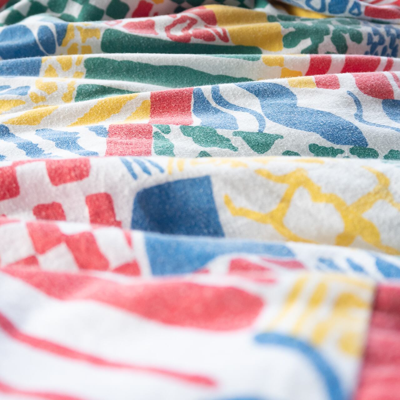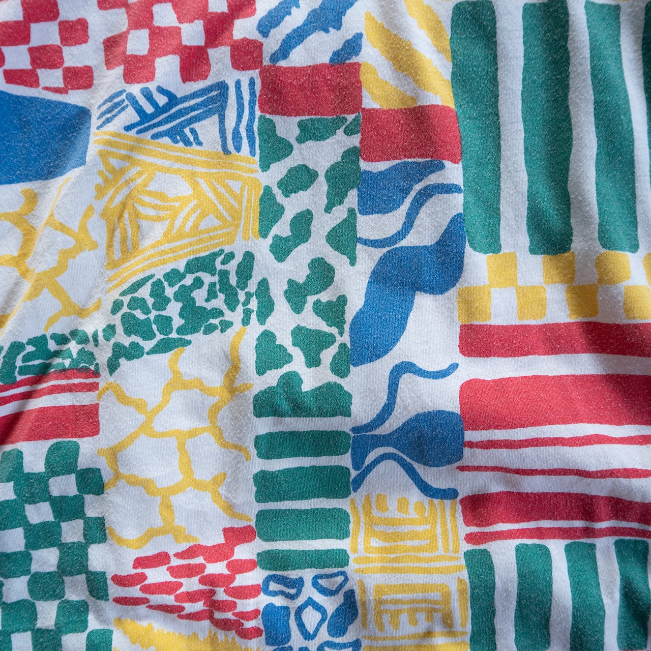 格子のような、縦ラインのような、やんわりとセグメントされたクレイジーな総柄が最高にクールです。