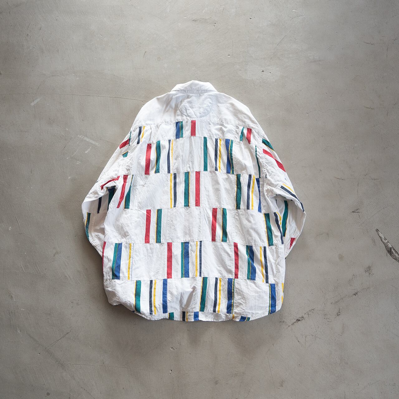 今回の一着は、原色カラーを中心にしたマルチカラーを含んだ、白グランドのパッチワークのシャツです。