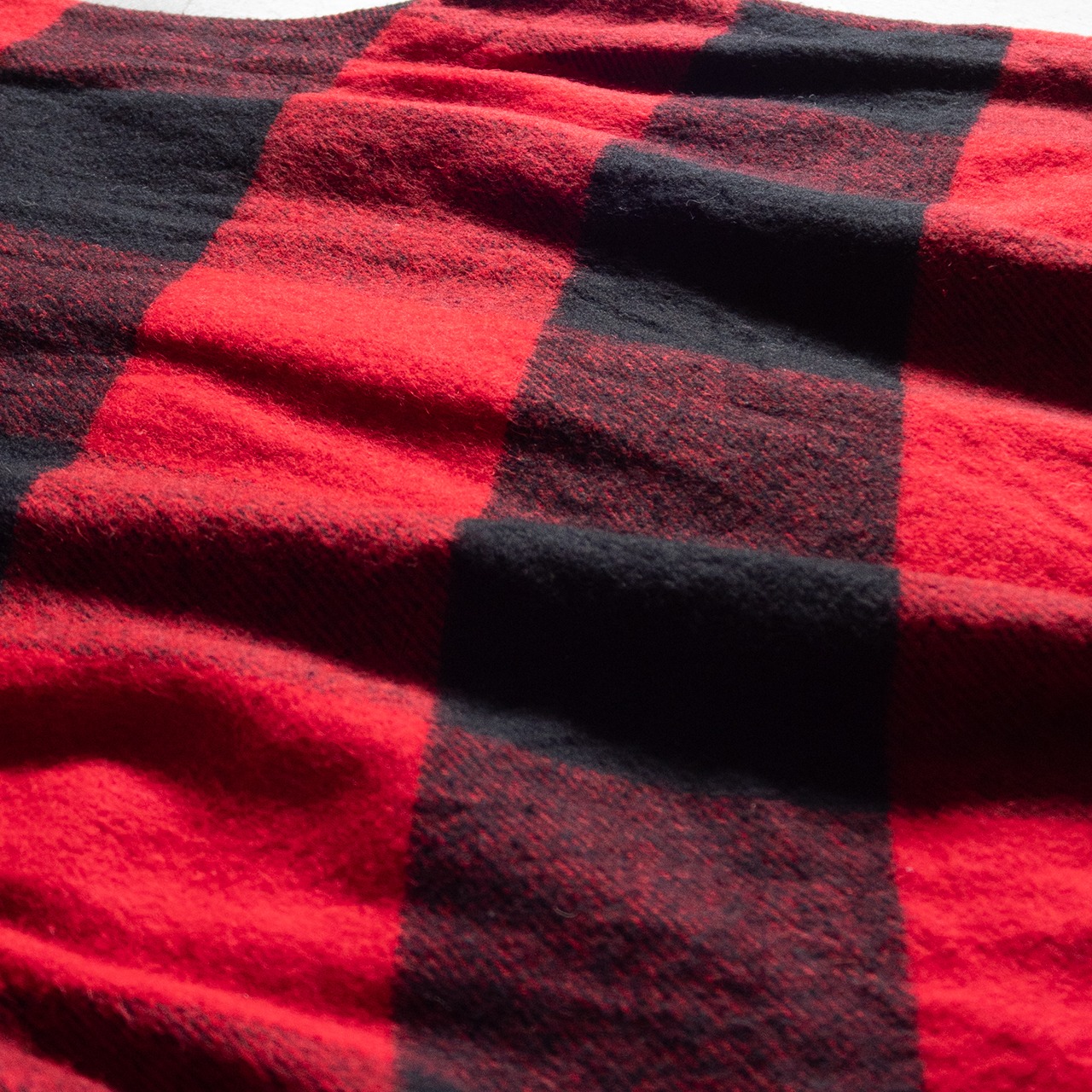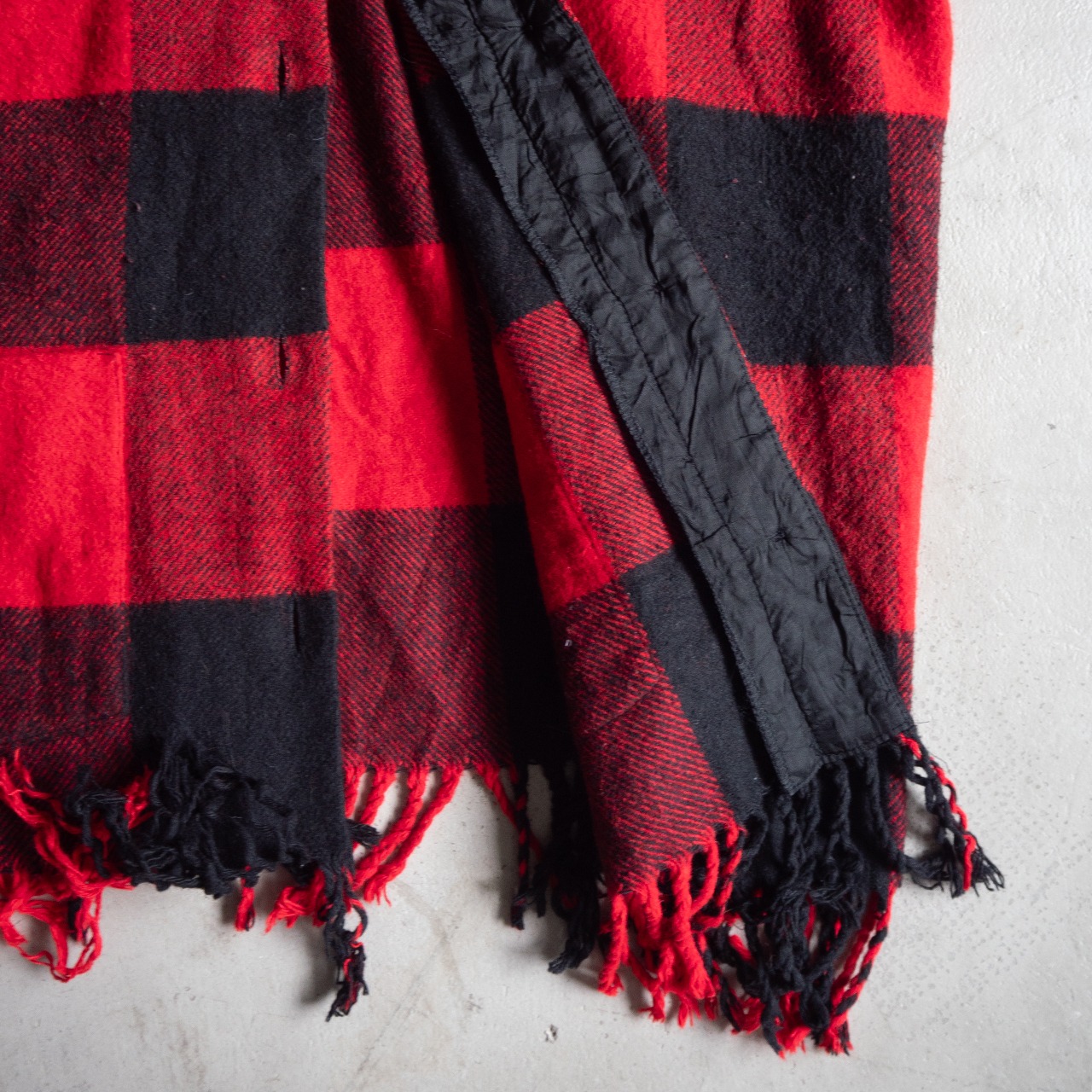 フリンジの揺れはエレガントさを漂わせますが、赤と黒のバッファローチェックというワイルドさとは真逆となり、このギャップにファッション性を感じます。