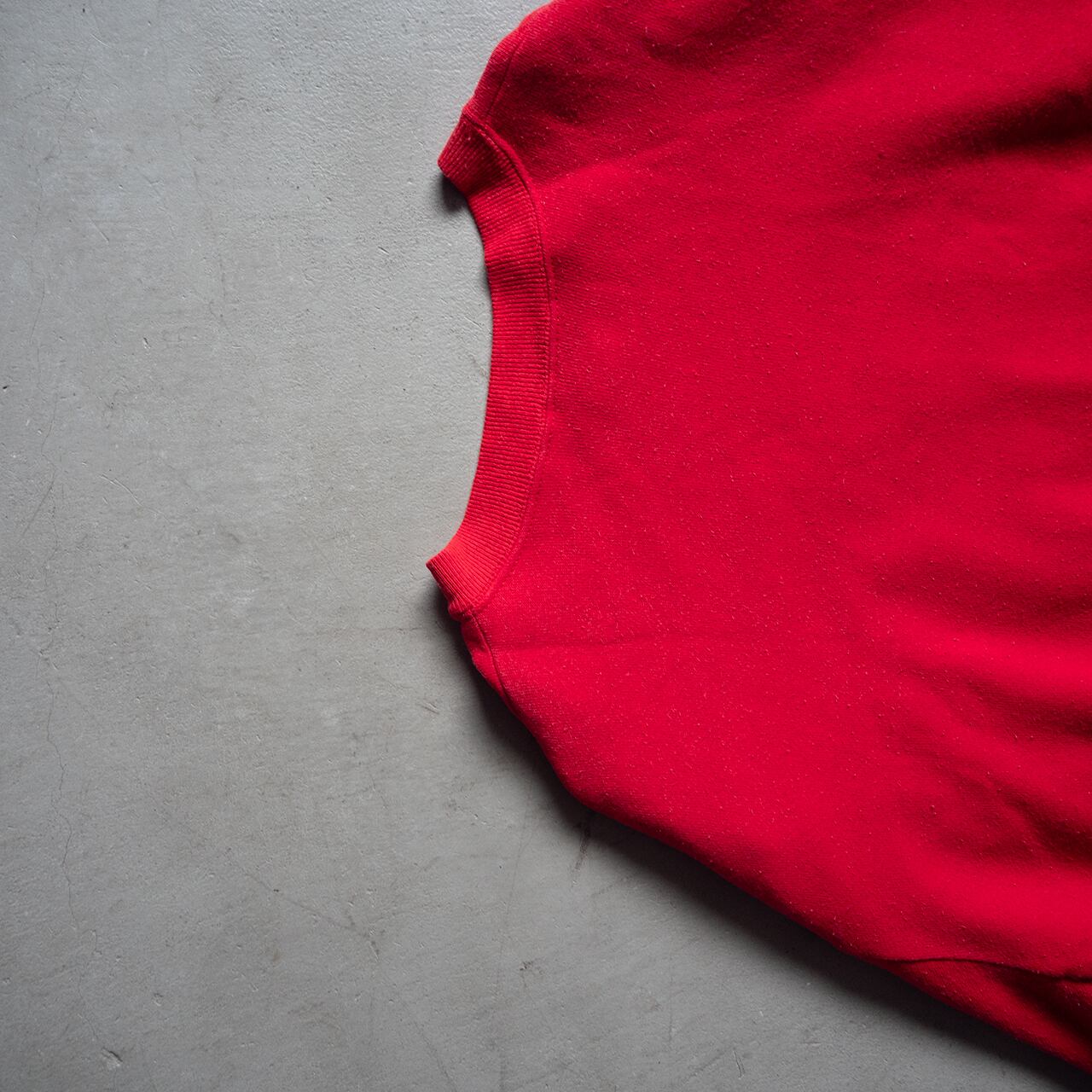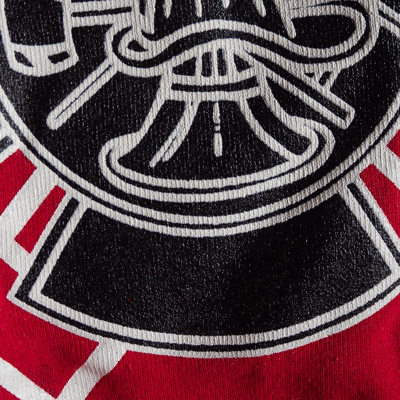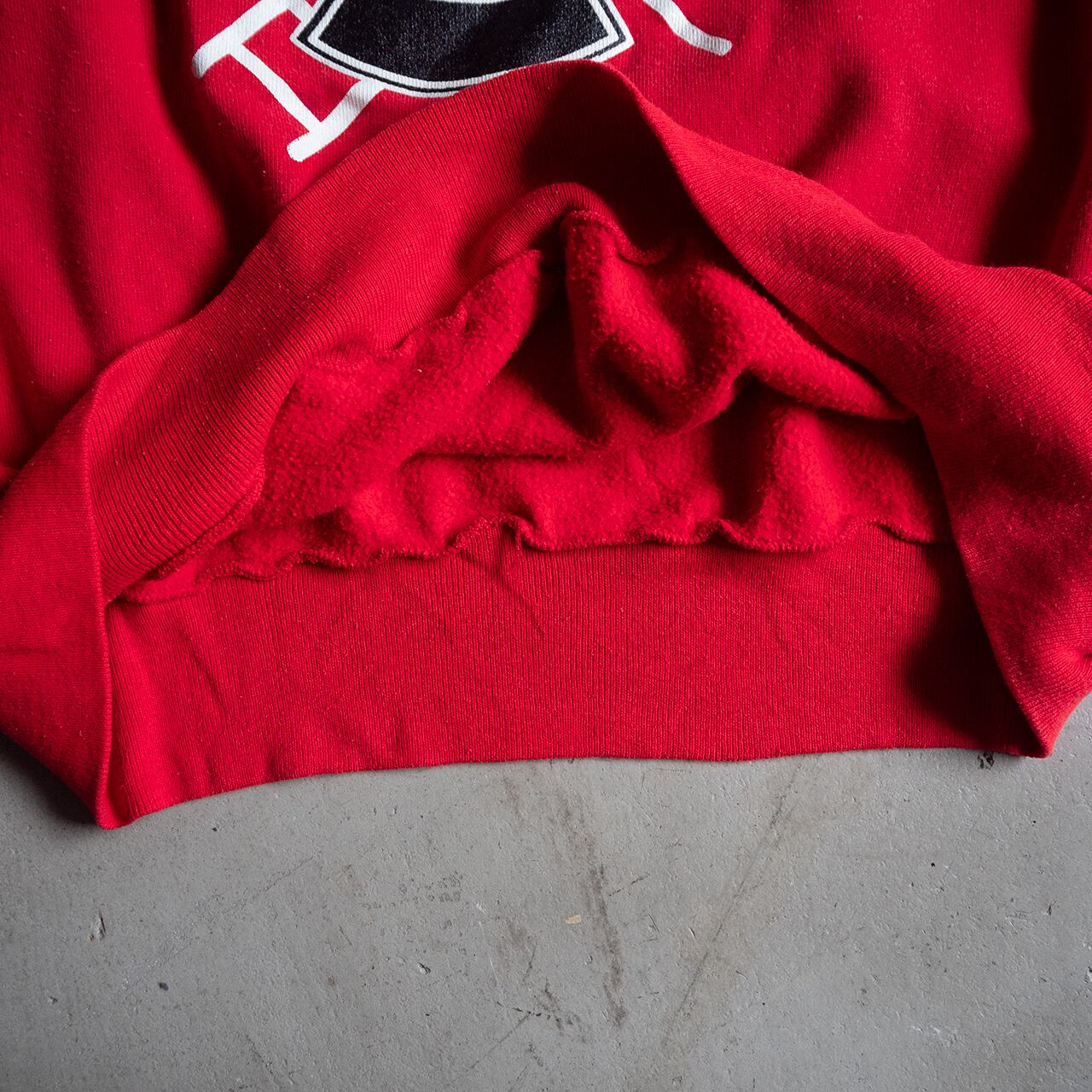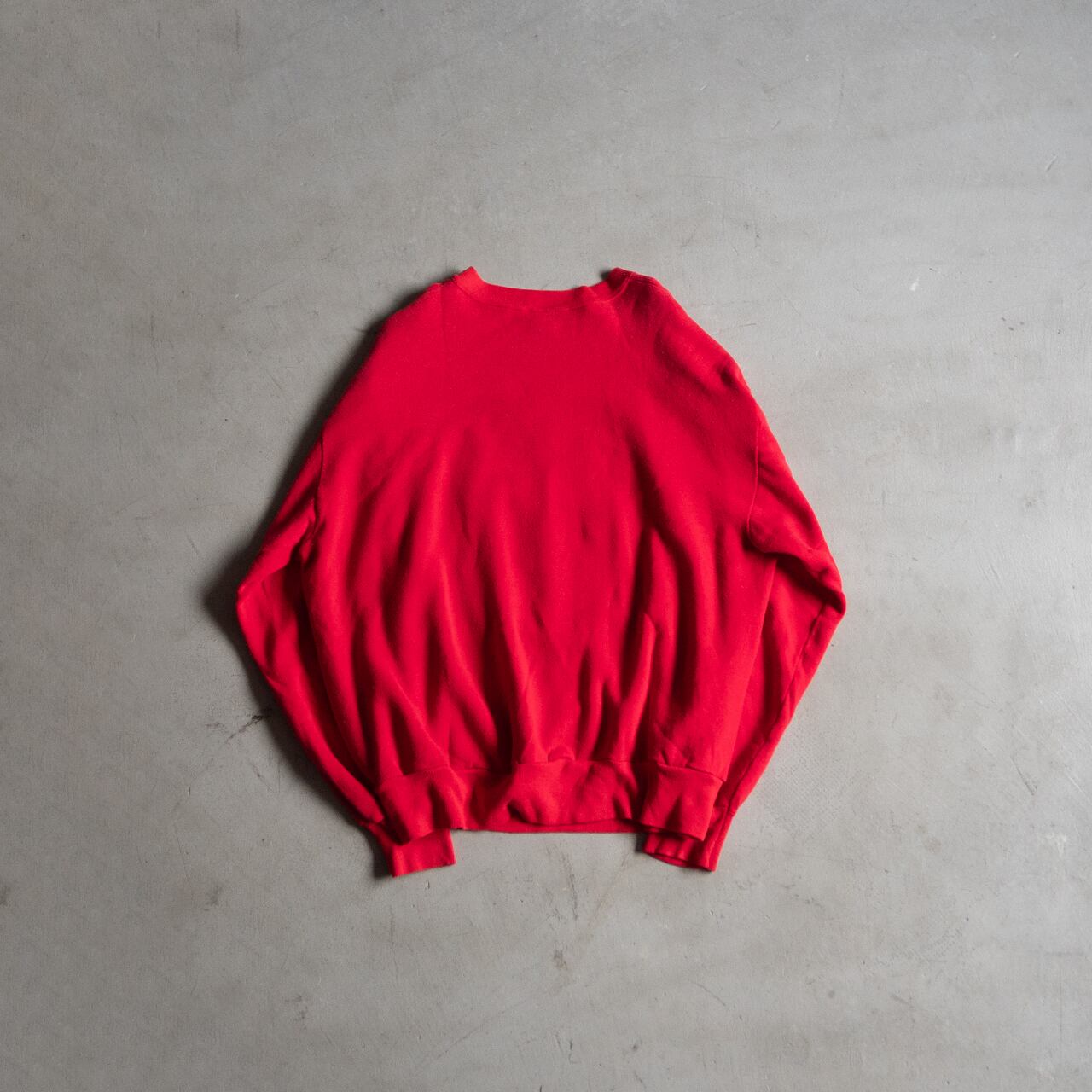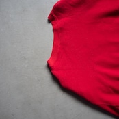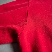 コットンアクリルで編み立てられた裏毛で、真っ赤なボディに黒と白の顔料ラバープリントが施されたクルーネックプルオーバーです。