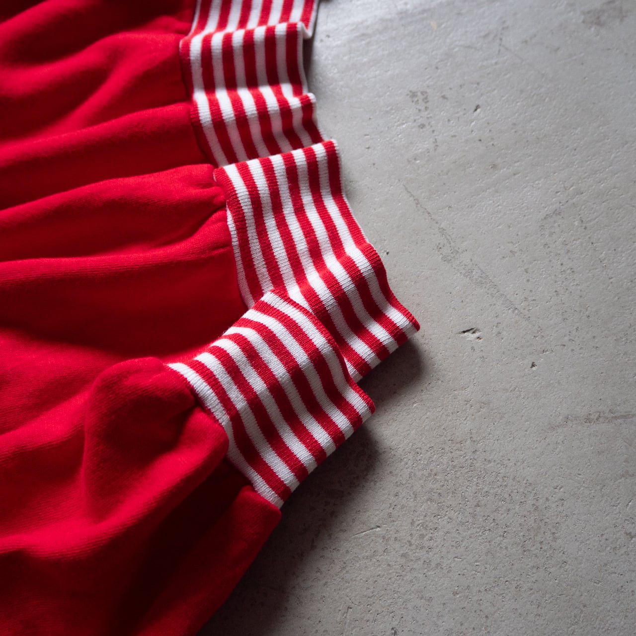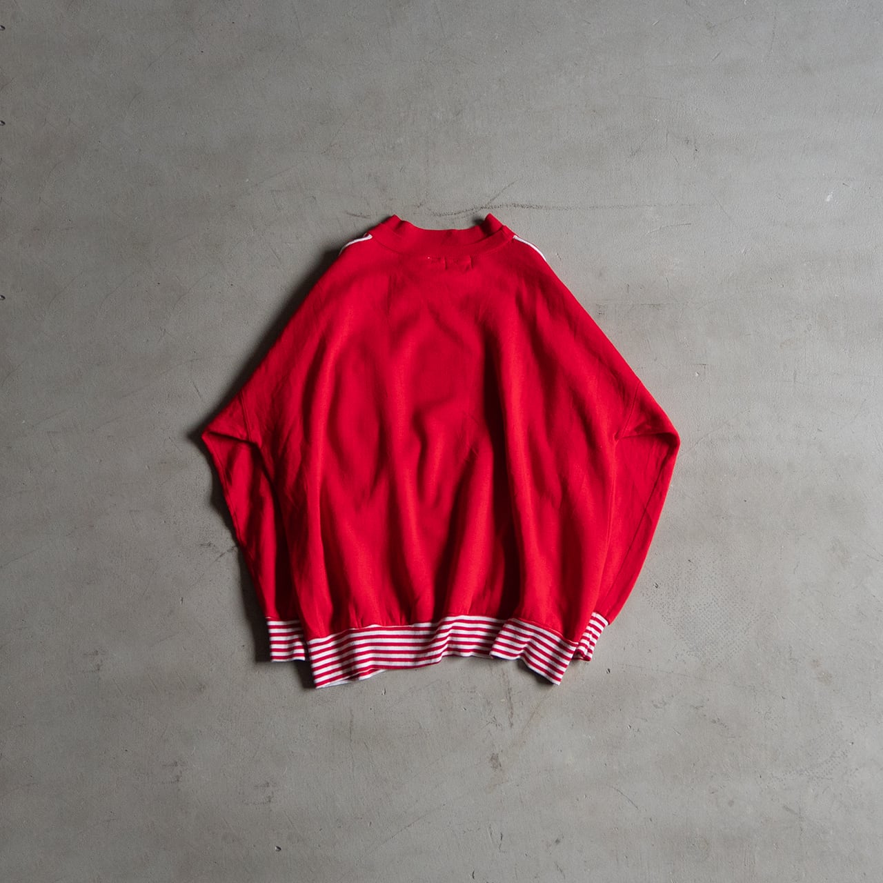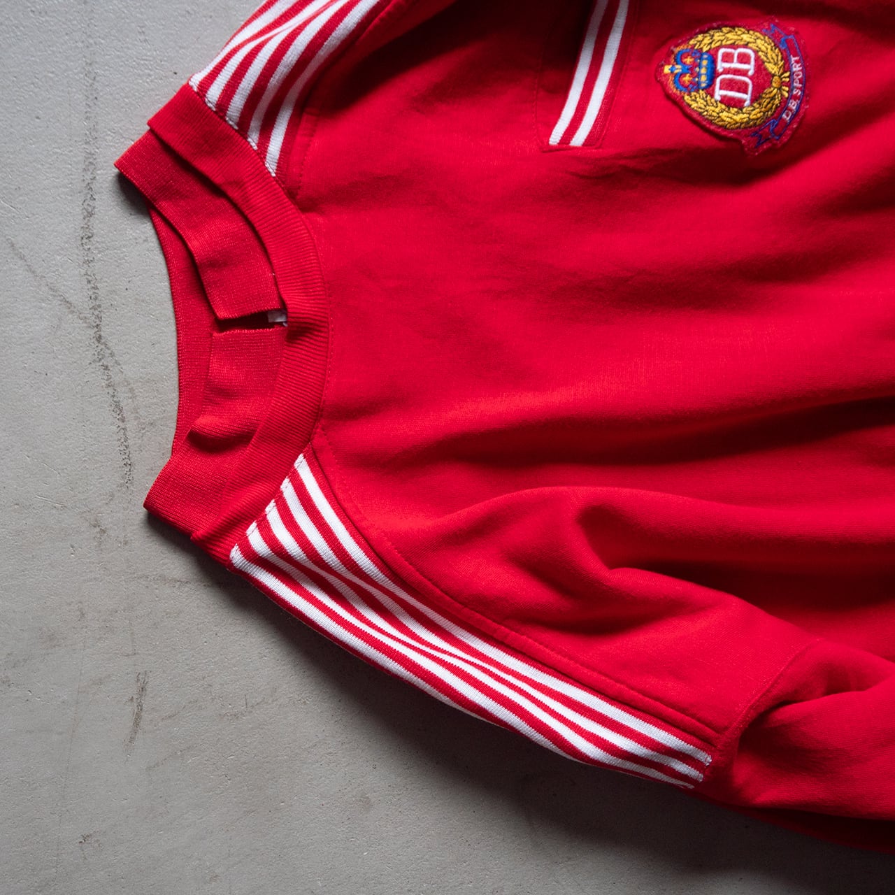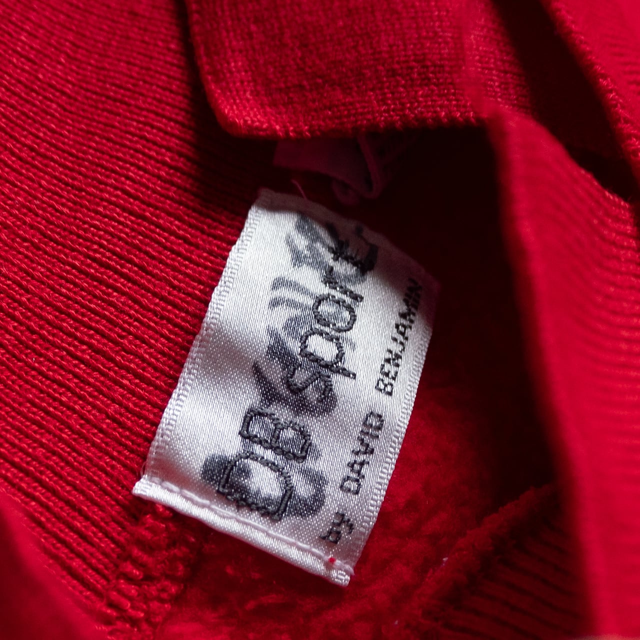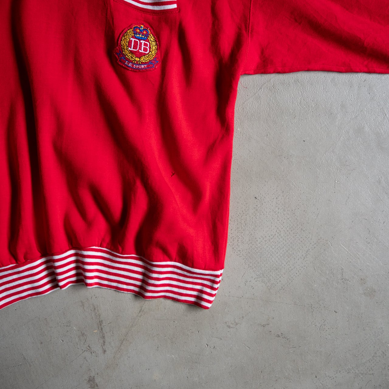 ブランド詳細は不明ですが、D.B. SPORTというスポーツカジュアルブランドの古着で、赤いスウェットプルオーバーになります。