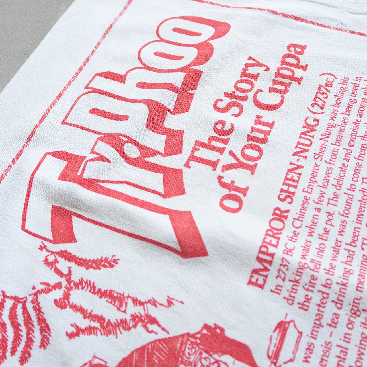 このティータオルには、中国神話によると紀元前2737年頃に中国の伝説上の皇帝である神農によって発見されたとされるお茶の伝説的な起源が描かれています。