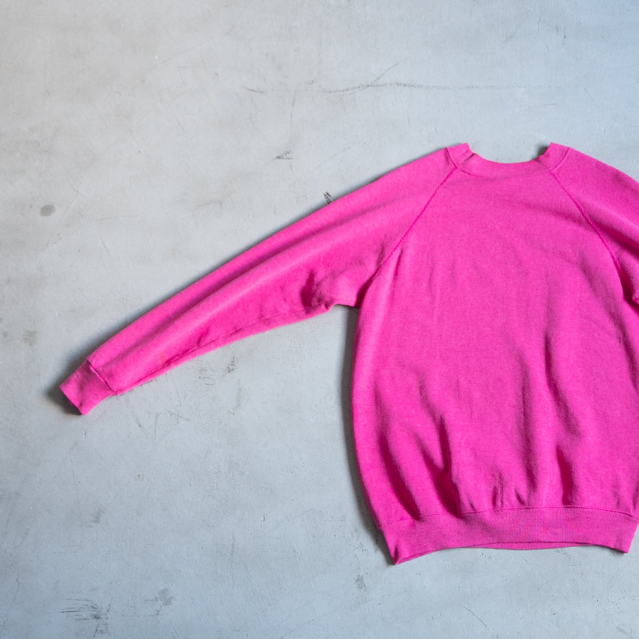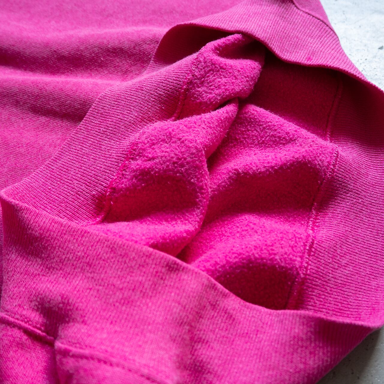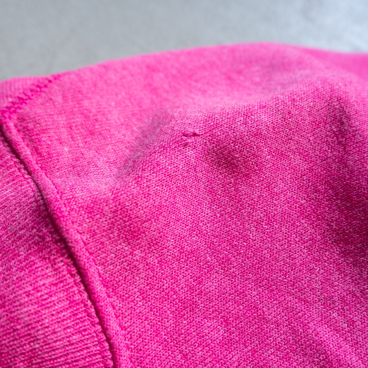 ボディは、コットン50%アクリル50%の裏毛スウェットで、ベタ色のピンクに見えますがよく見ると、ワタ段階で色をブレンドしたトップ杢になっています。