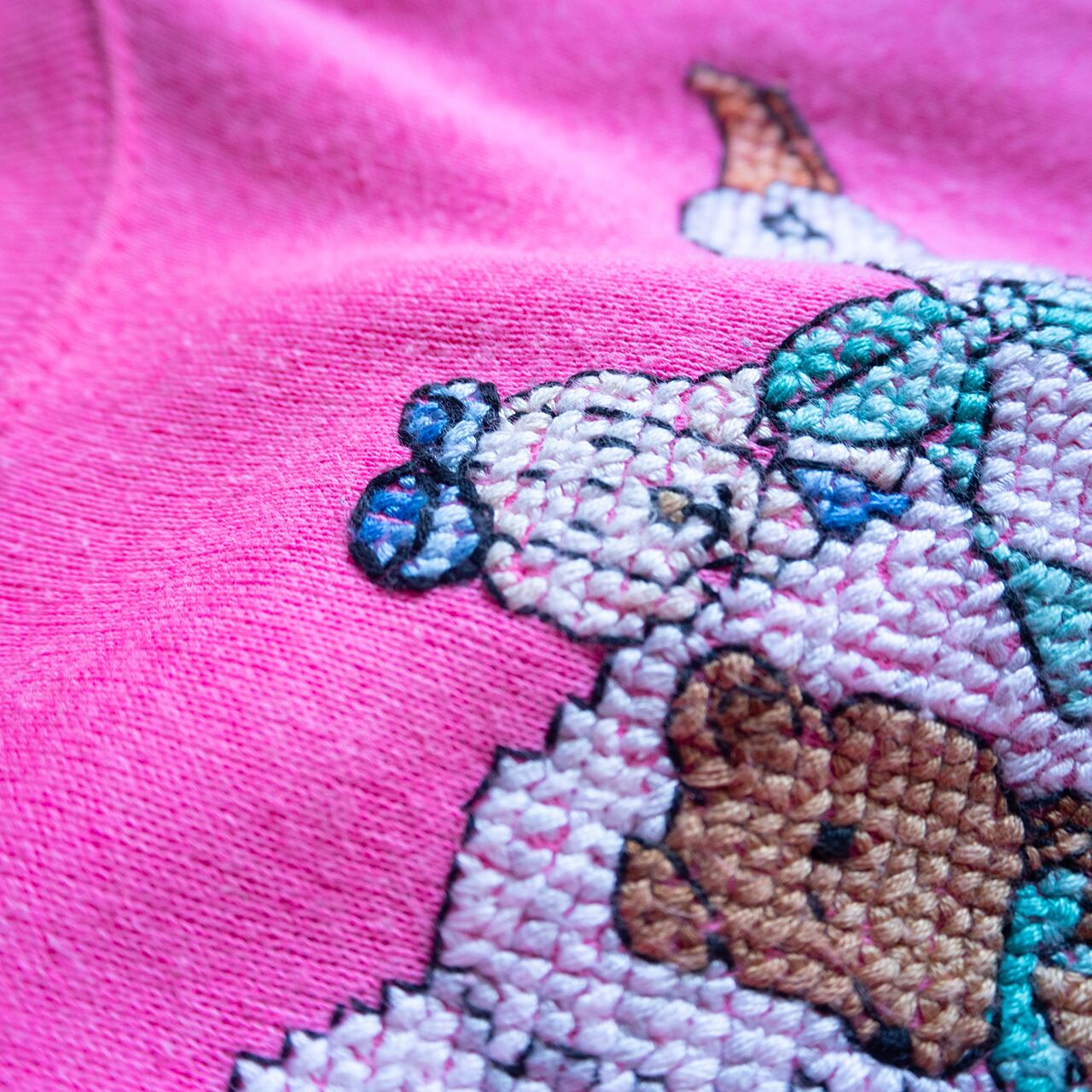 胸にある刺繍は、アヒルとクマ、イヌのぬいぐるみをモチーフにしています。