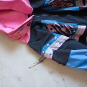 ピンク・ブラック・ブルーのナイロンシェルで作られたジャケットに、ハンドペイントされたデザインです。