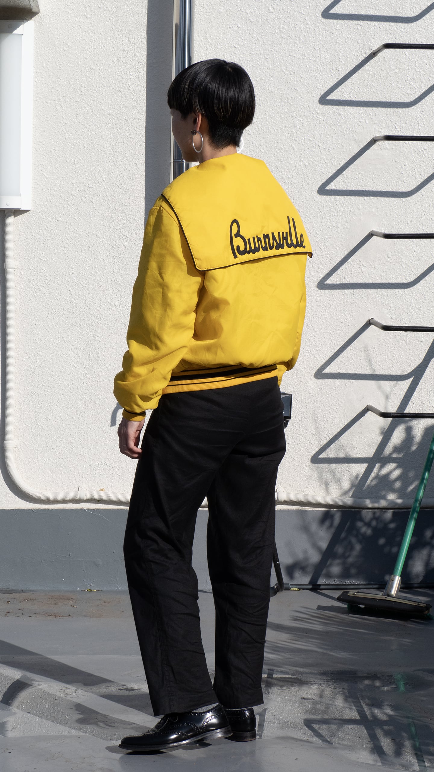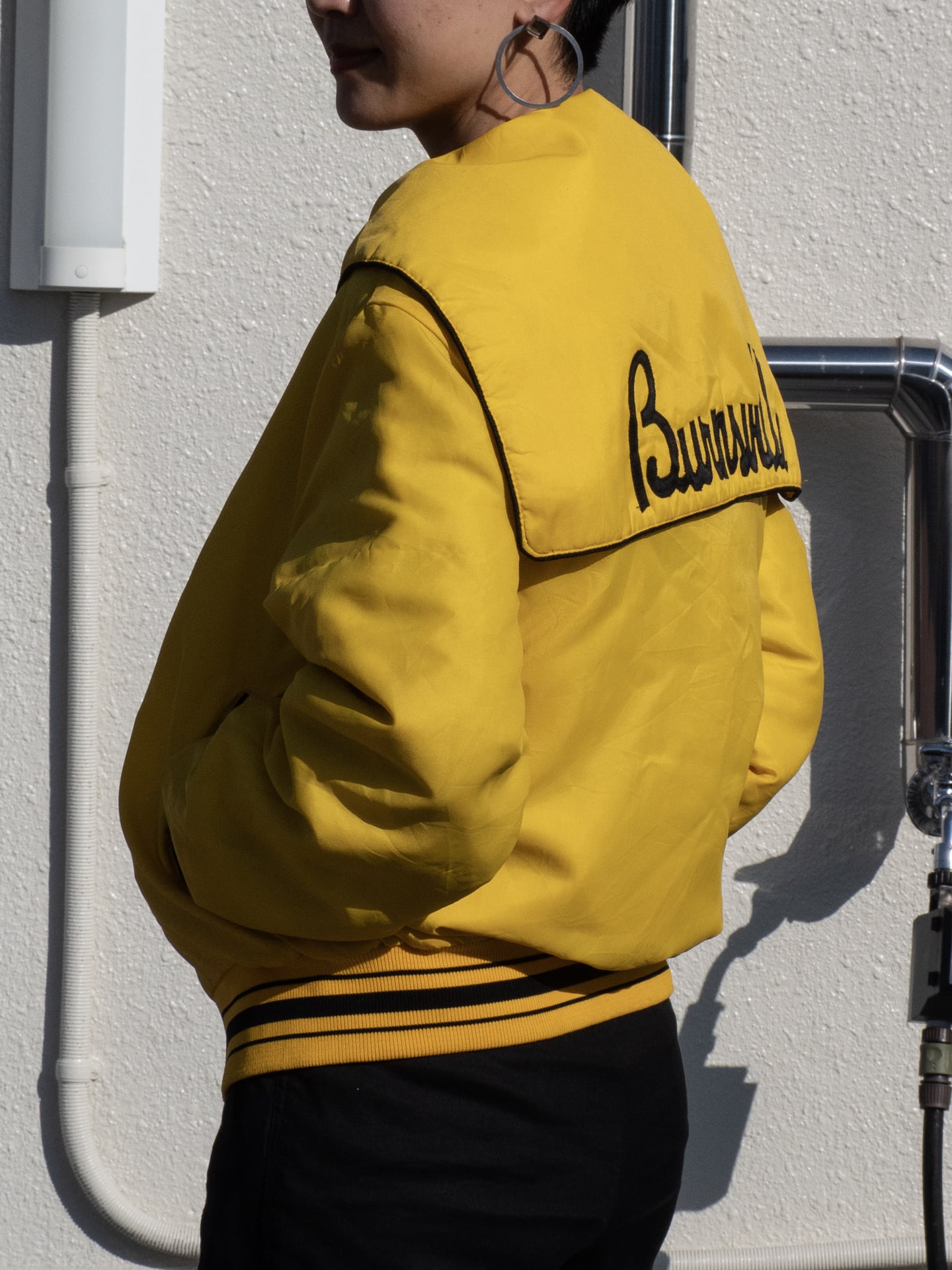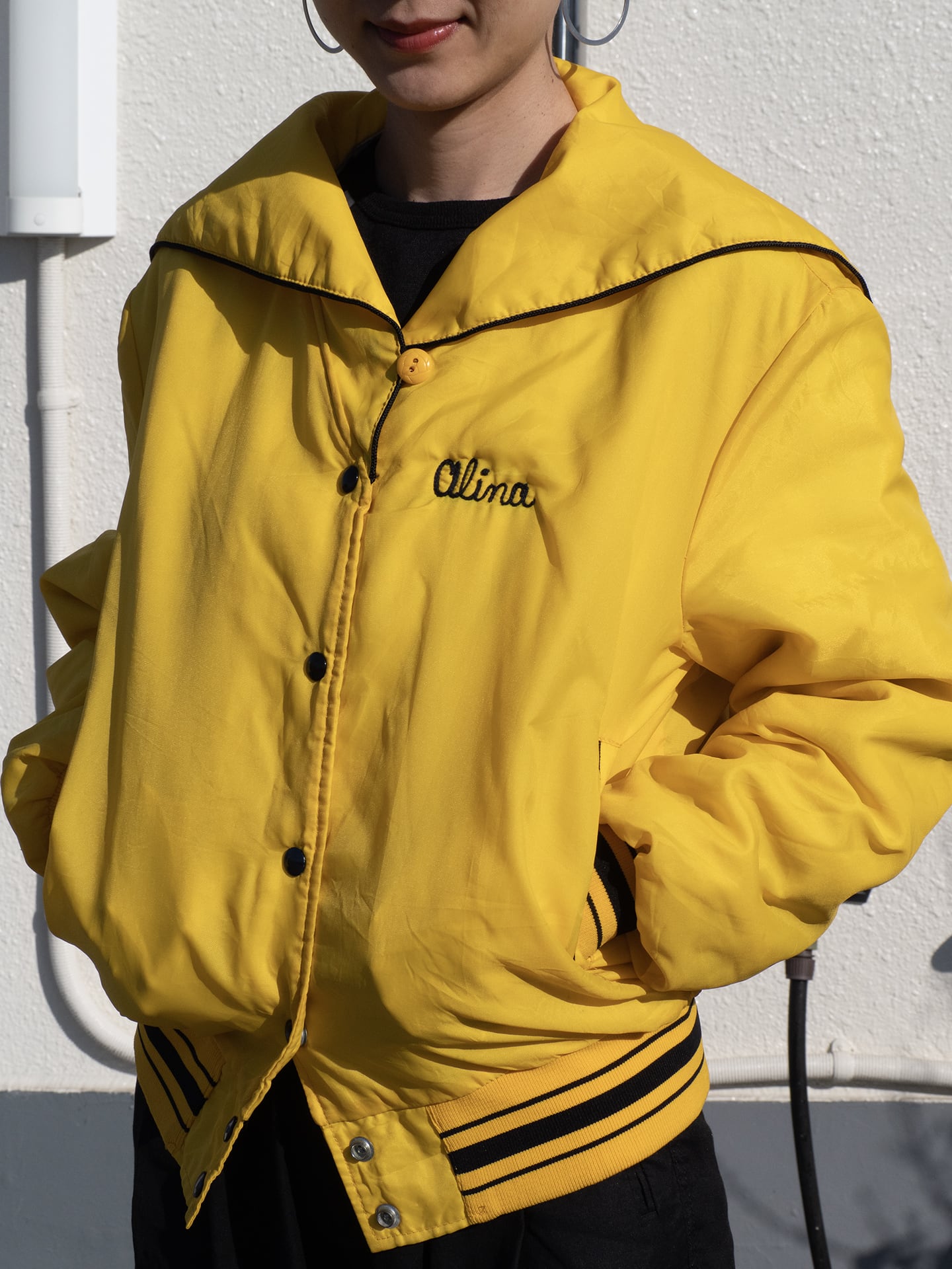 イエローとブラックの配色、セーラー襟、パイピングのブラック、リブのボーダーピッチ、チェーンステッチのネーム刺繍、いずれもクールであり凝った仕様です。