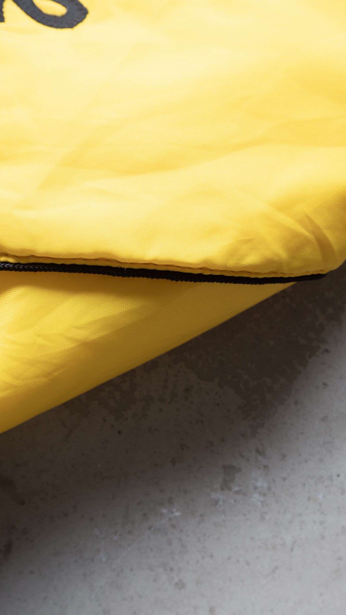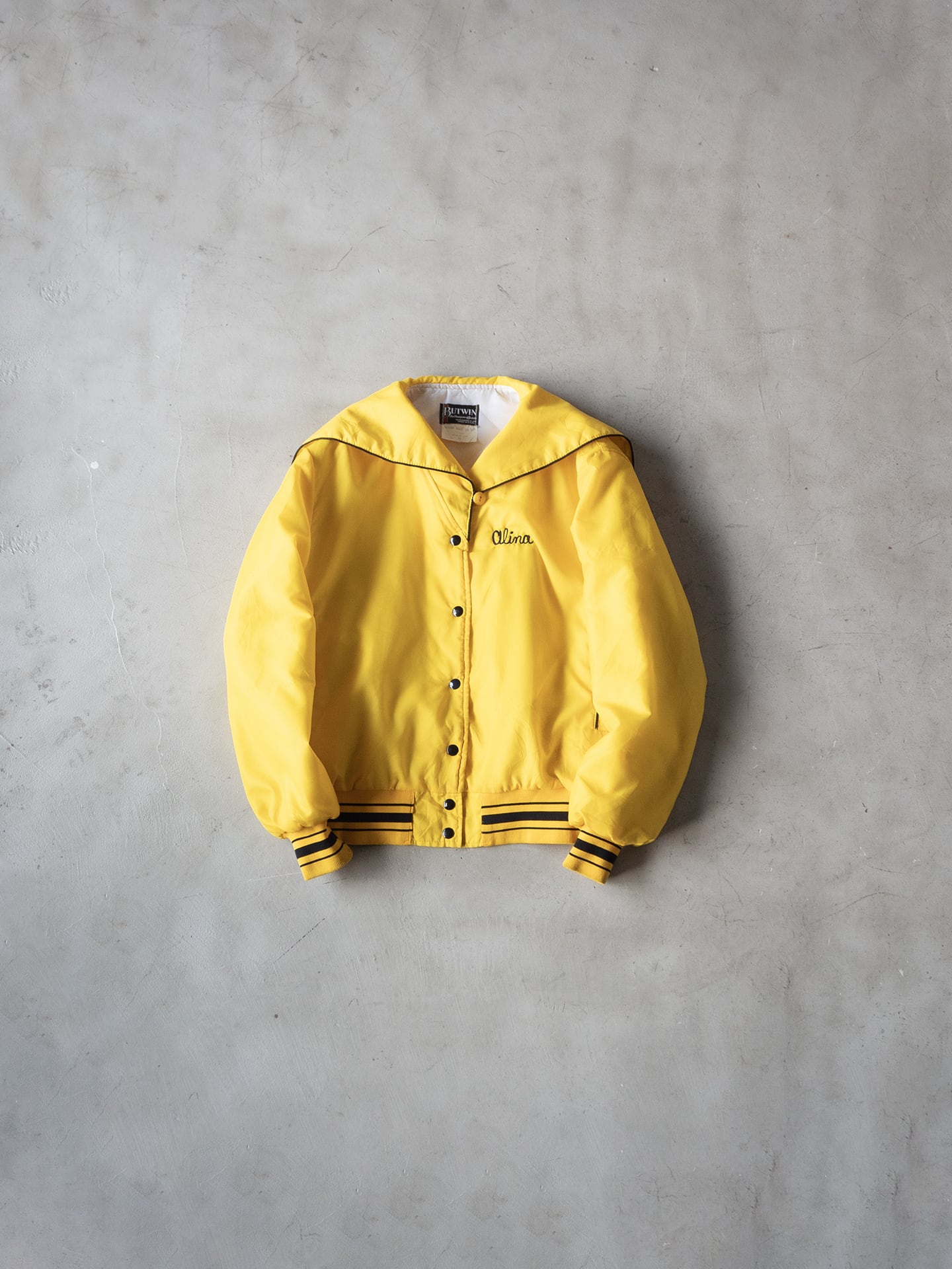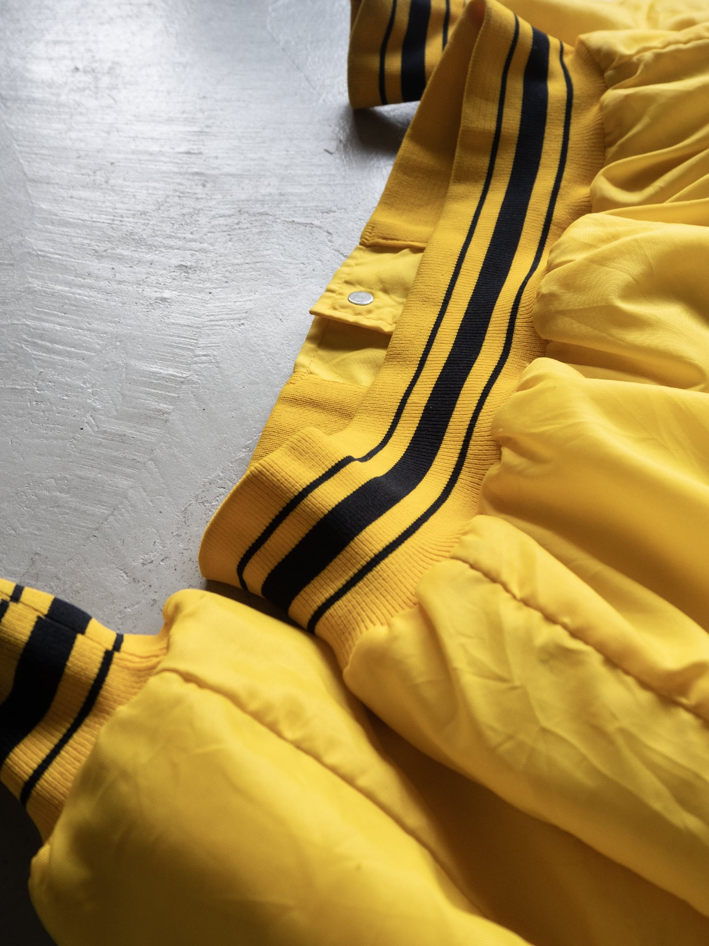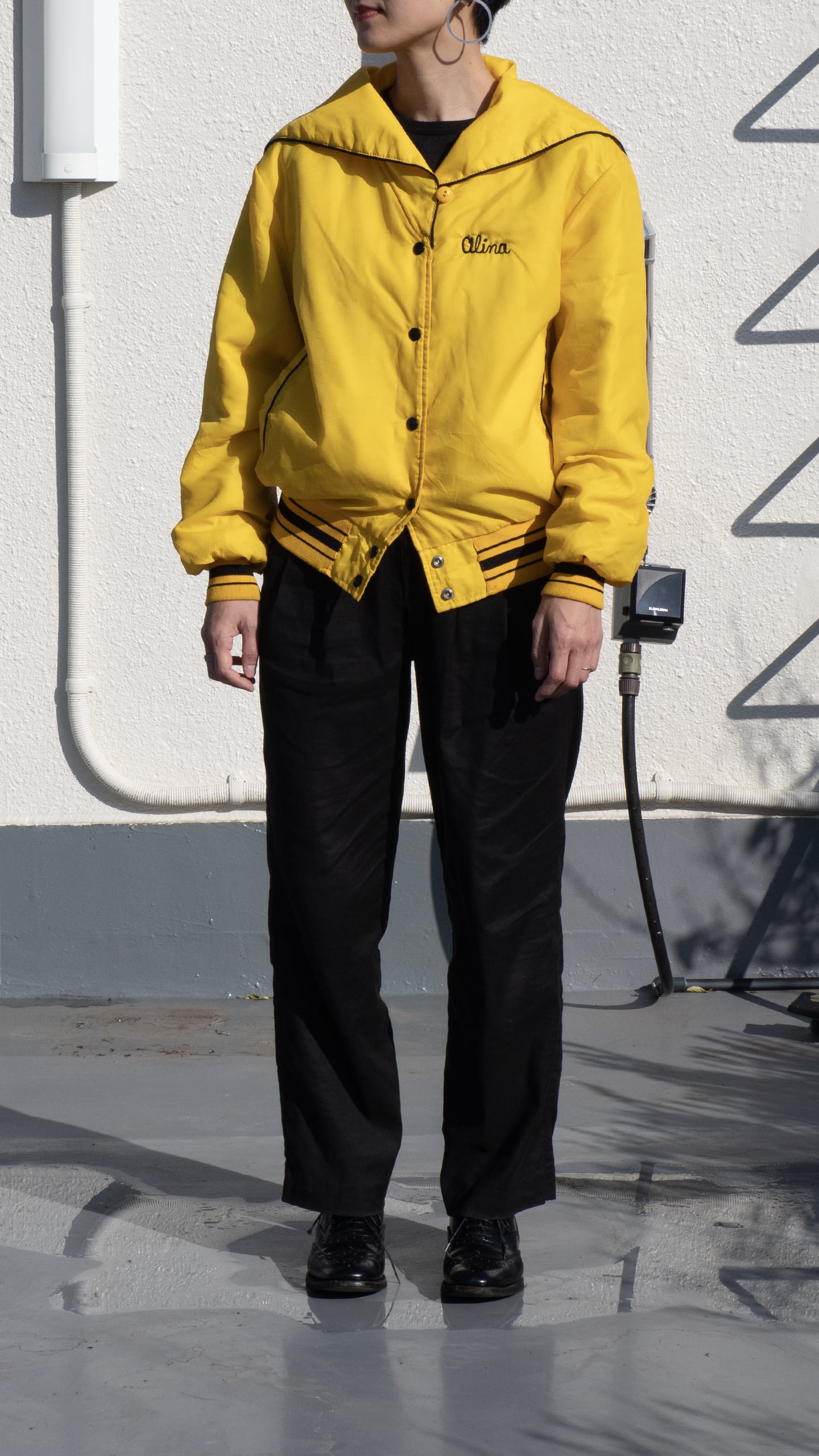 イエローとブラックの配色、セーラー襟、パイピングのブラック、リブのボーダーピッチ、チェーンステッチのネーム刺繍、いずれもクールであり凝った仕様です。