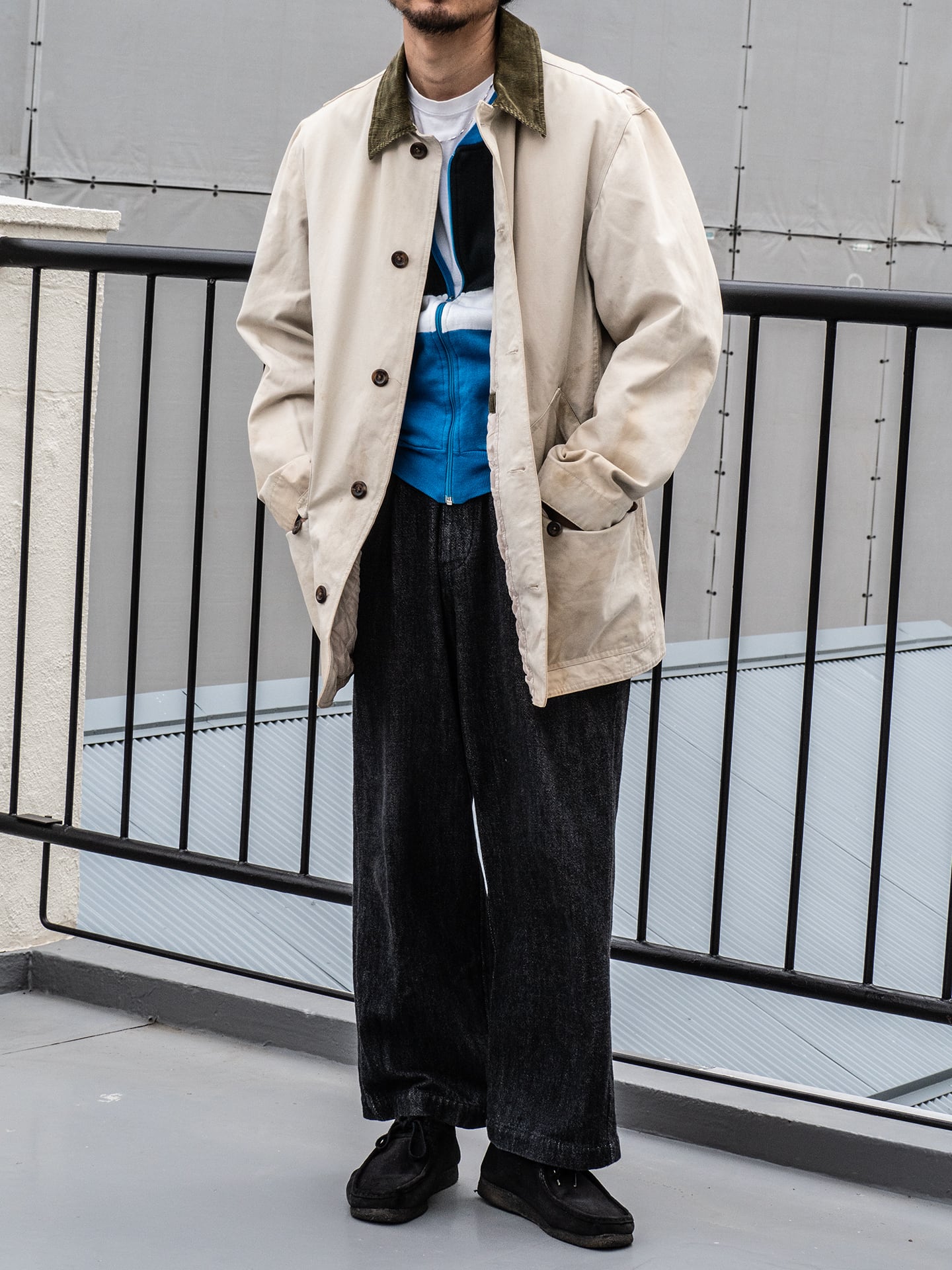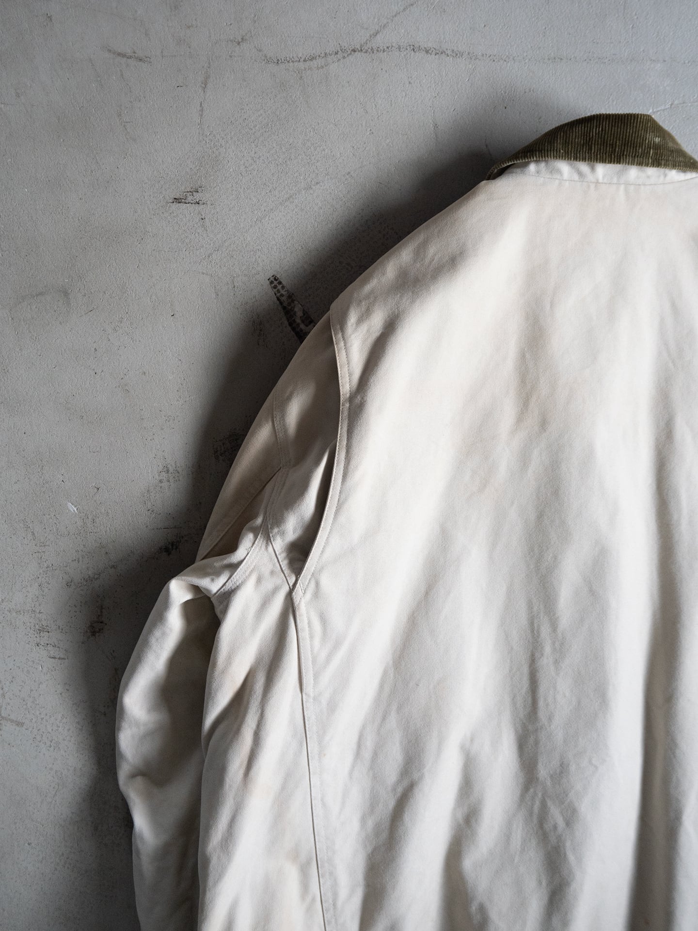 ハンドウォームポケット(腰上部)口には、肌あたりを良くすることを目的にコーデュロイを当てたり、下側のポケット口には二段に分けてカンヌキ縫製を施し、表からは見えないところにまで、使い手を補助する仕様が落とし込まれていて感銘します。