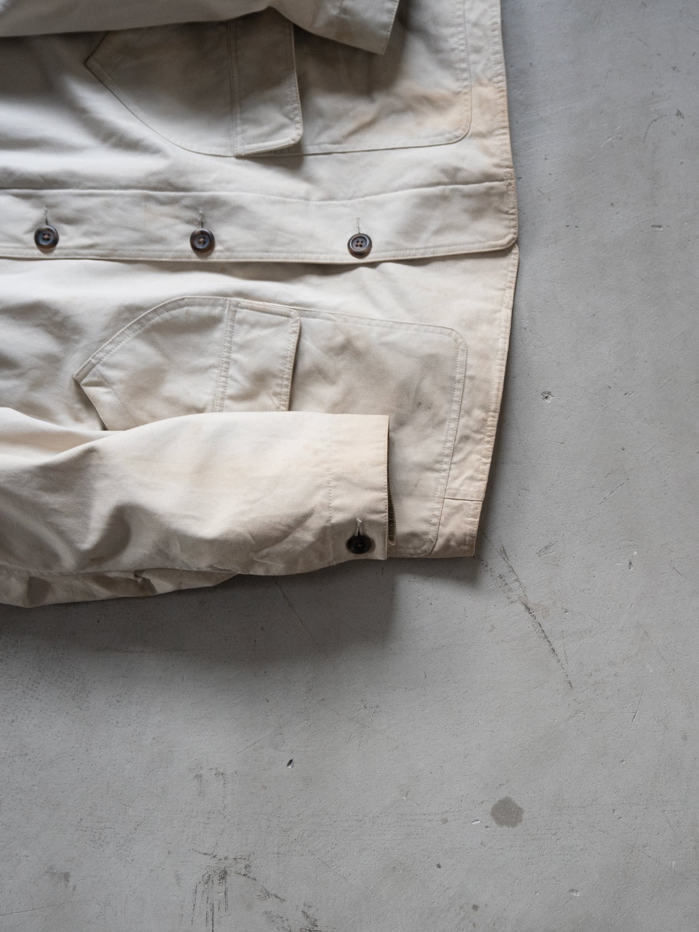 このモデルは、2000年前後の生産されたモデルと見られ、二段式上部のフラップ直通のポケット仕様を、ポケットとフラップ各々で縫製している点以外は、オーセンティックなハンティングジャケットに忠実に作られています。