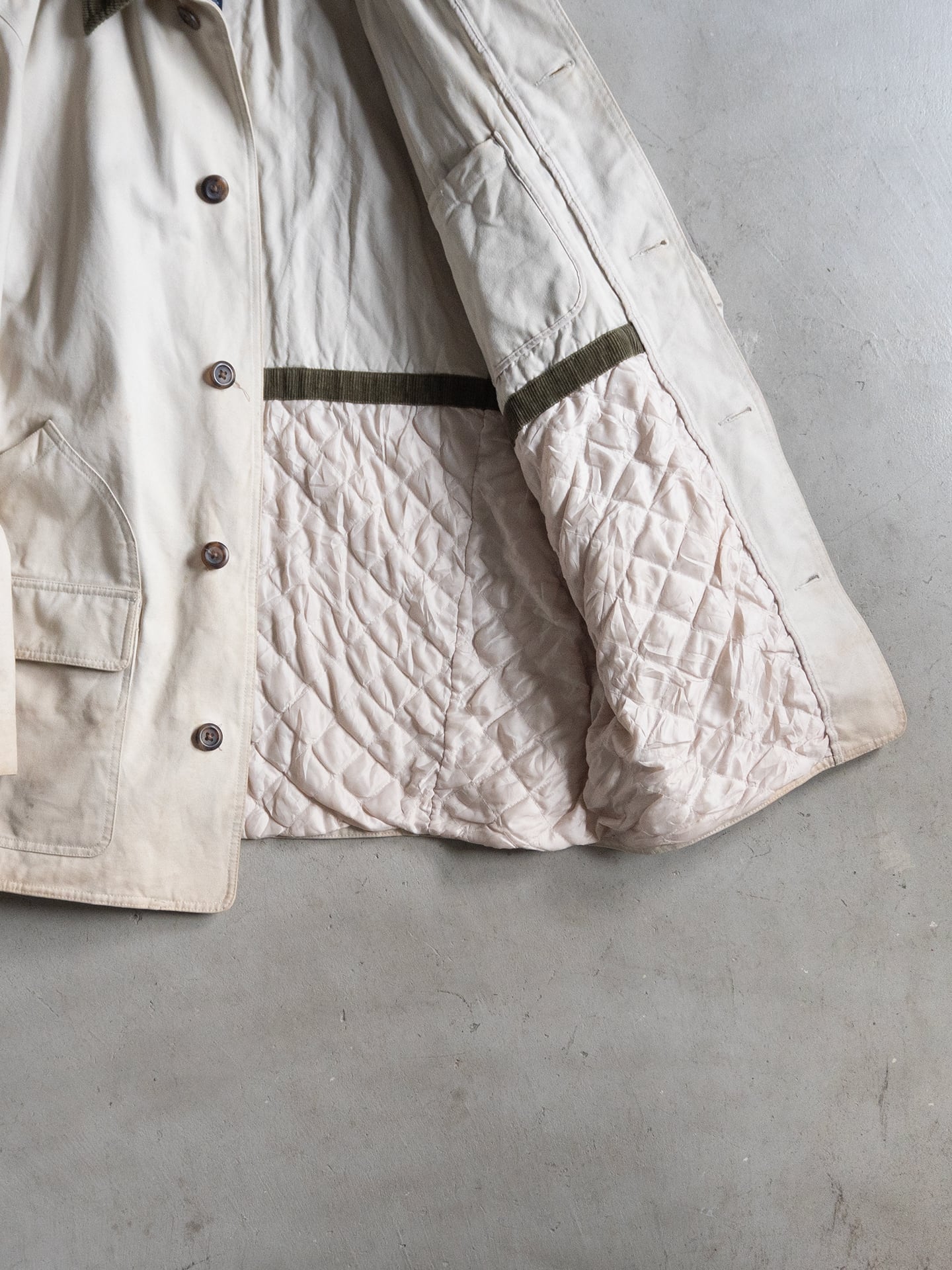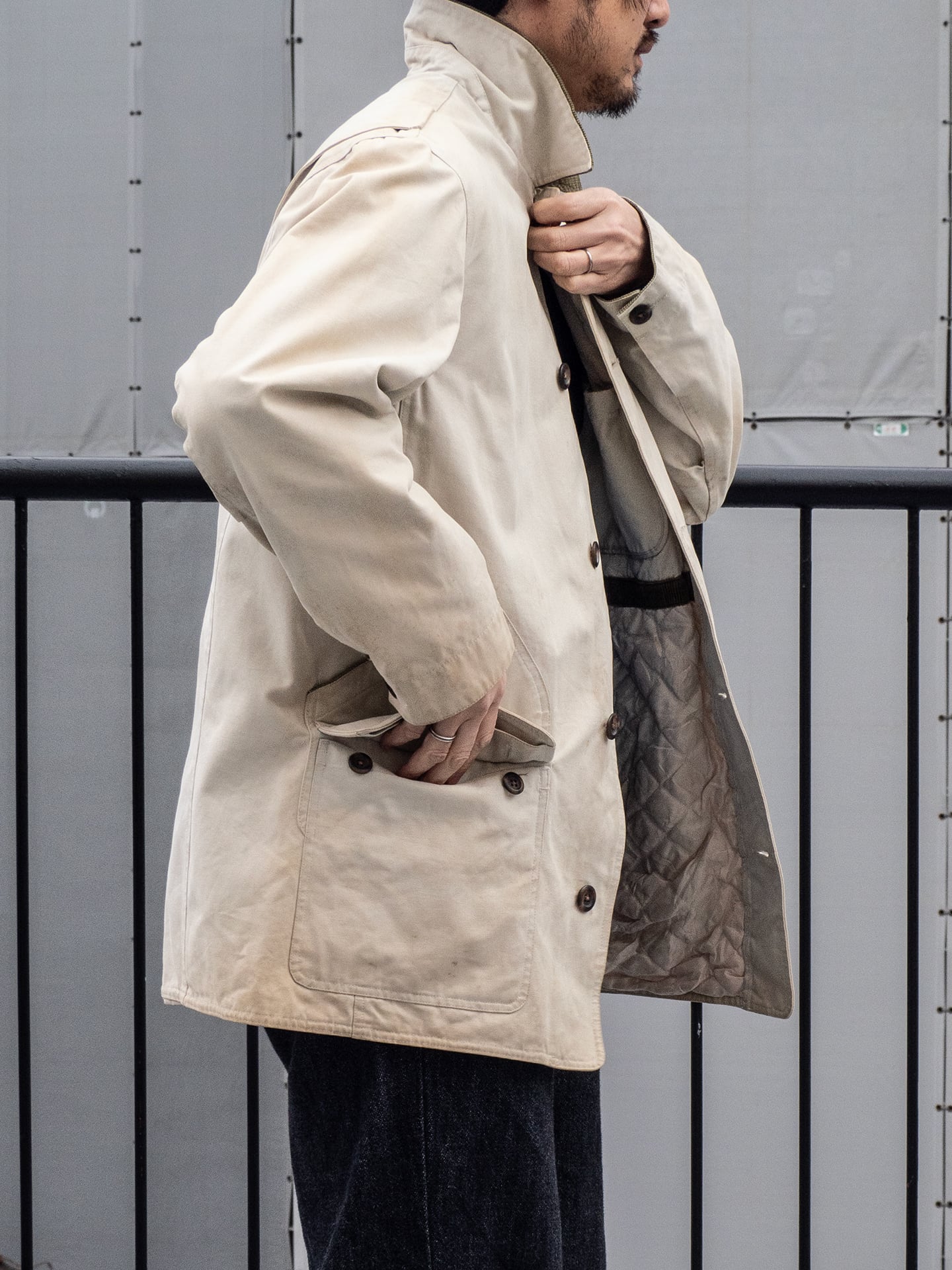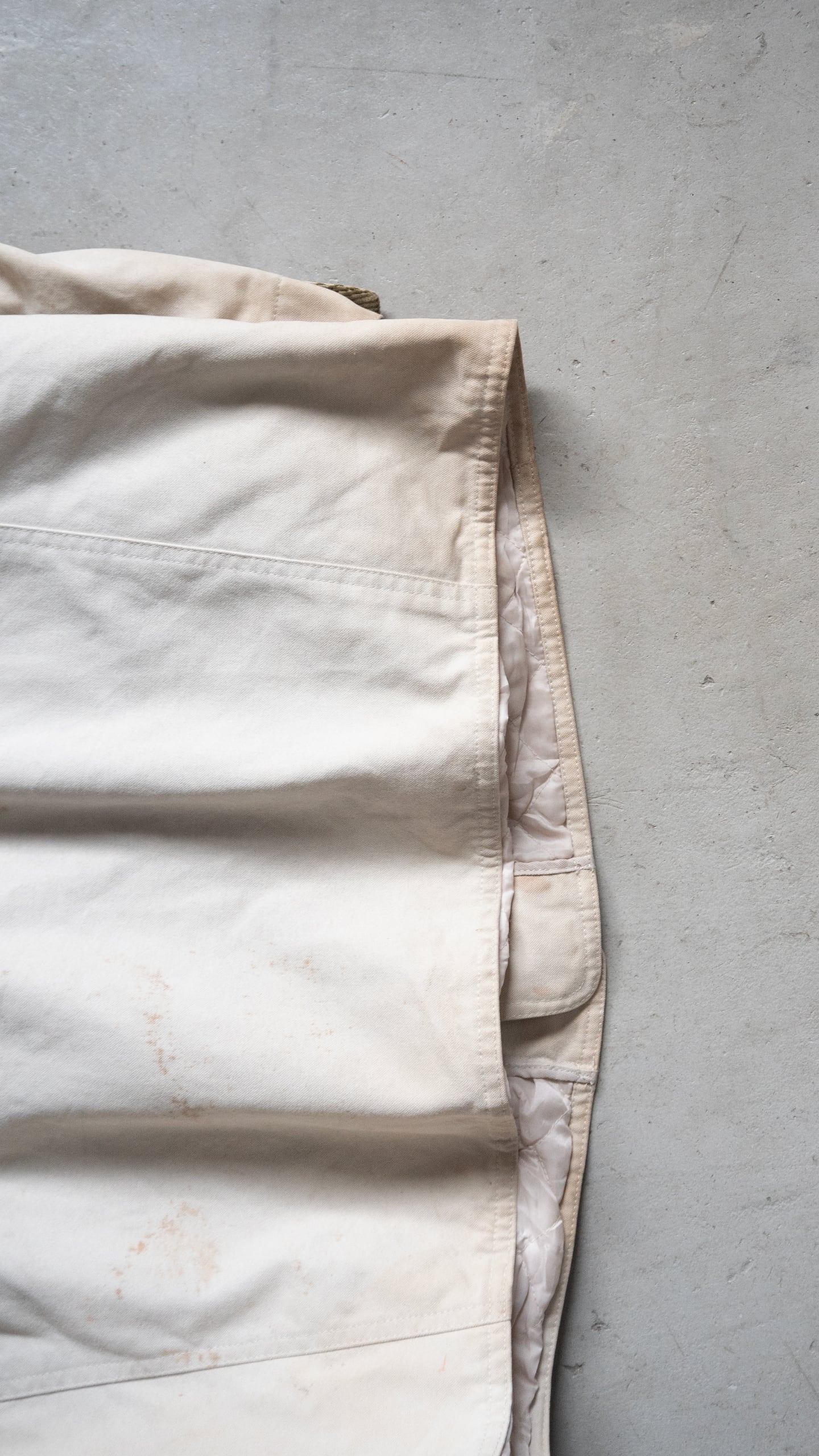 裏は、腰あたりから下部分に中綿入りのキルト裏地を施しており、寒冷時期での着用も可能。