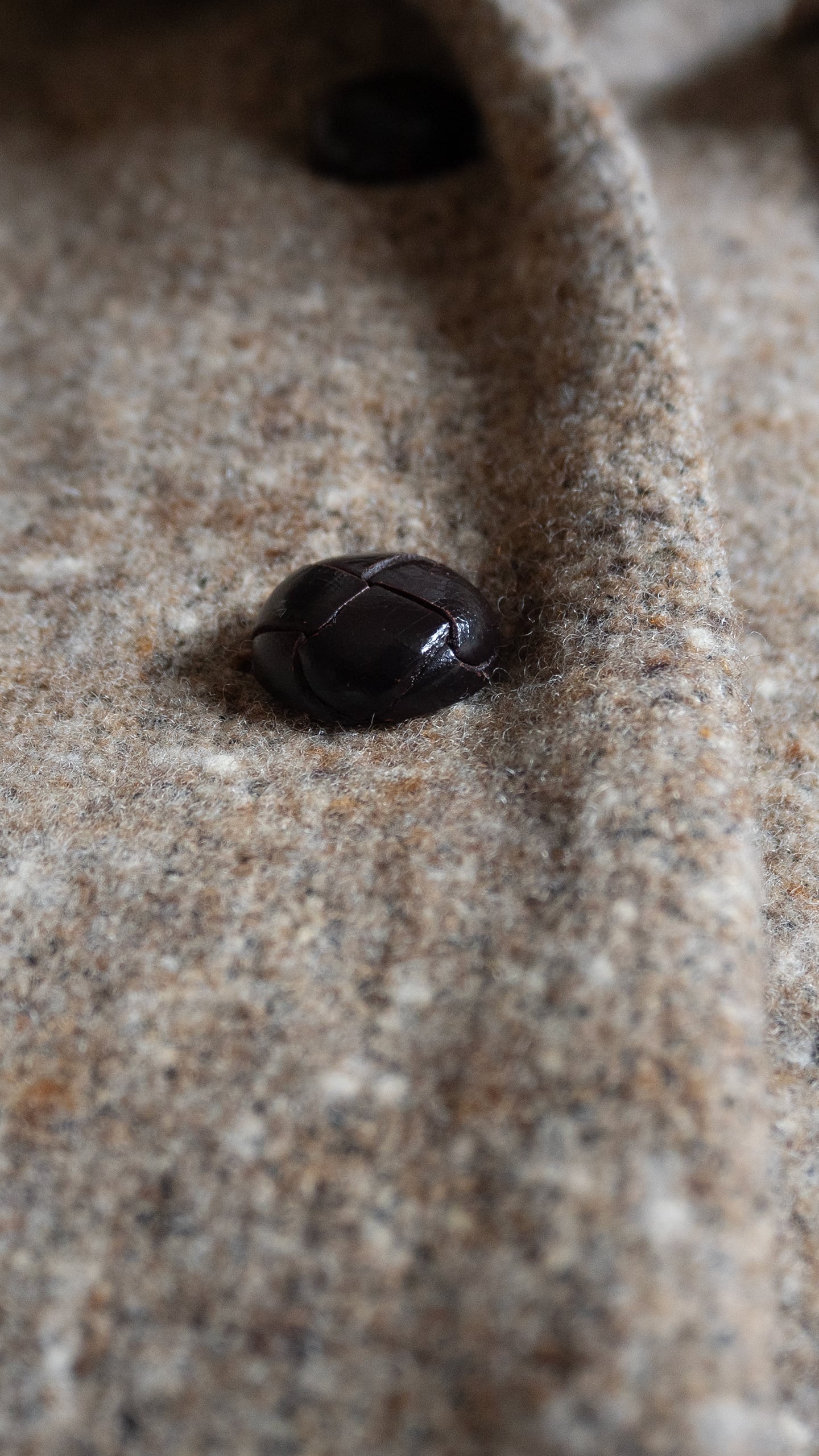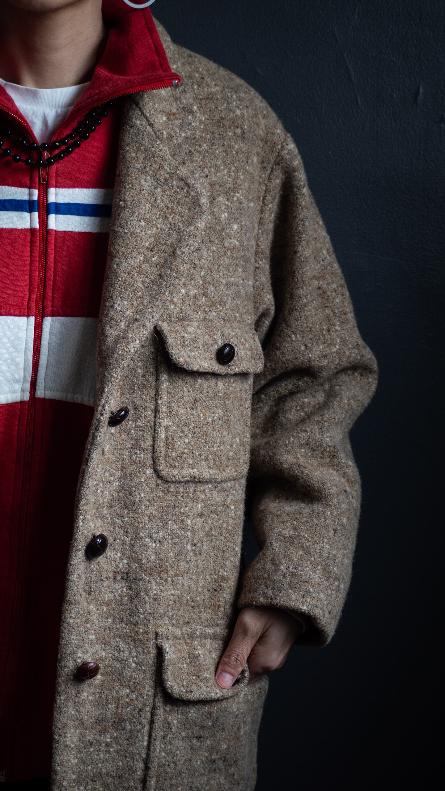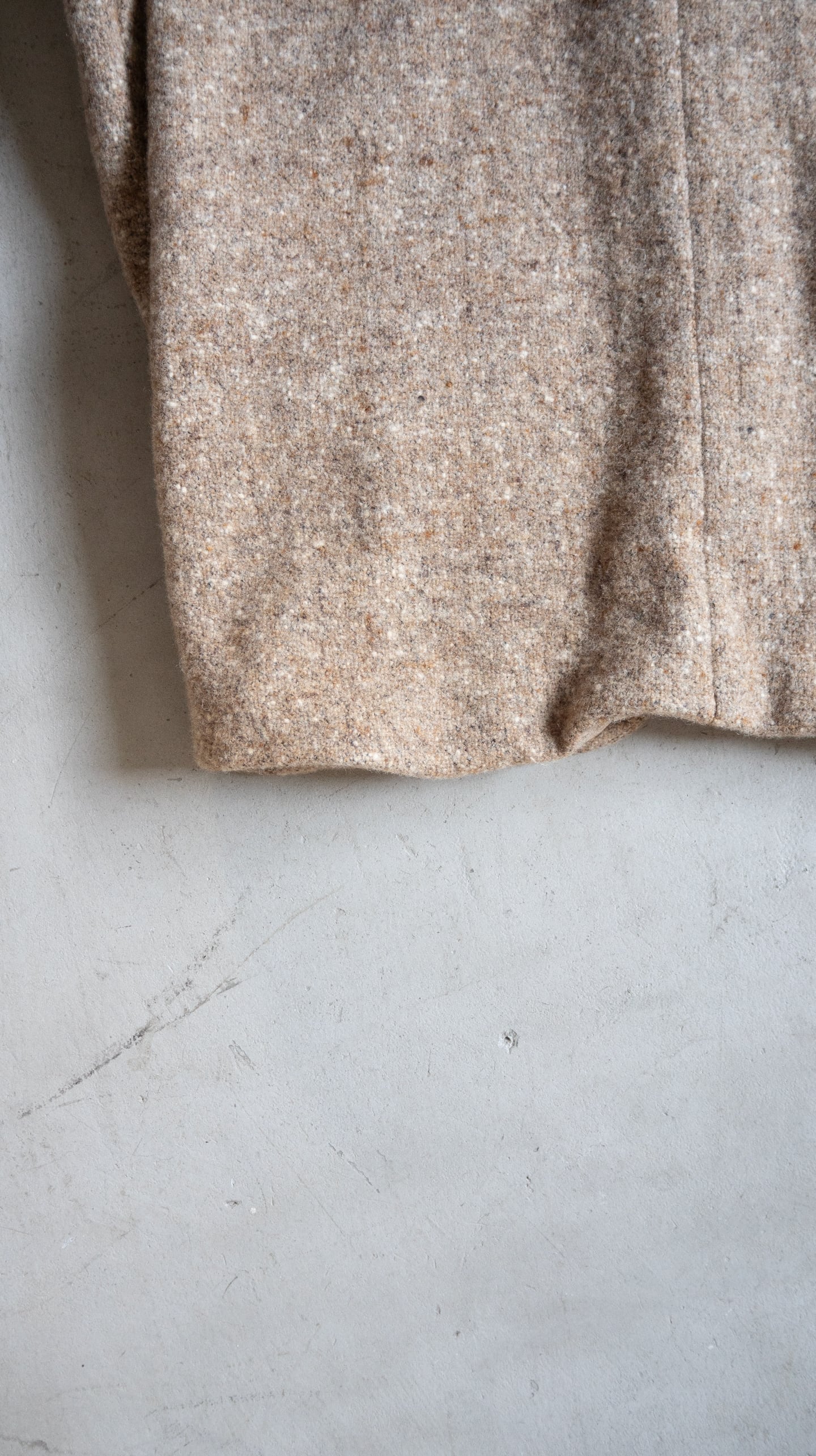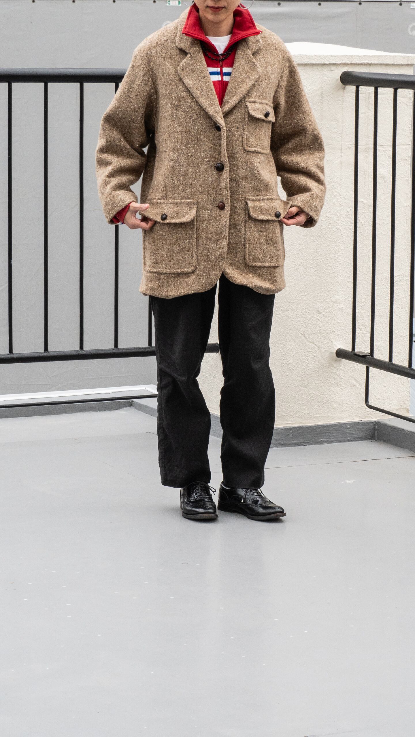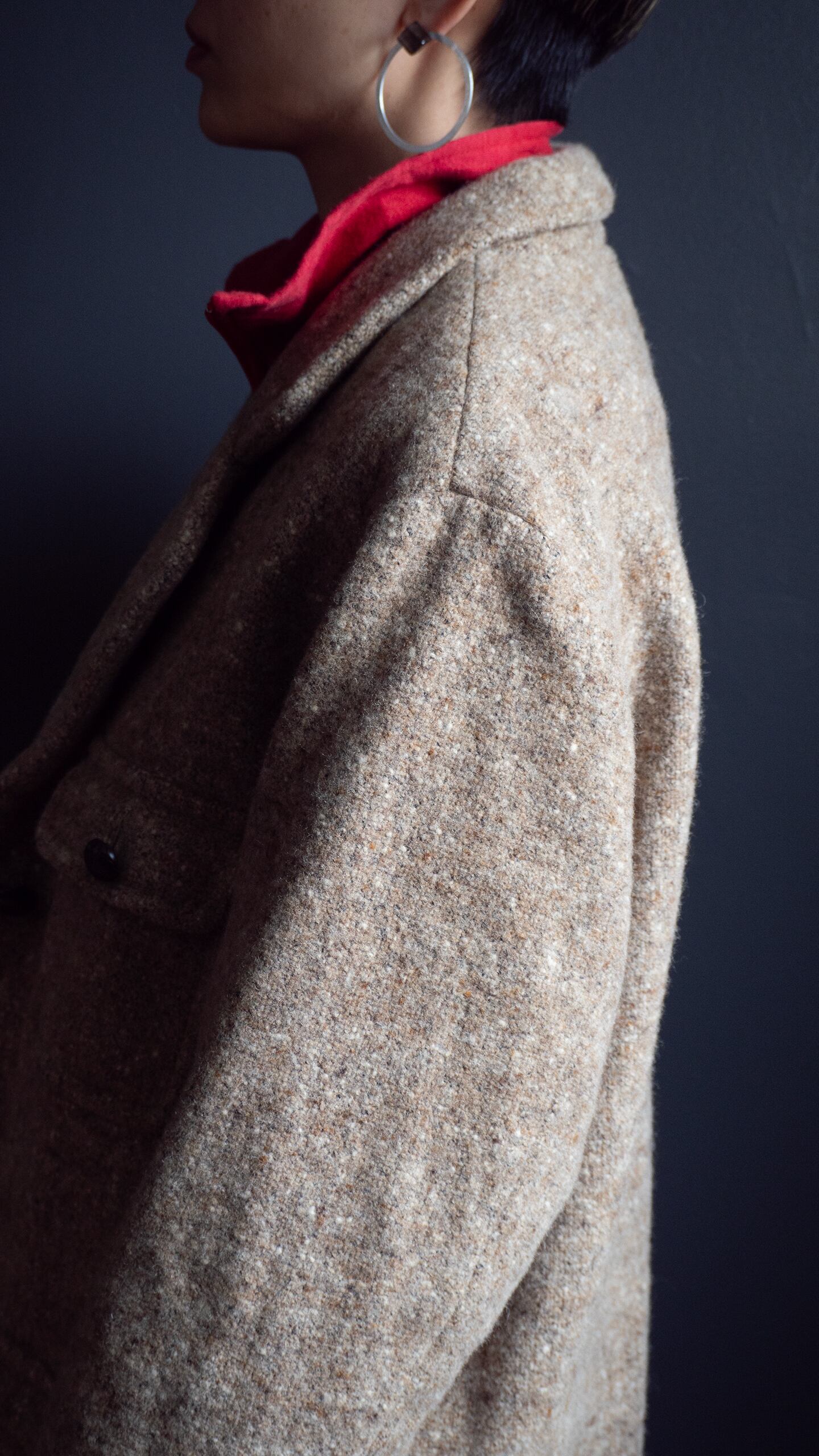 分厚い生地で仕立てられているため、衿端やポケット角、裾も全体的に丸みを帯びていて、シャープさのない緩いテンションを感じる一着です。