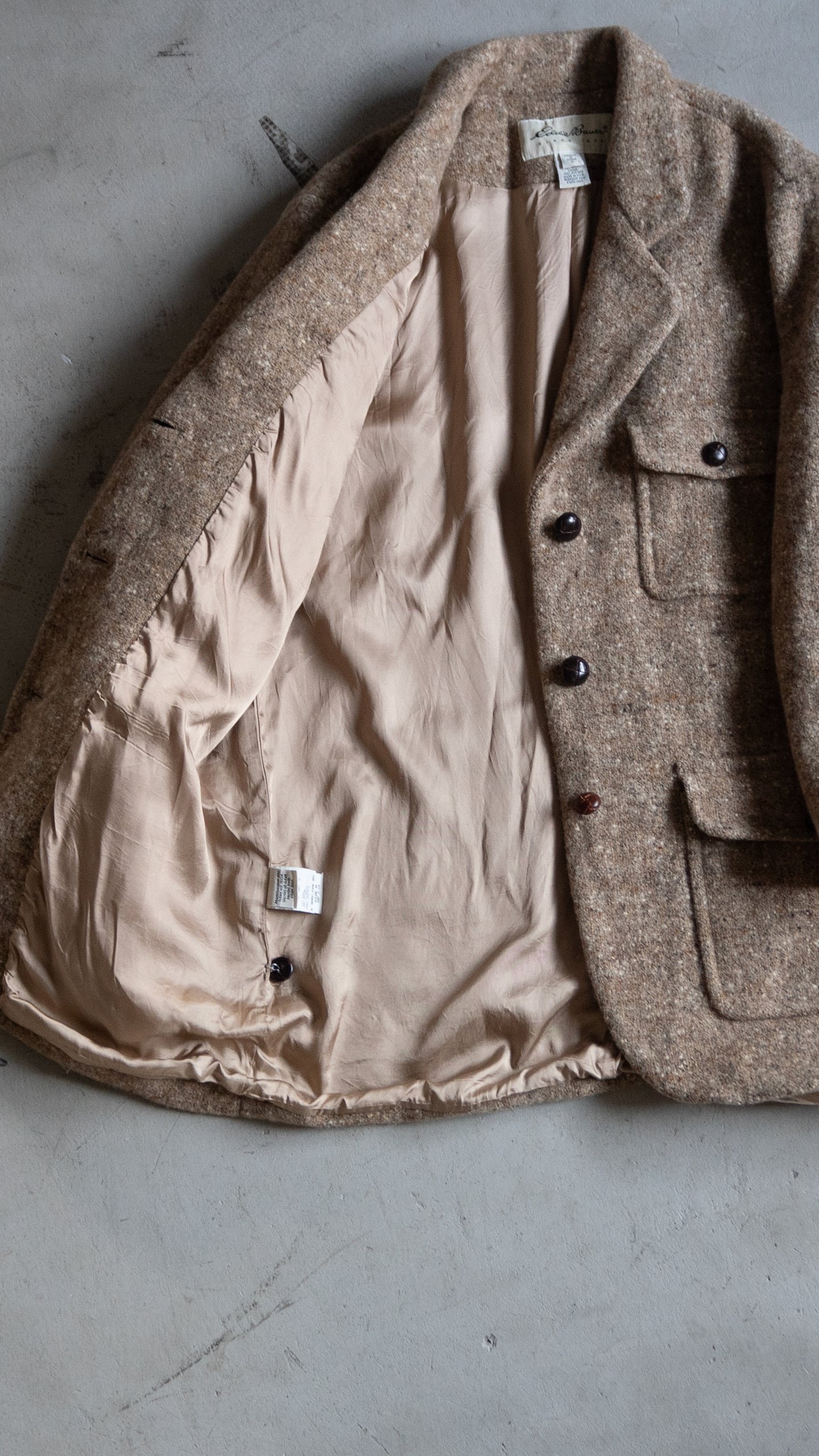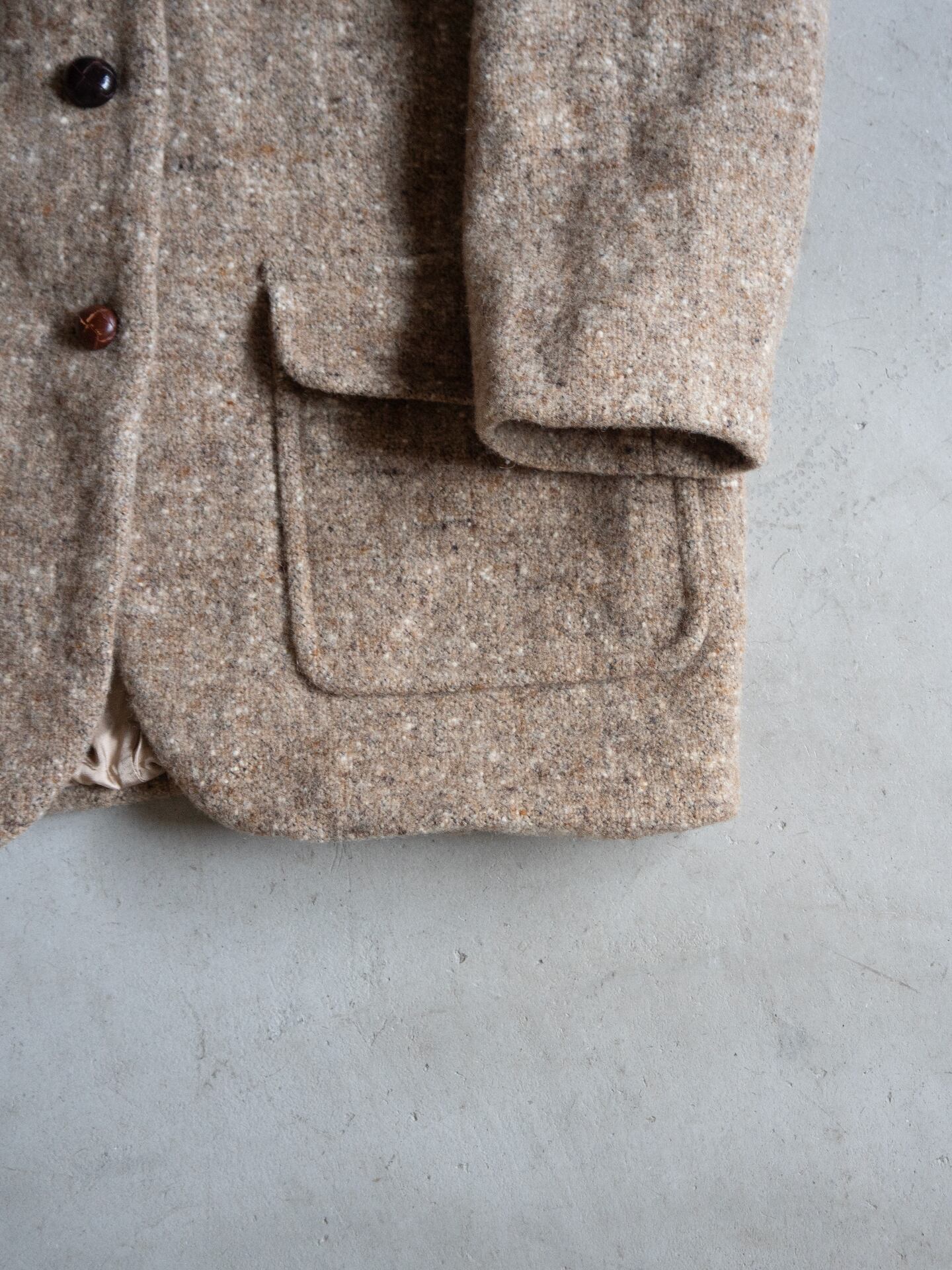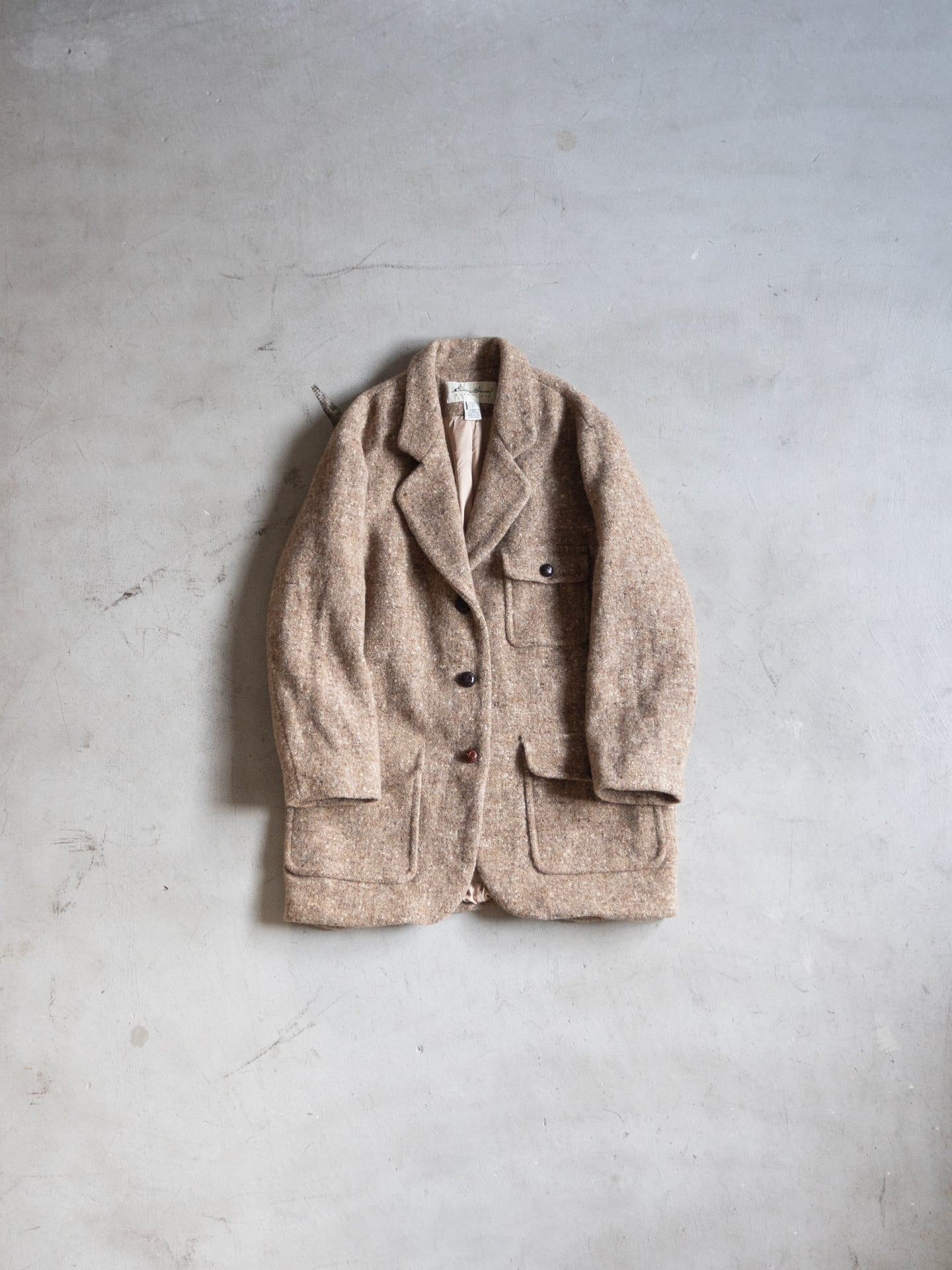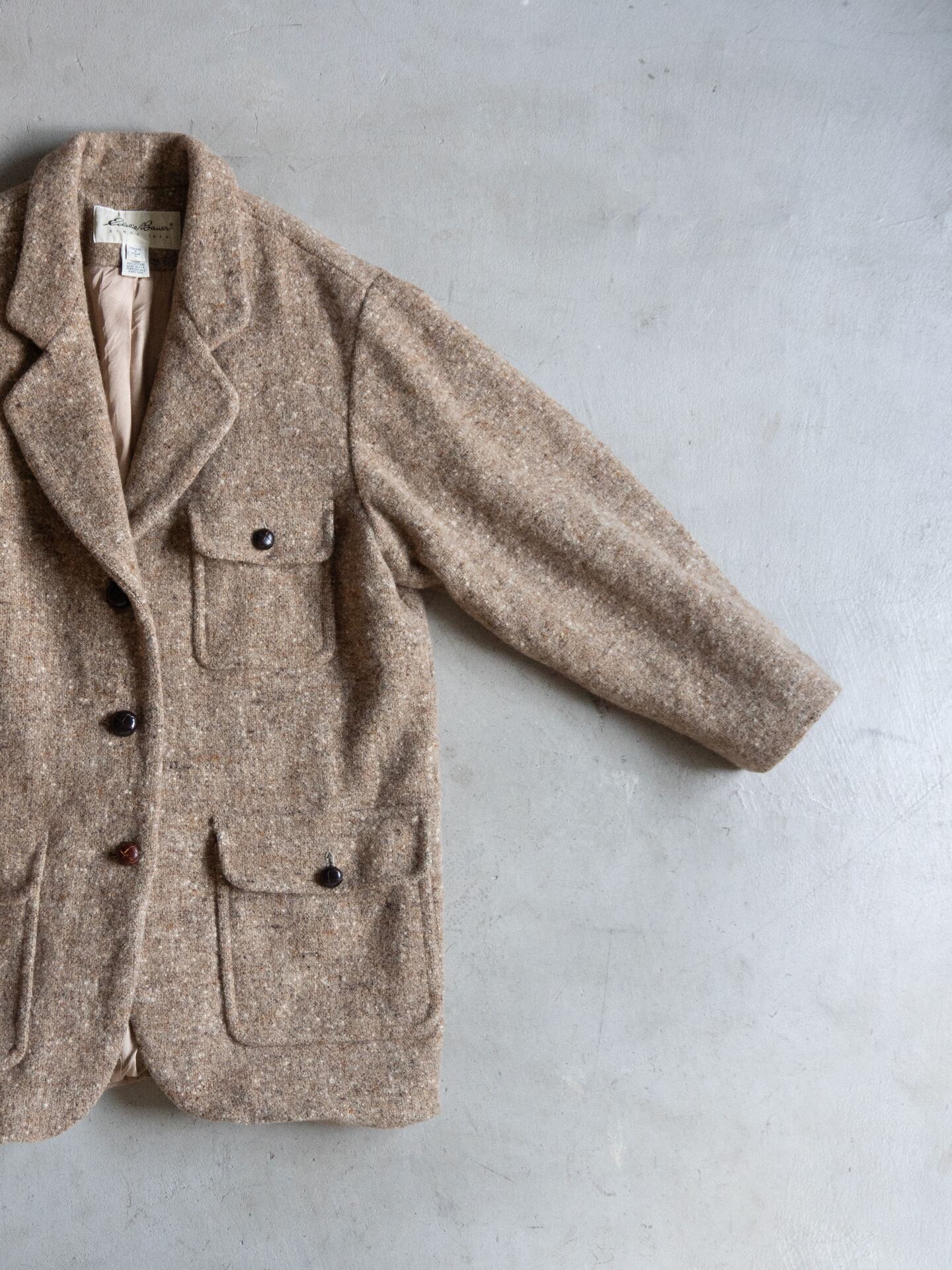 ふっくらと嵩高なウール74%ナイロン26%のツイードを用いた、Eddie Bauer(エディーバウワー)のラペルジャケットです。