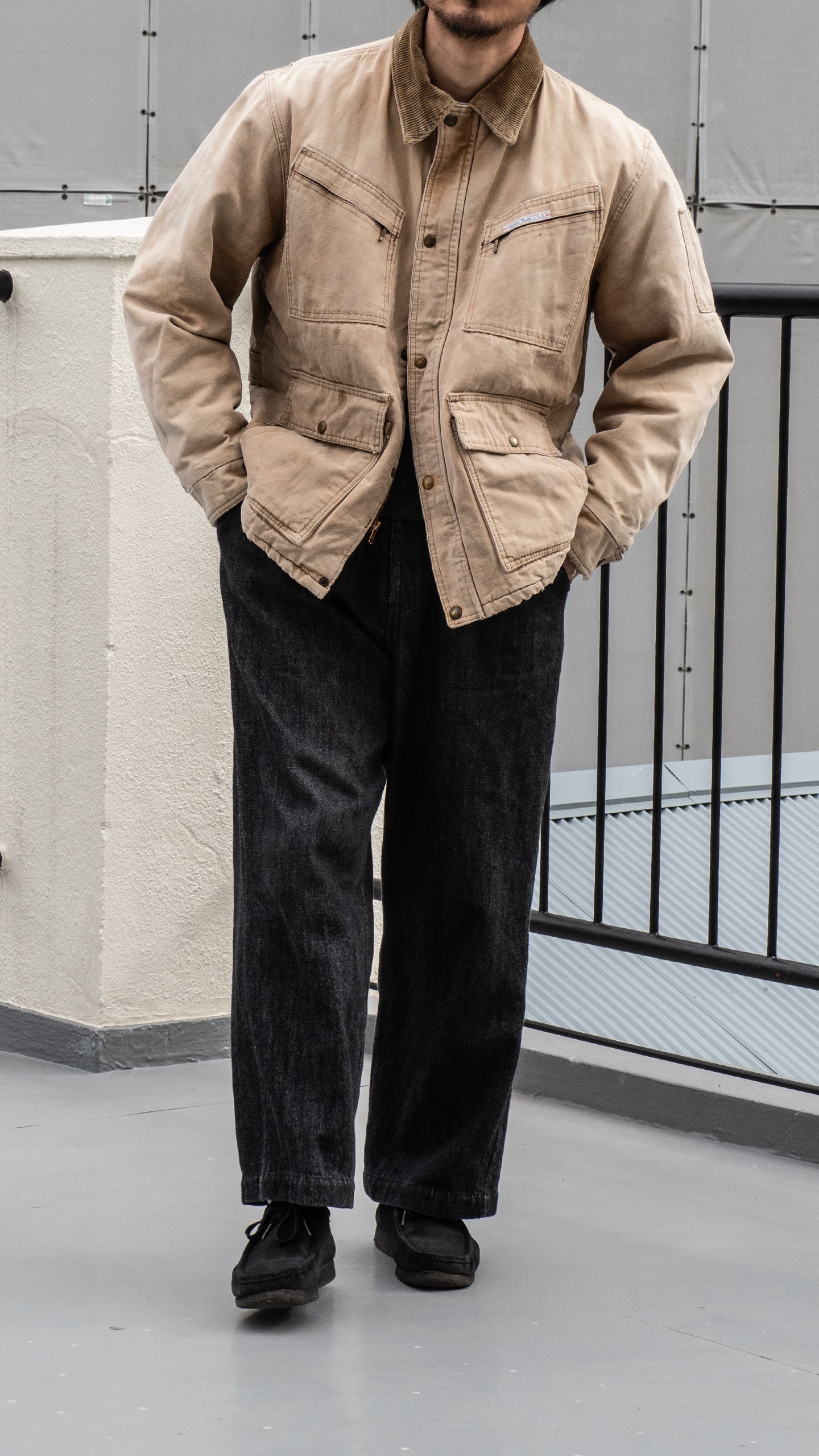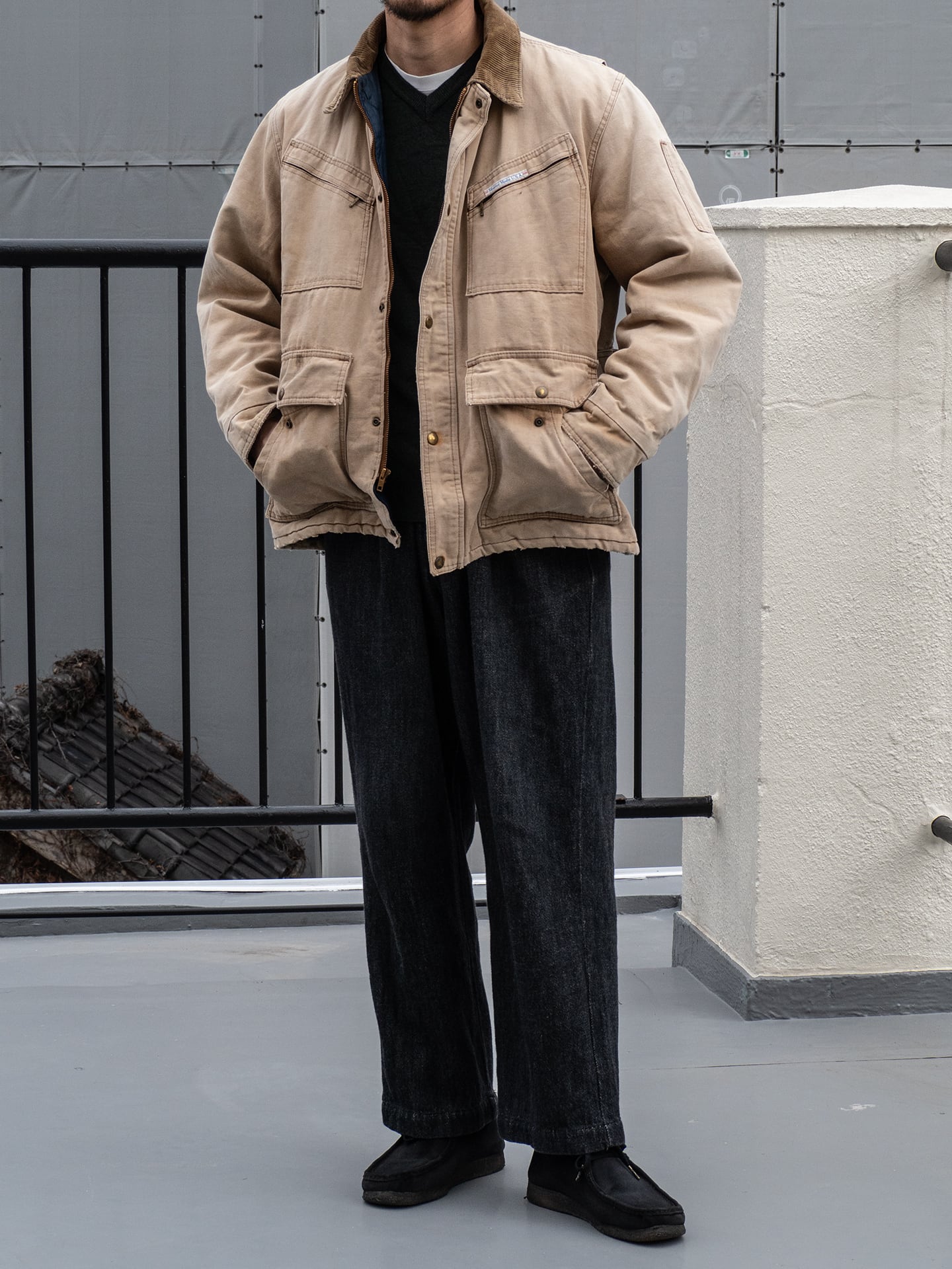 2本取りの太番手経糸で織られた昔ながらなヘビーダックをメインに、衿はコーデュロイ、裏地にはキルティングが施されています。