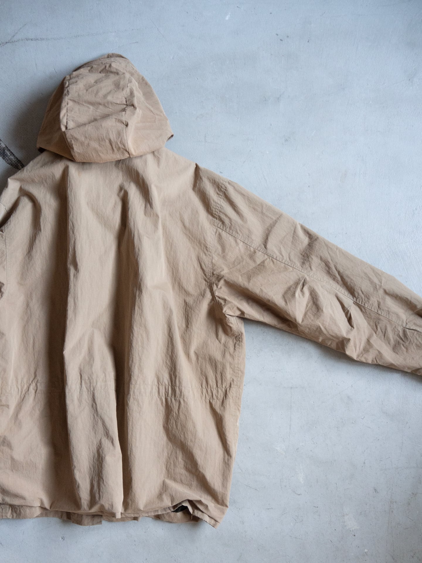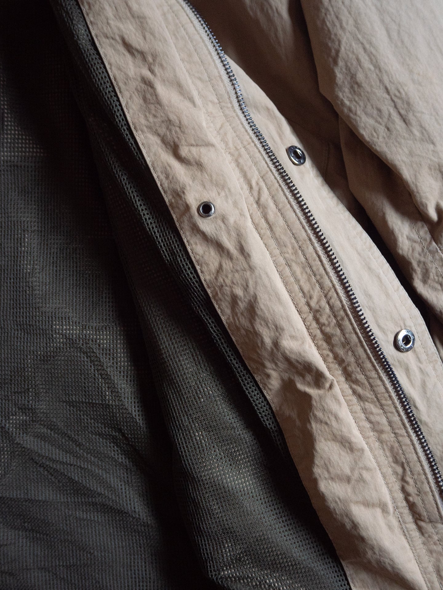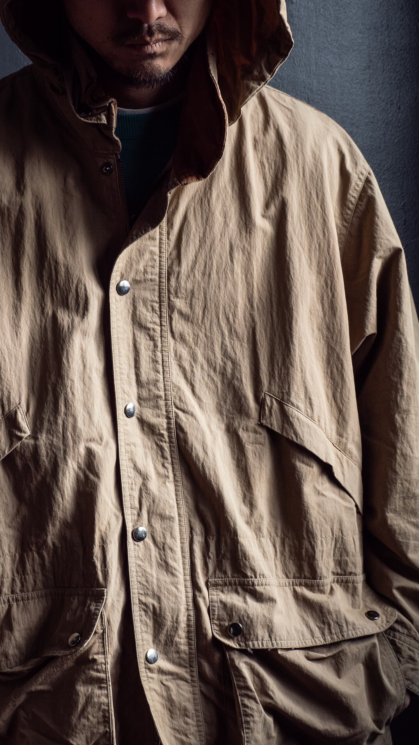 生地感は前述の通り。また着用時の横張り具合と落ち具合のバランスもとても良く、見た目ほど重さを感じないアウターウェアです。
