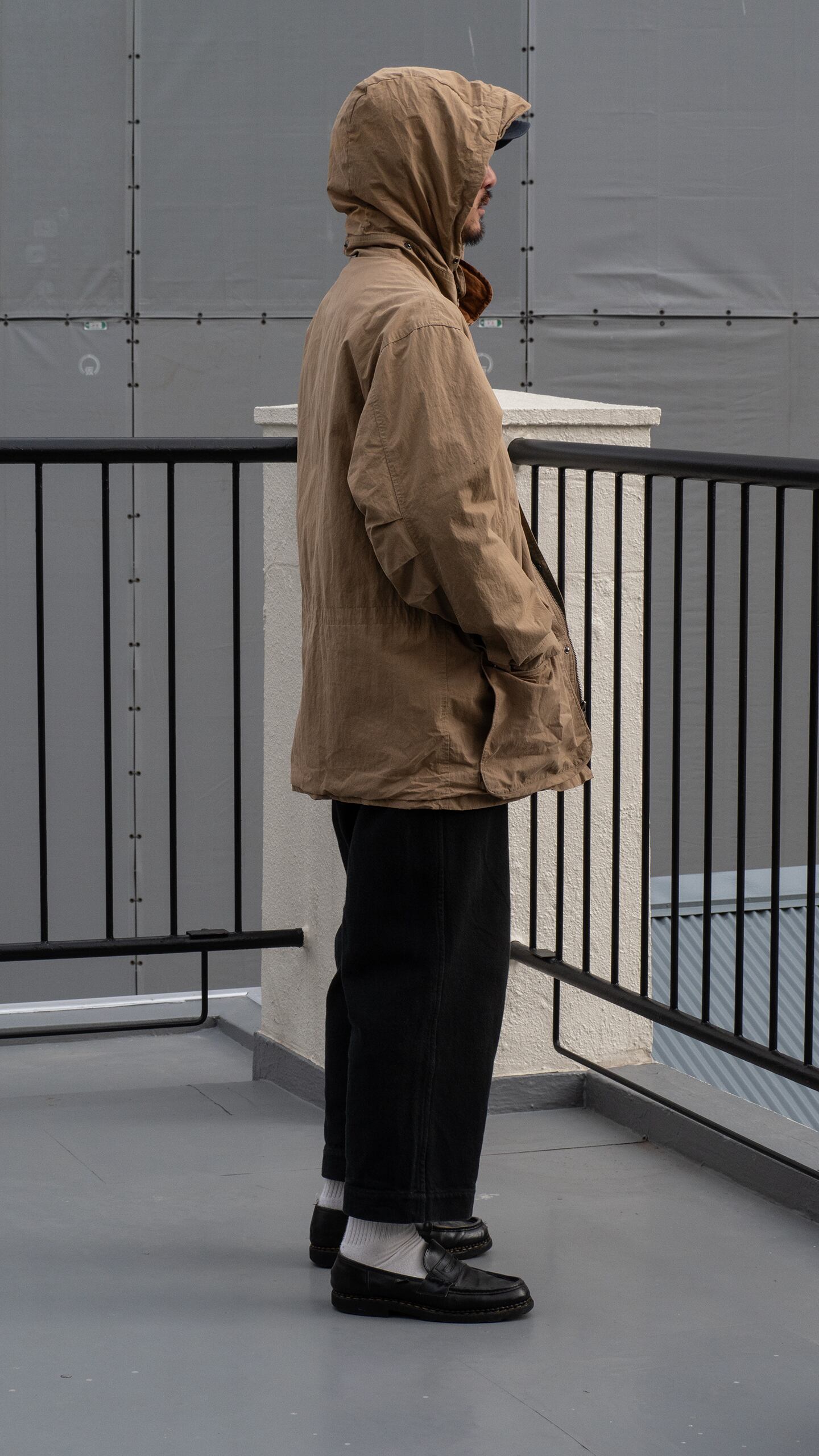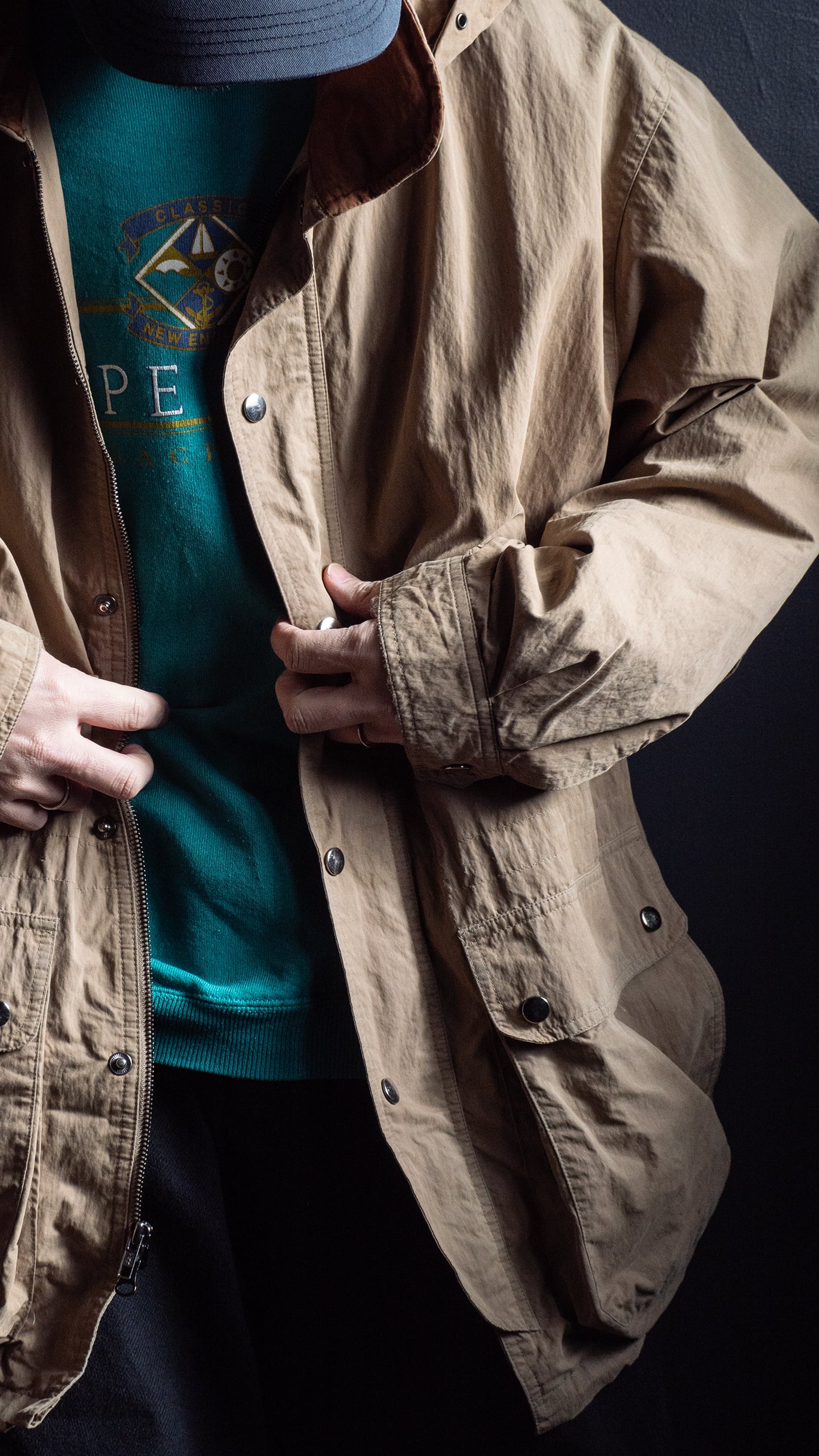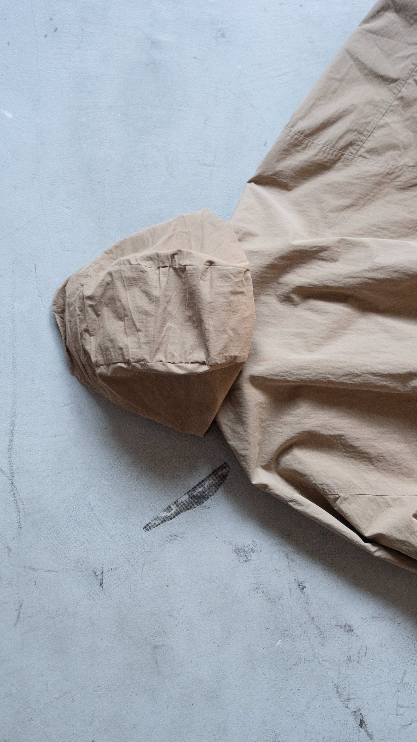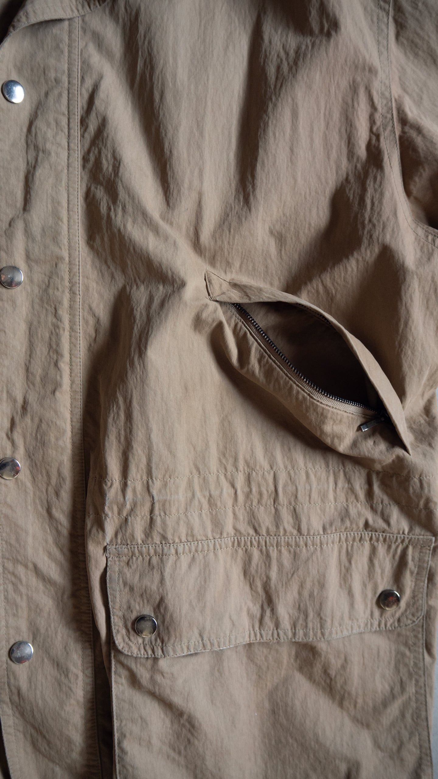 生地感は前述の通り。また着用時の横張り具合と落ち具合のバランスもとても良く、見た目ほど重さを感じないアウターウェアです。