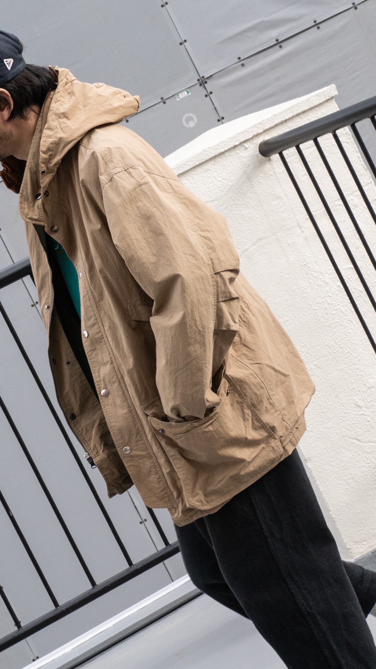 フーディはスタンド衿内部に仕舞うことができ、逆開式のジップ比翼フロントになります。