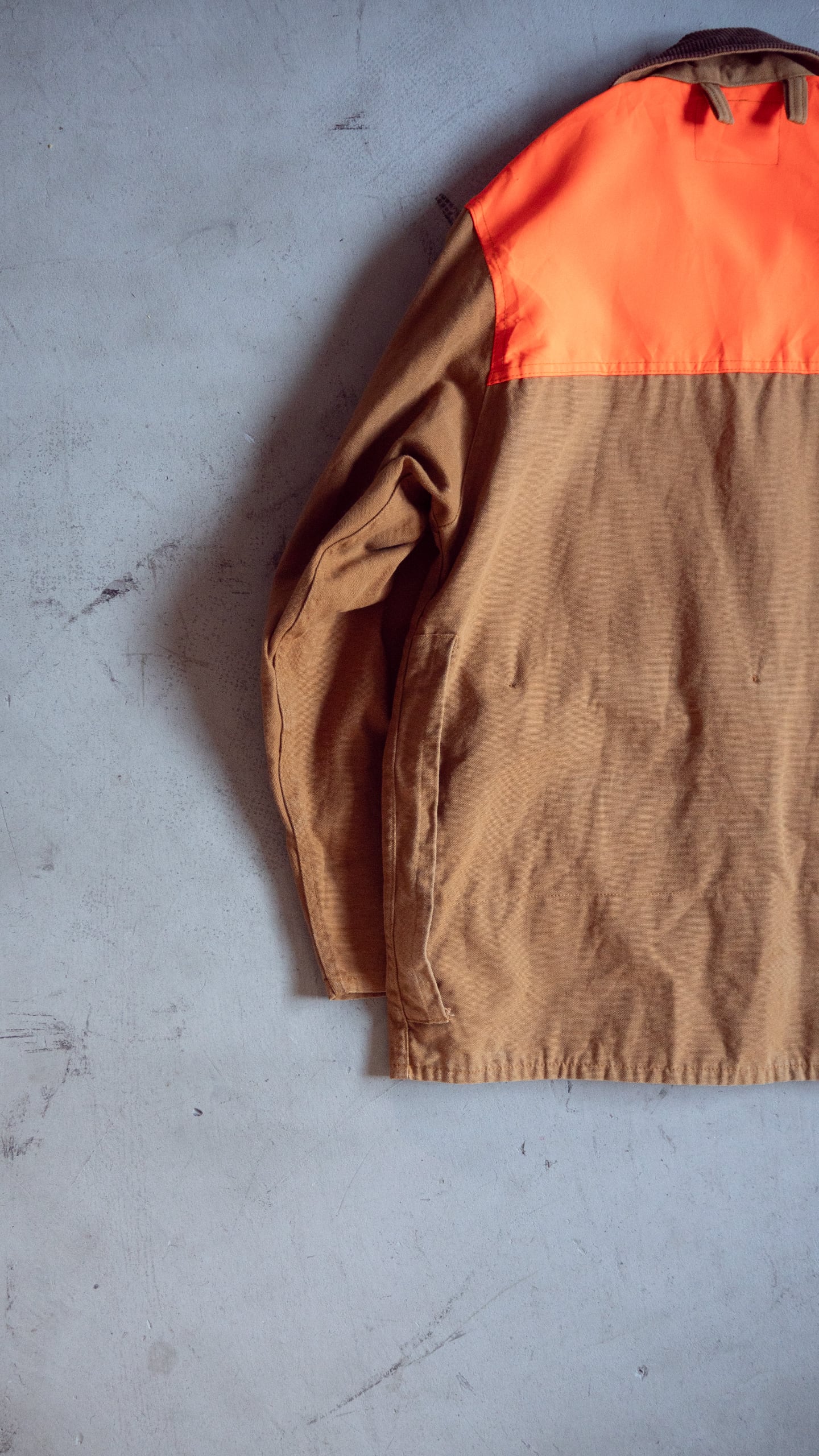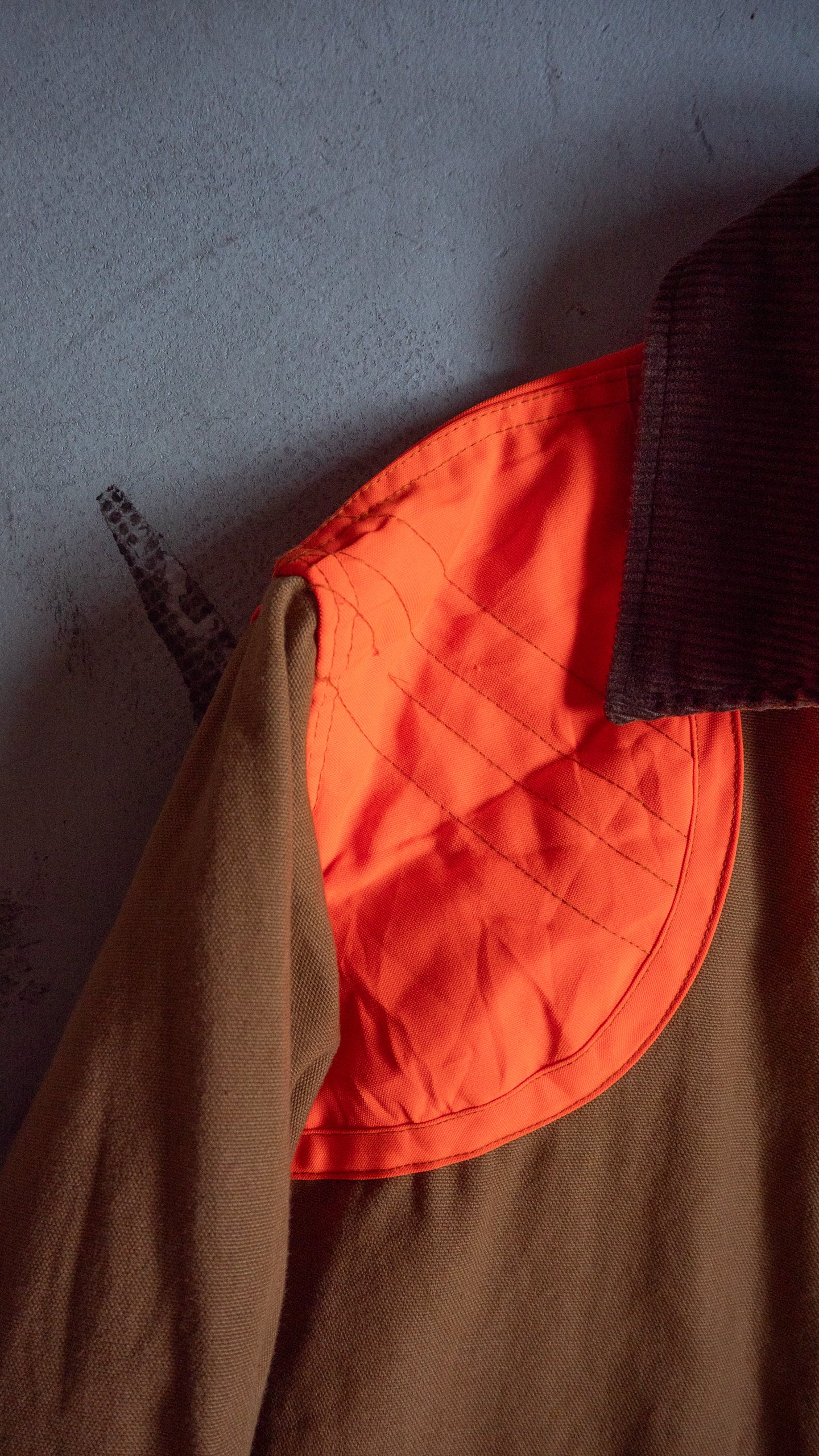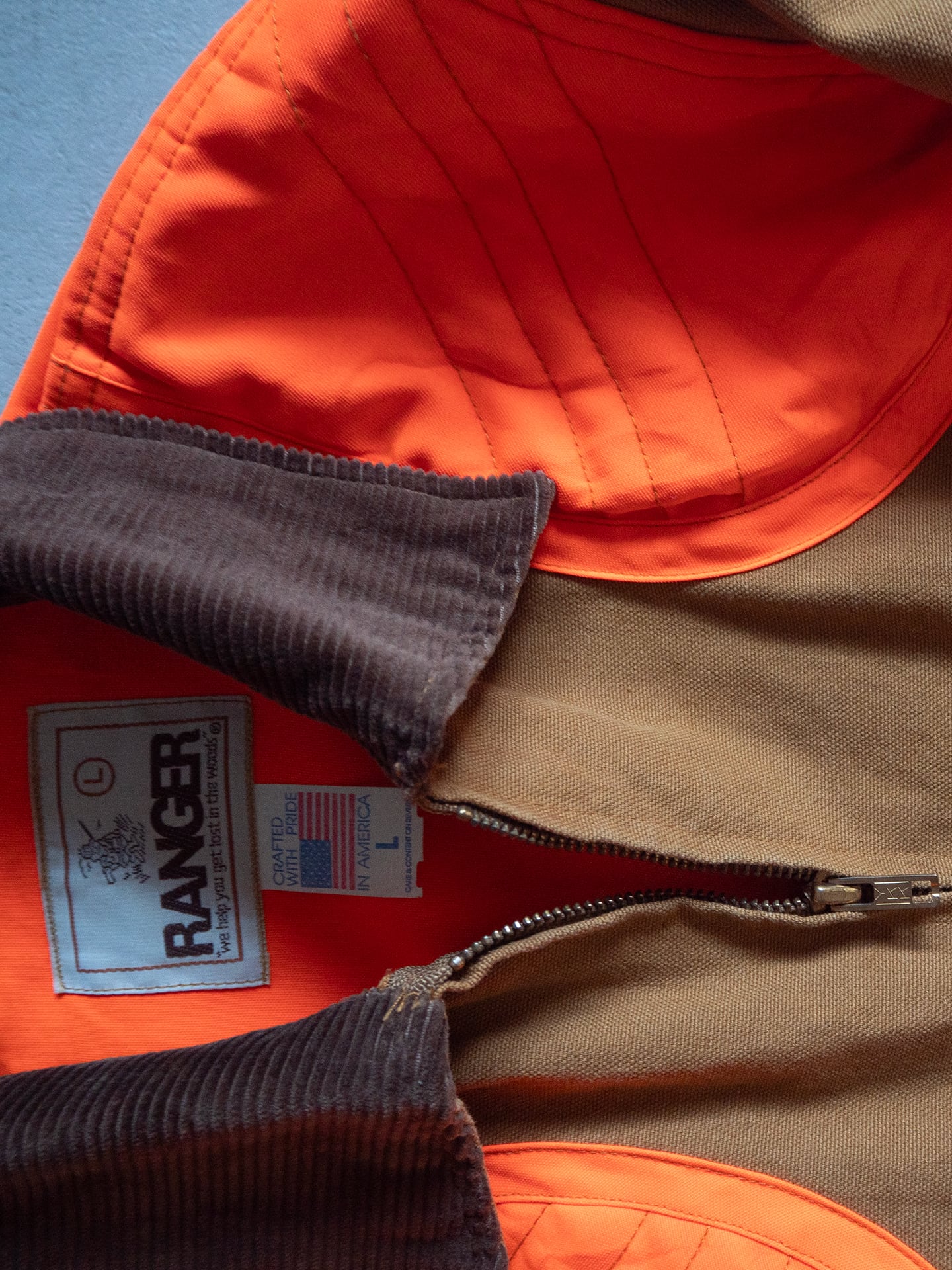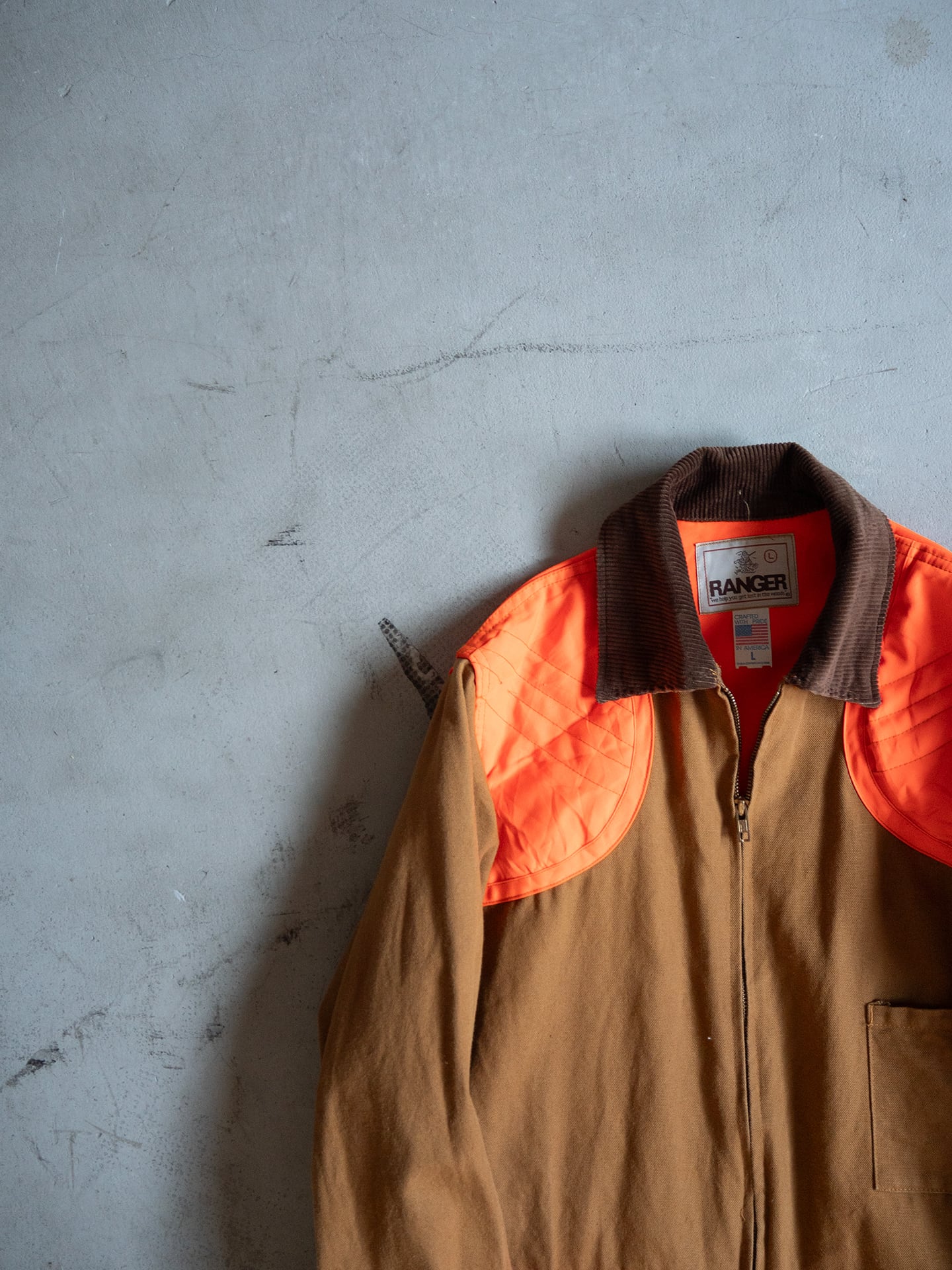 ブラウンダックに深茶色のコーデュロイ衿、そして発色の良いオレンジ色のリフレクトキャンバスを組み合わせた、90年代米国製RANGER(レンジャー)のハンティングジャケットです。