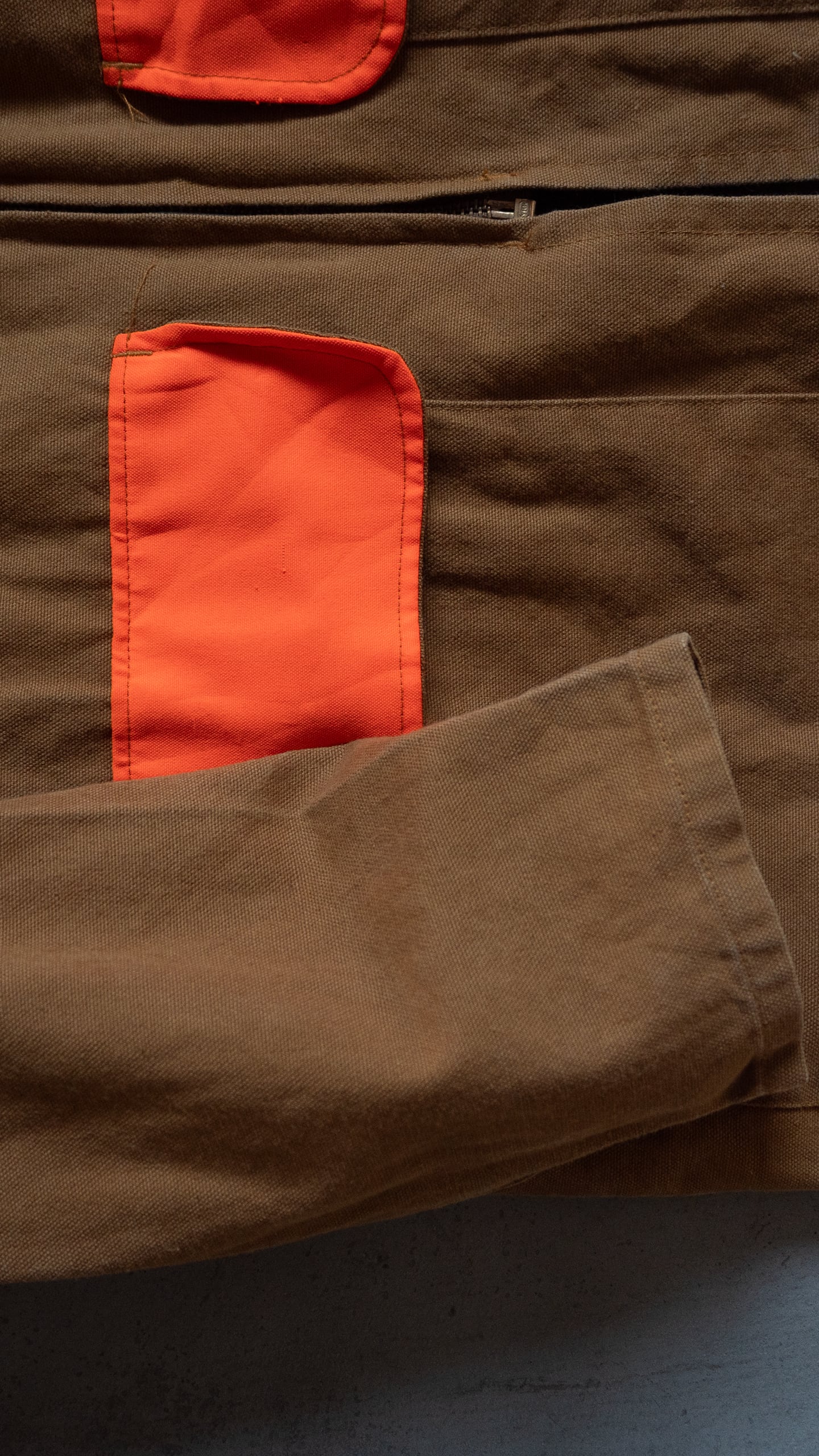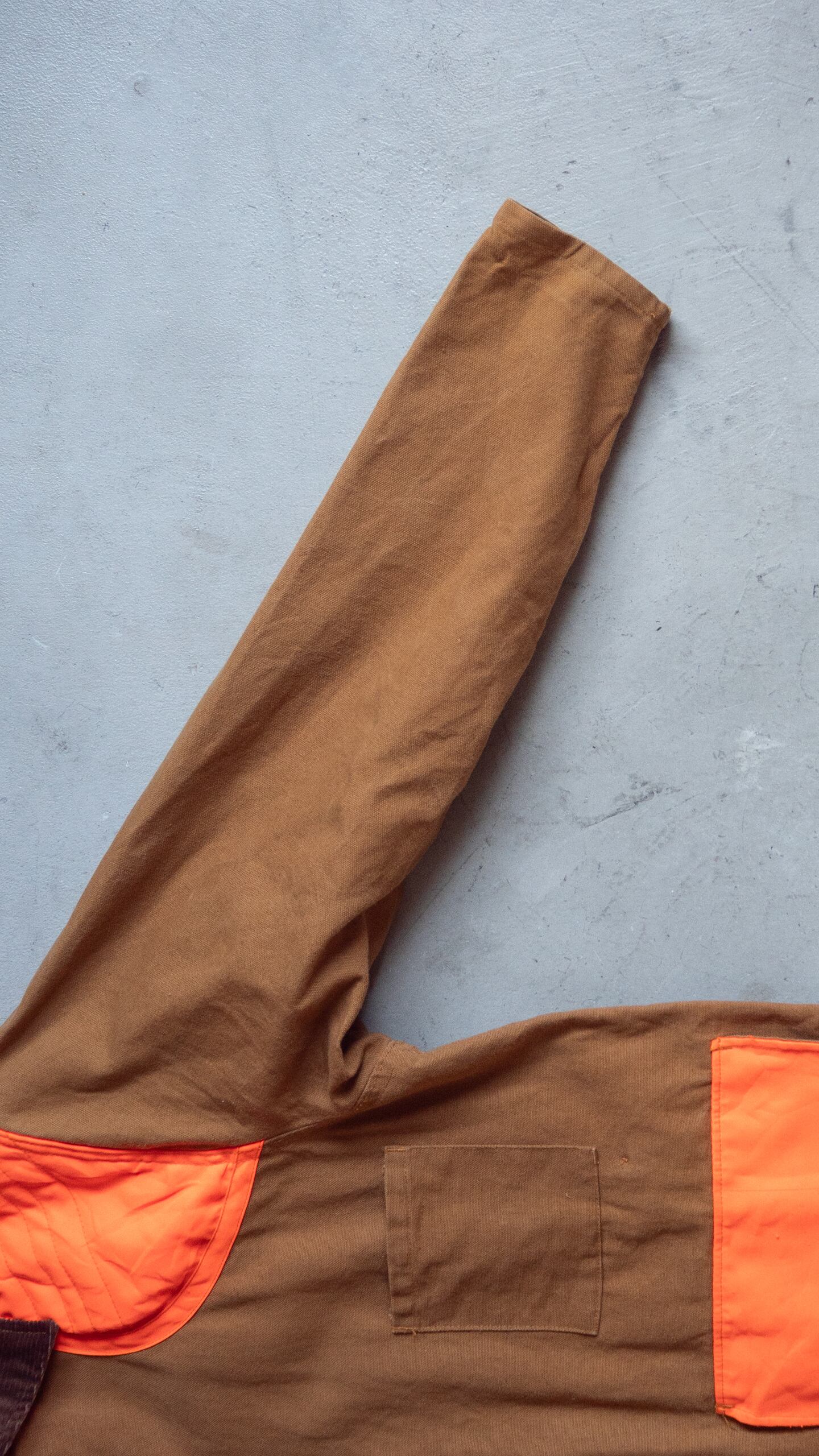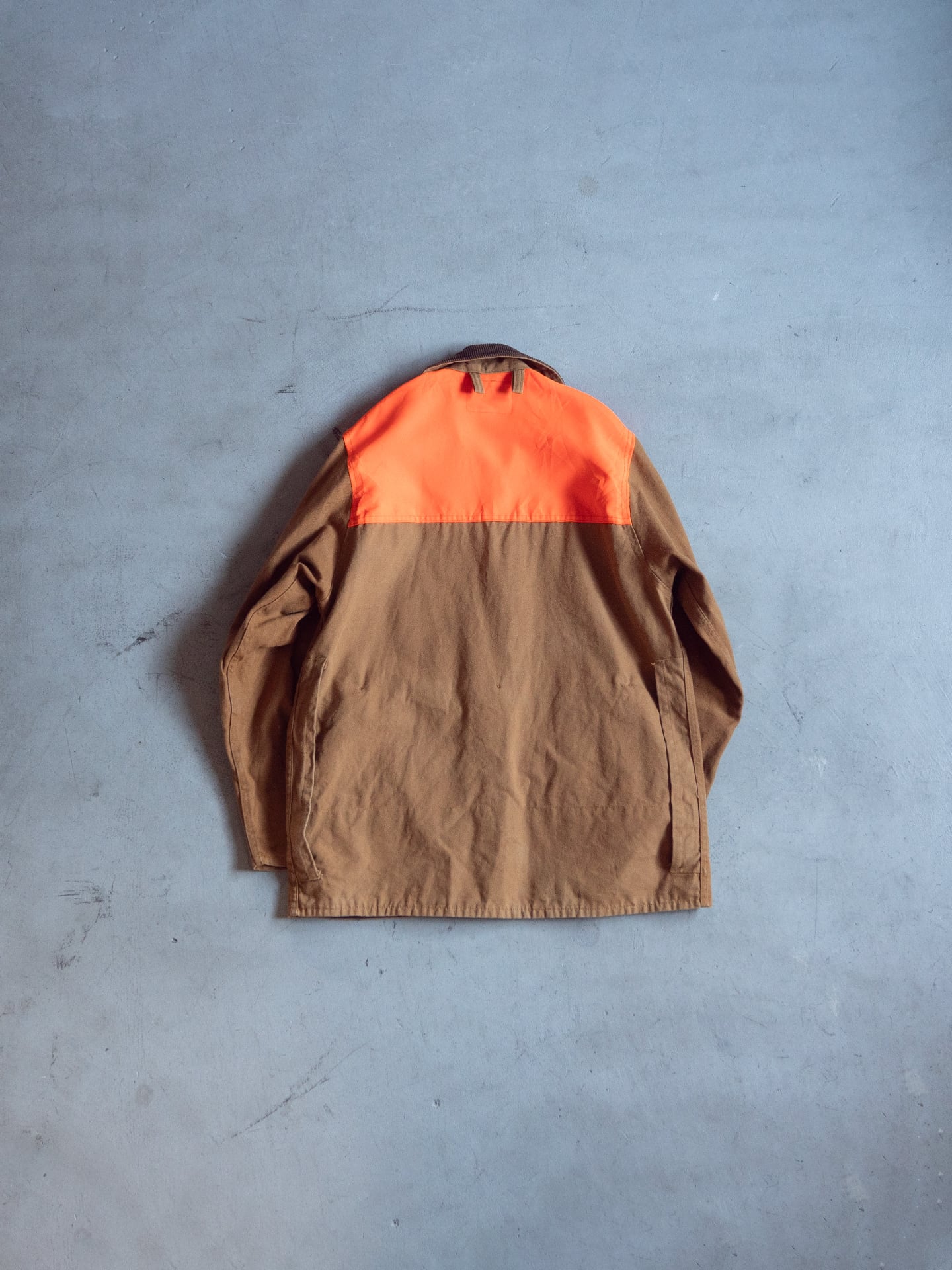 ブラウンダックに深茶色のコーデュロイ衿、そして発色の良いオレンジ色のリフレクトキャンバスを組み合わせた、90年代米国製RANGER(レンジャー)のハンティングジャケットです。