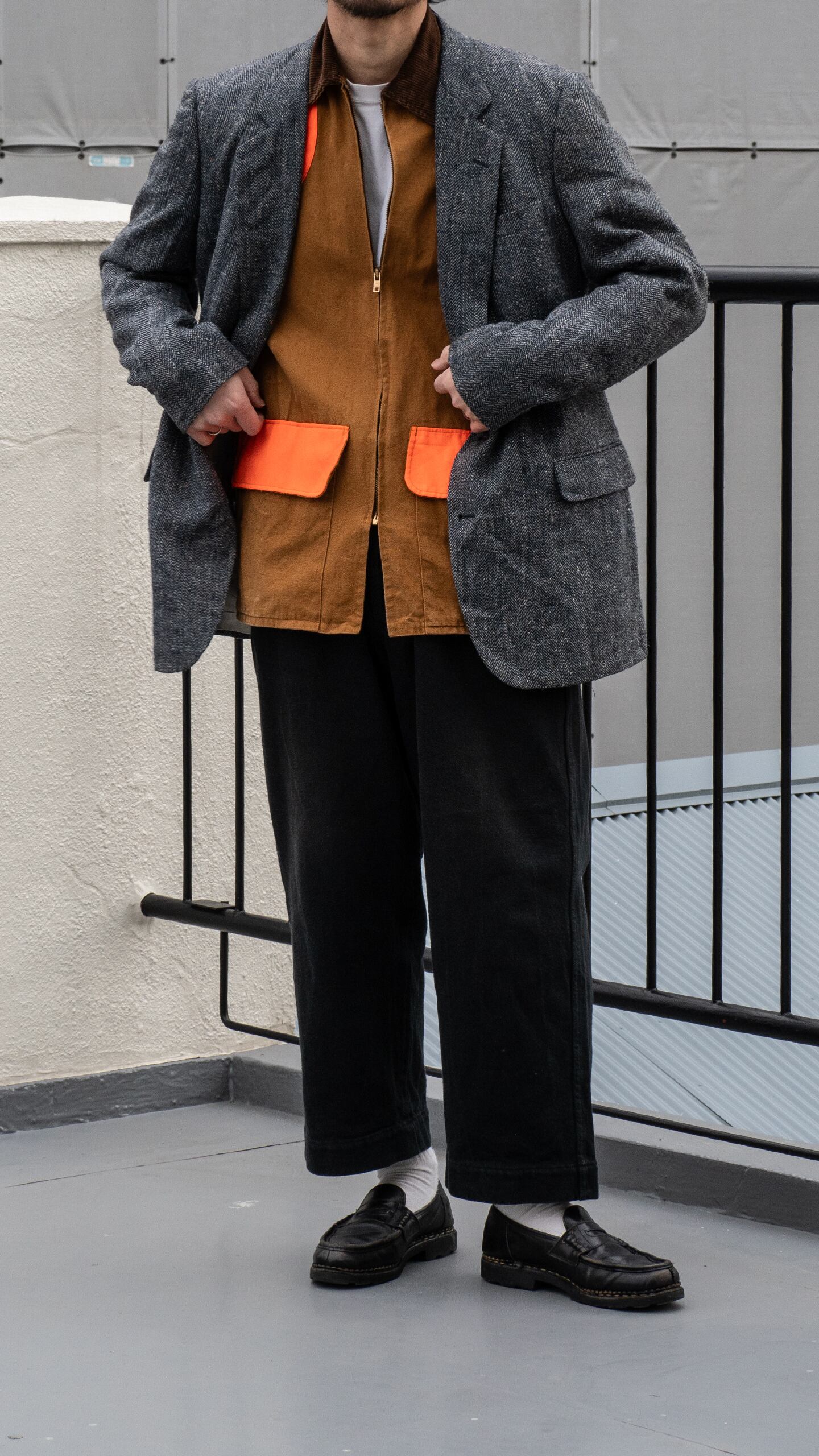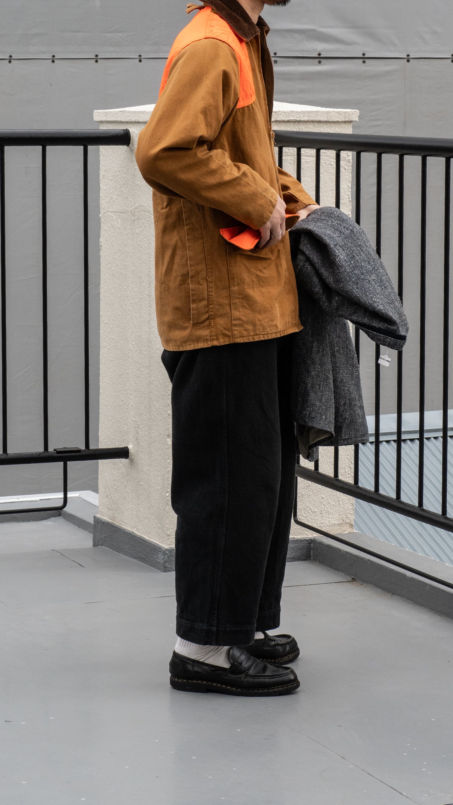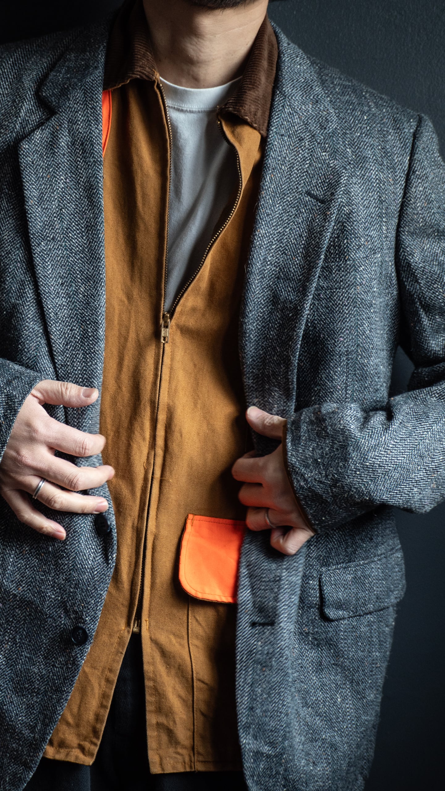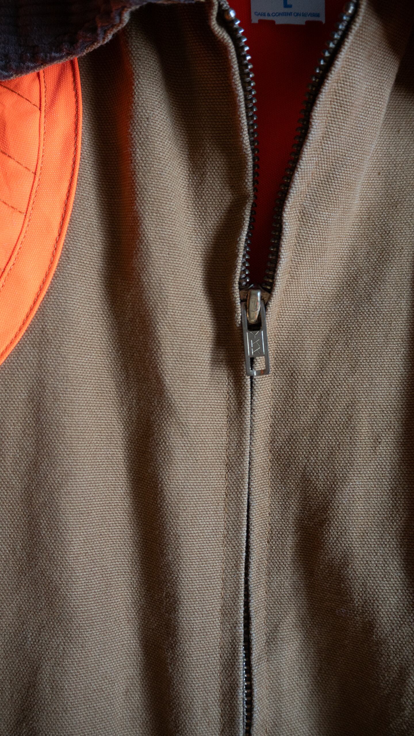 ブラウンダックに深茶色のコーデュロイ衿、そして発色の良いオレンジ色のリフレクトキャンバスを組み合わせた、90年代米国製RANGER(レンジャー)のハンティングジャケットです。