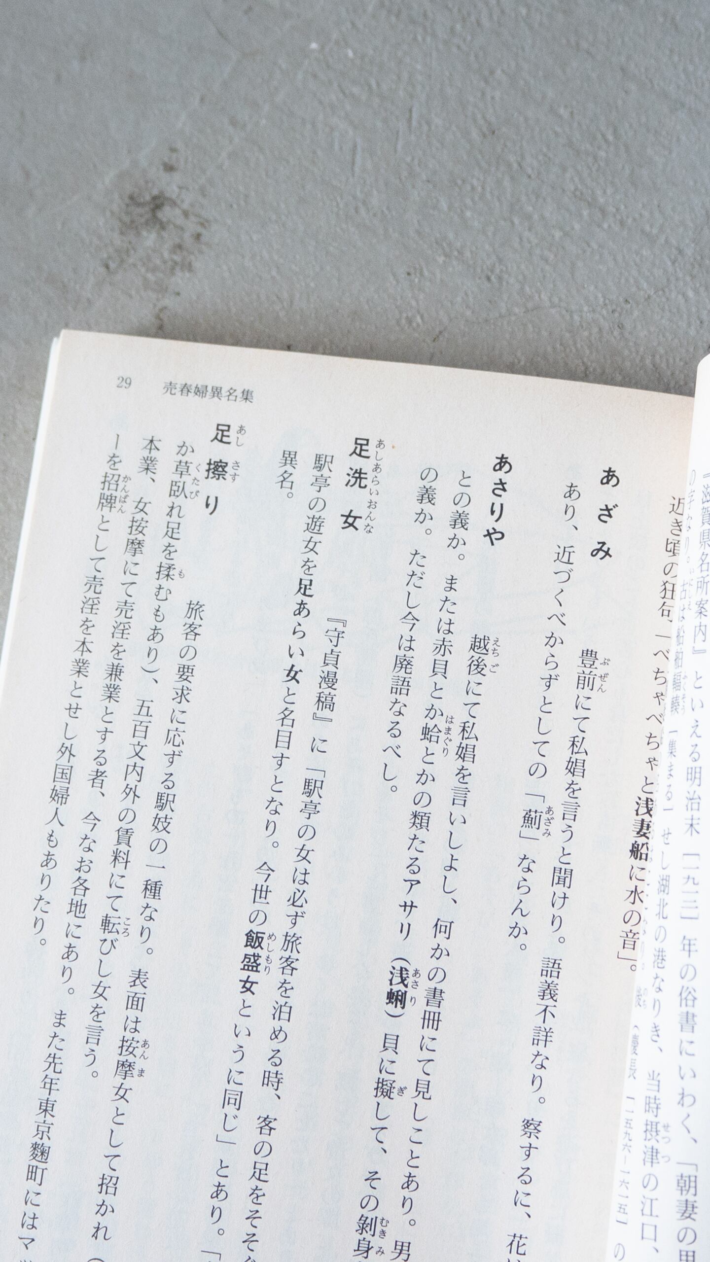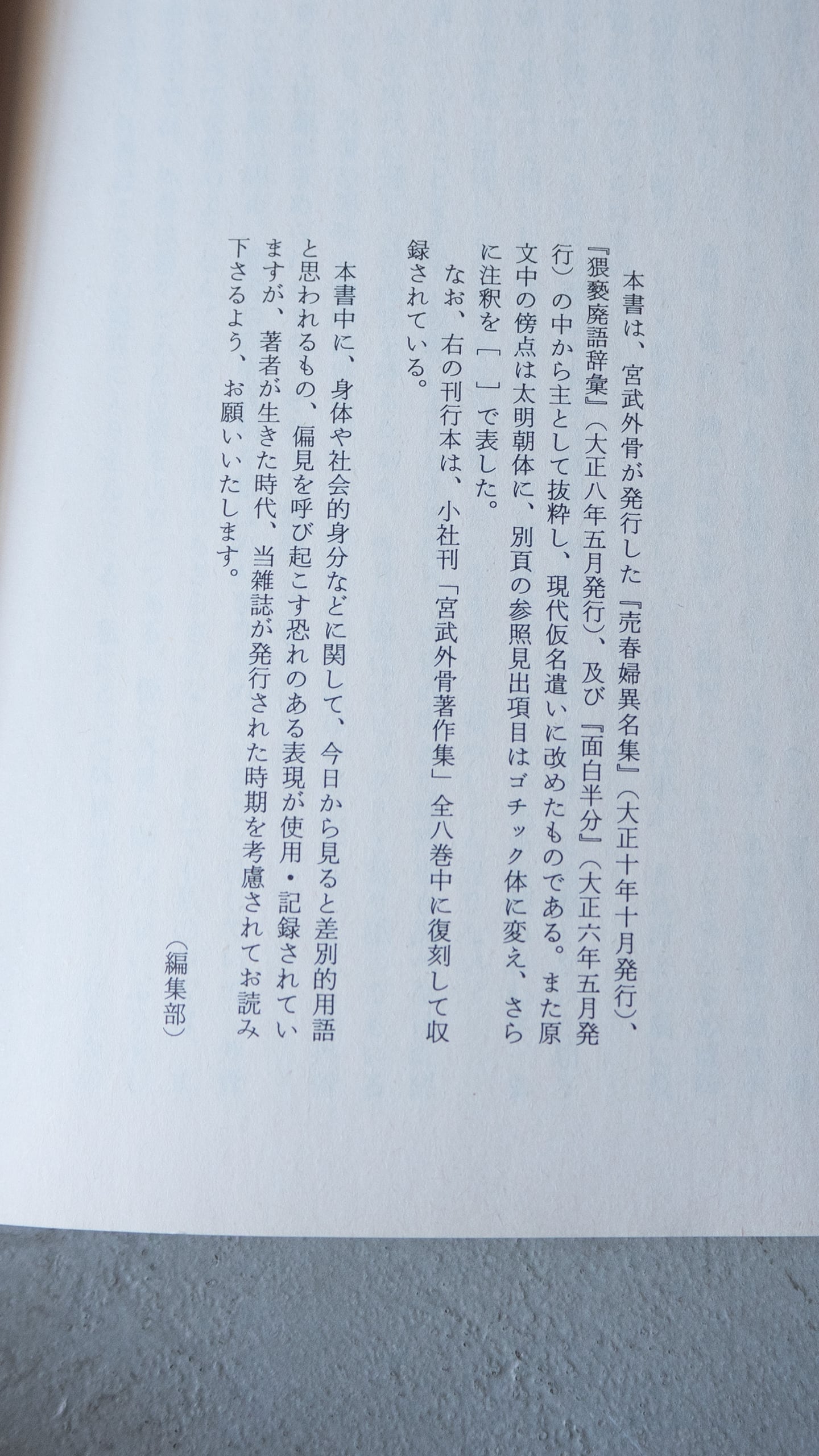 本書は、古来の風俗用語およびその解説を、主に宮武外骨の「売春婦異名集」「猥褻廃語辞彙」「面白半分」から抜粋し、現代仮名遣いに改めたもの。