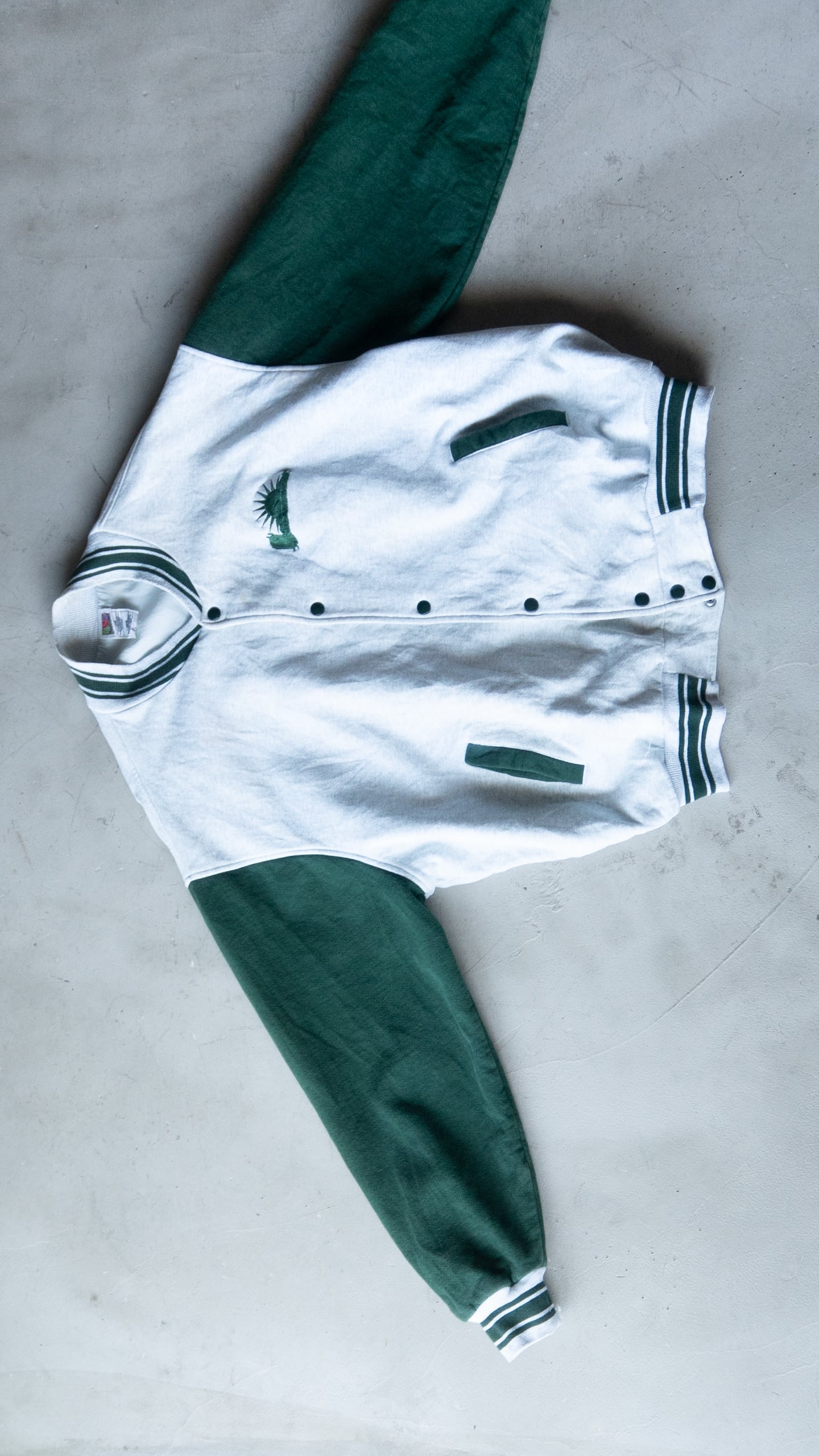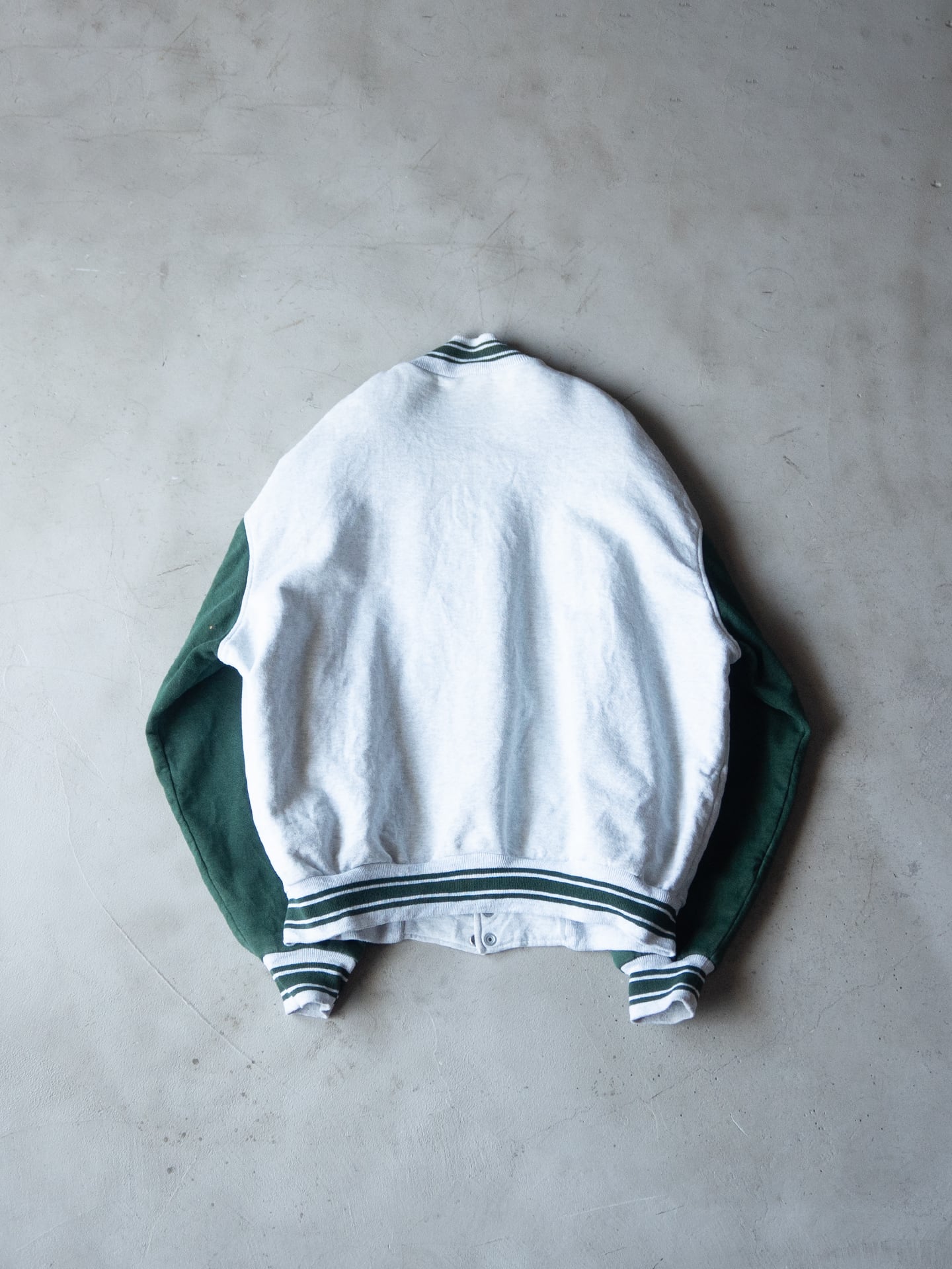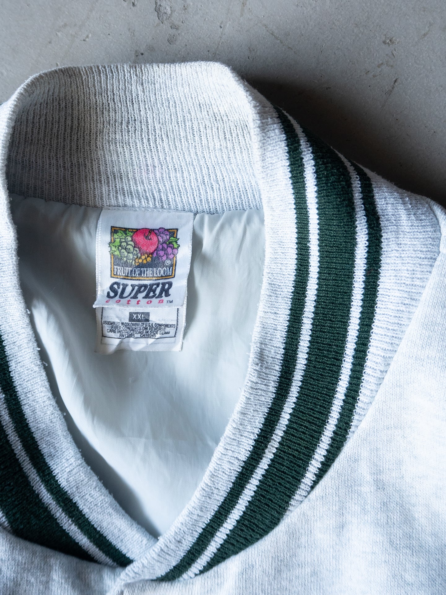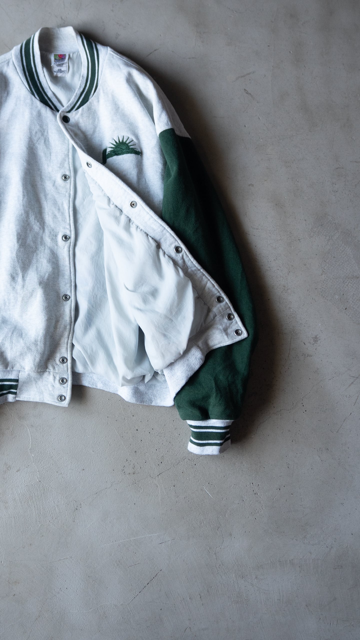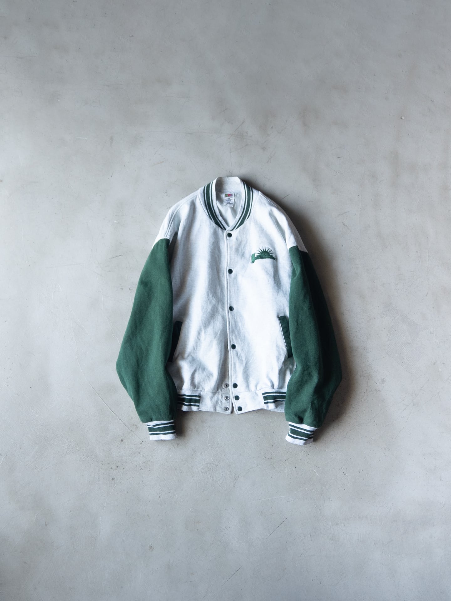 Fruit of the Loom社製ならではの厚みと綺麗な目面のボディを採用していて、90年代当時らしい身頃にも袖にも裏地が付くスウェットスタジャン型です。