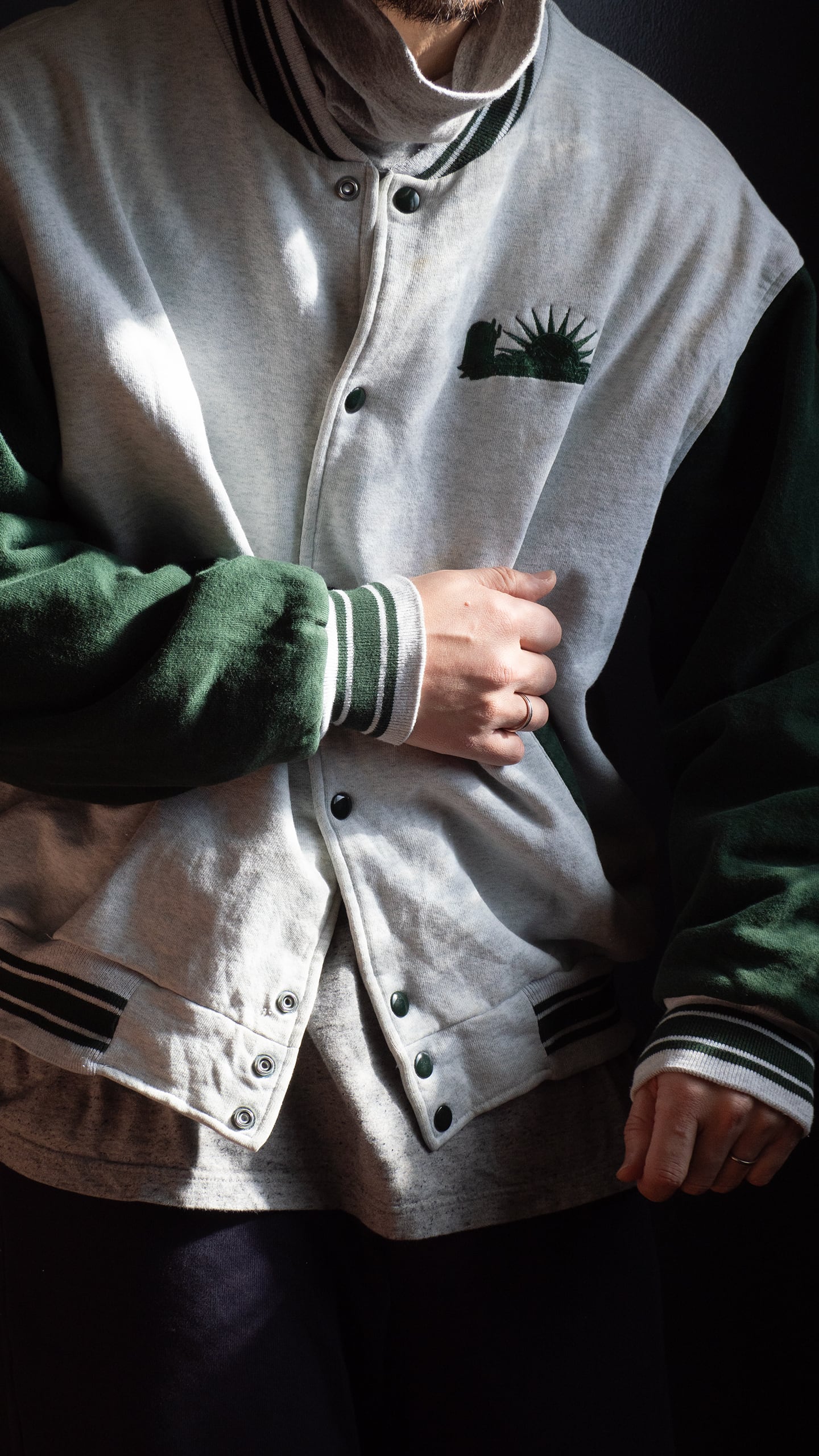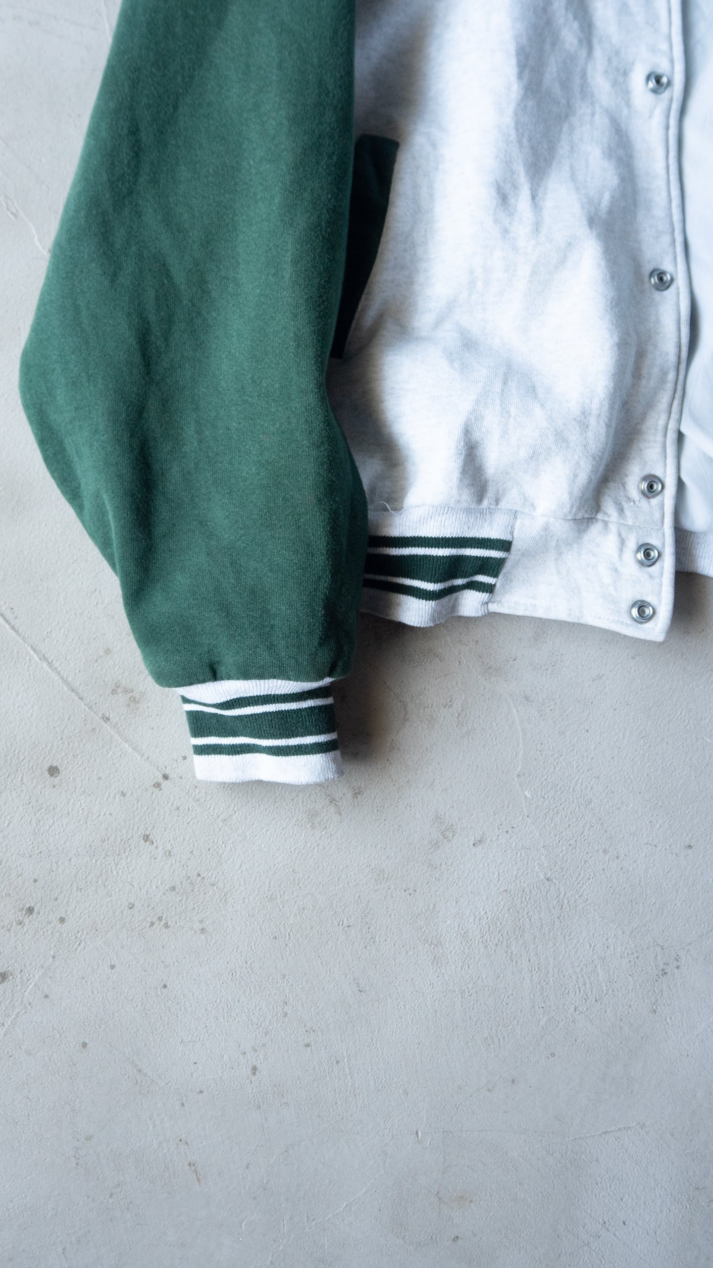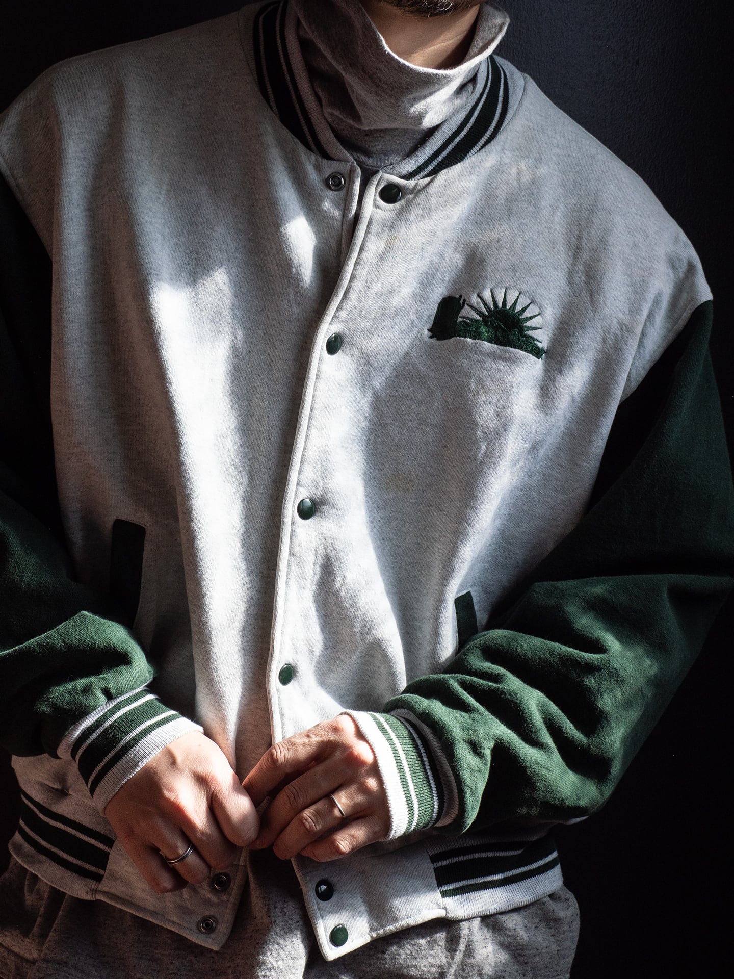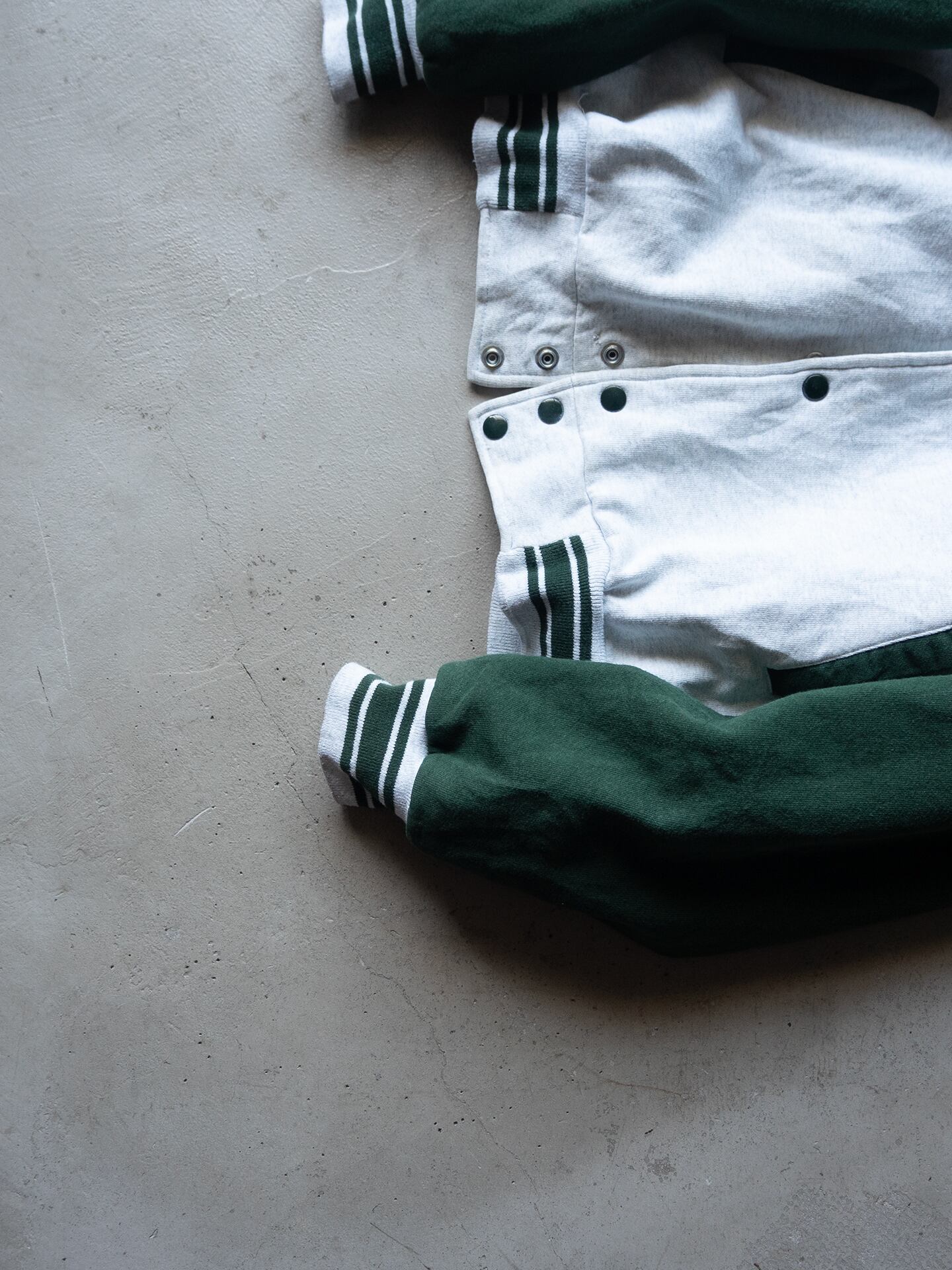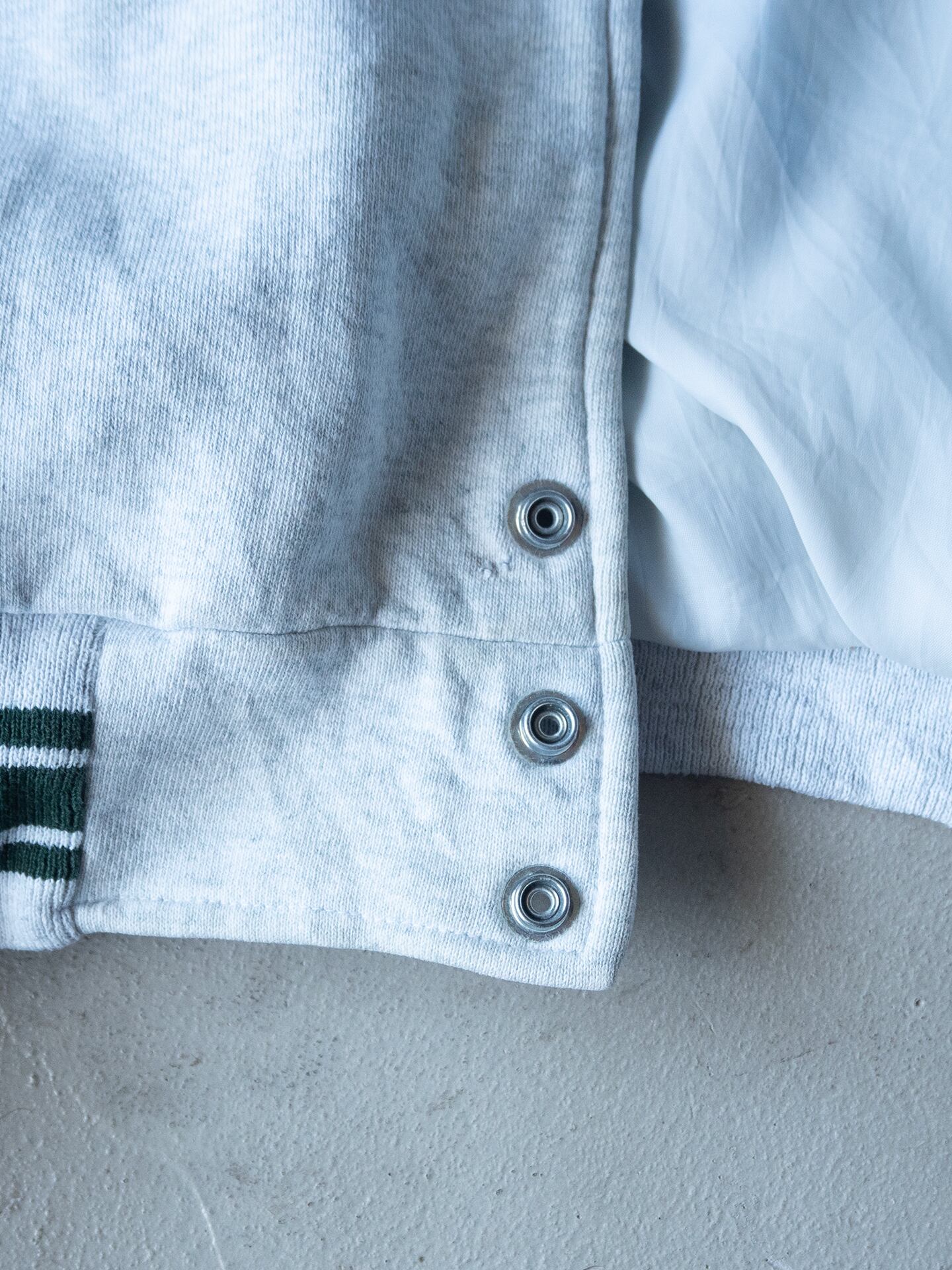 Fruit of the Loom社製ならではの厚みと綺麗な目面のボディを採用していて、90年代当時らしい身頃にも袖にも裏地が付くスウェットスタジャン型です。