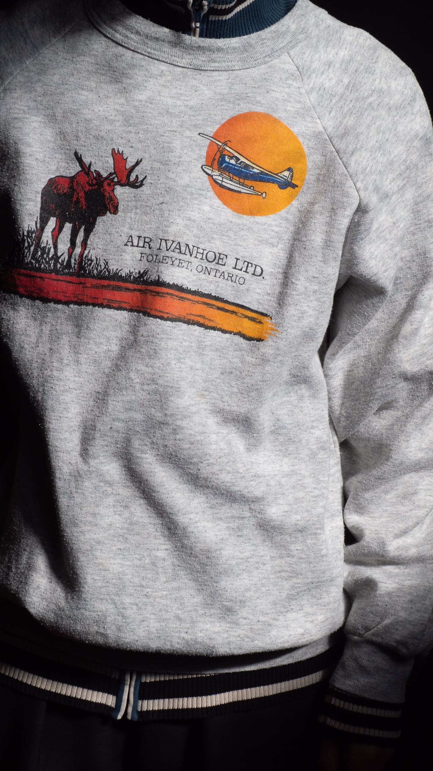 このスウェットに写っている飛行機は、当施設湖畔に停めてあるもので、現地での移動手段になるもの。そしてヘラジカは、カナダの自然の中に生息する動物です。