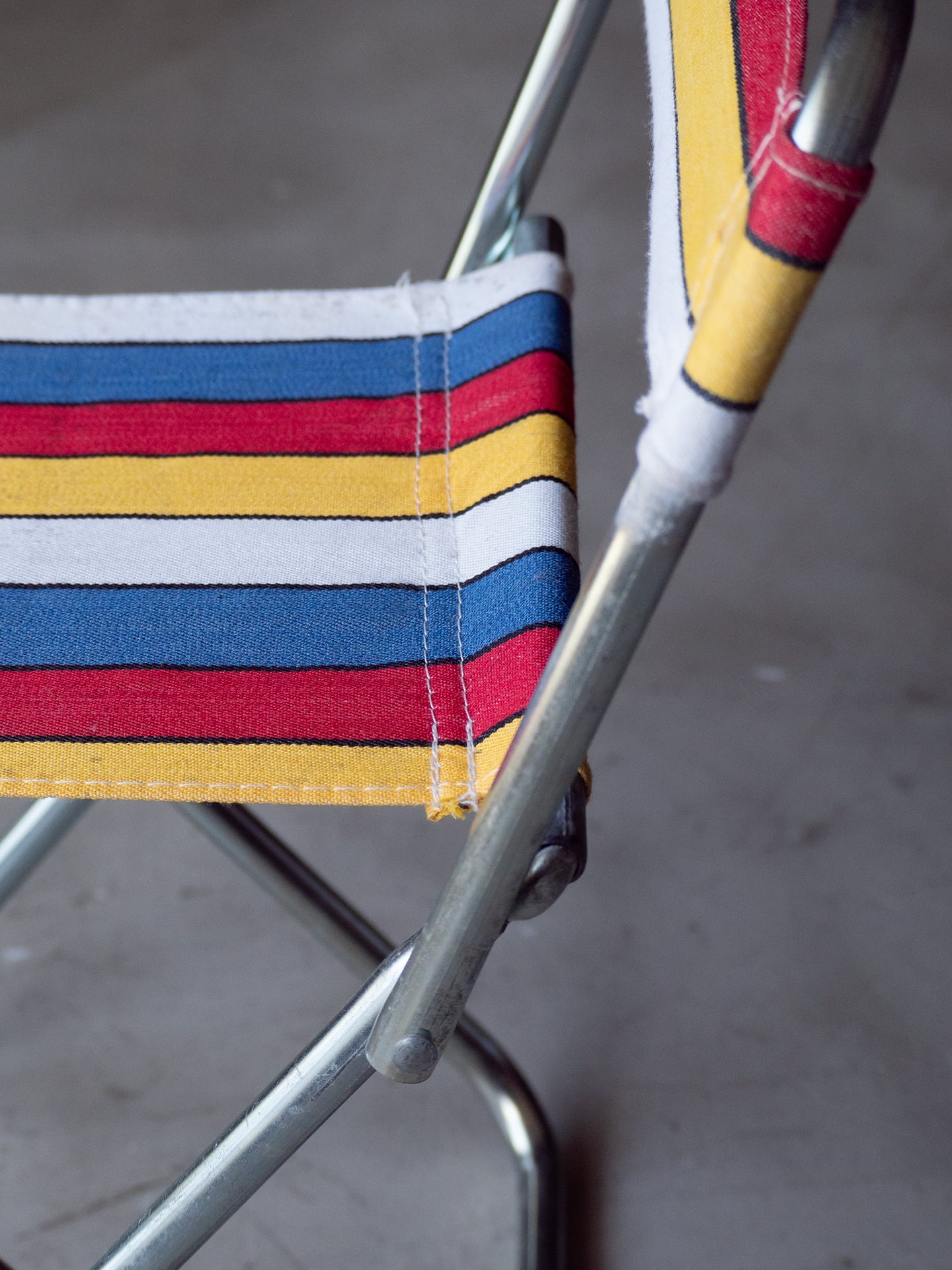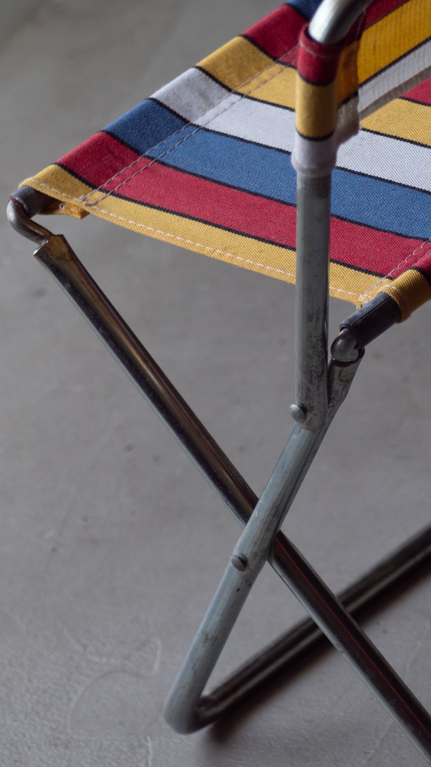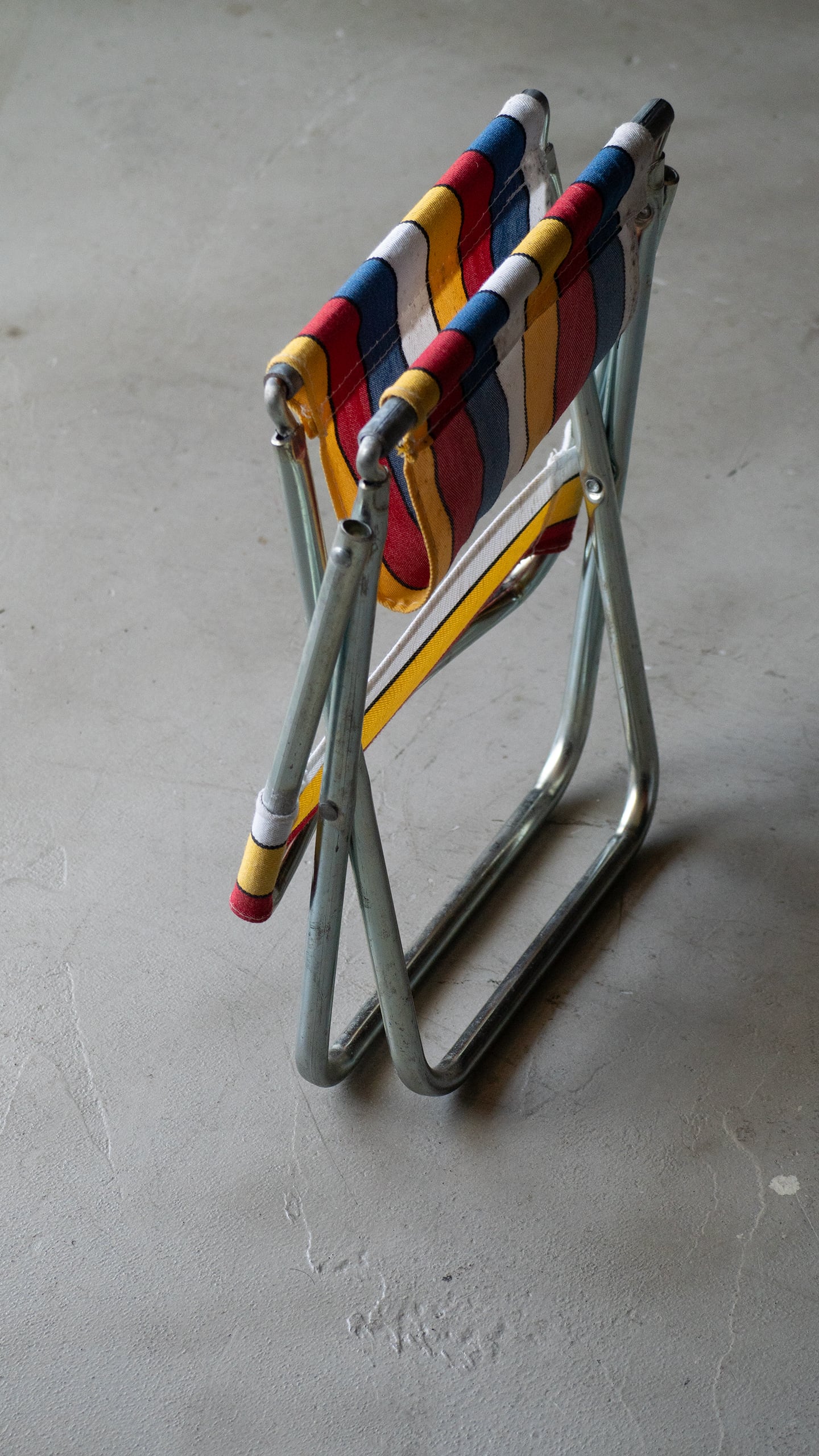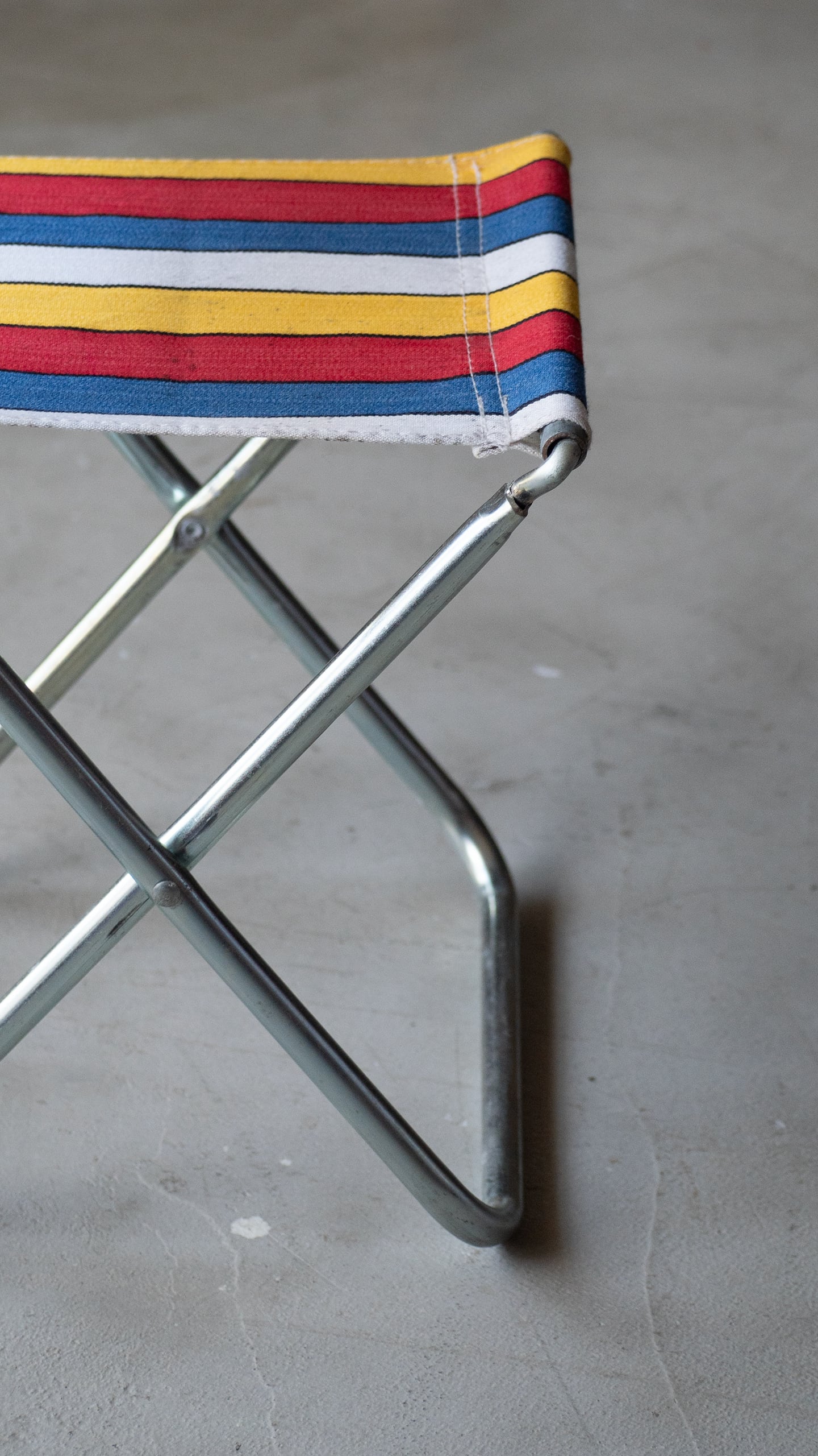 ブルー・イエロー・レッド・ホワイトのマルチストライプ柄が良い雰囲気のミニフォールディングチェアです。