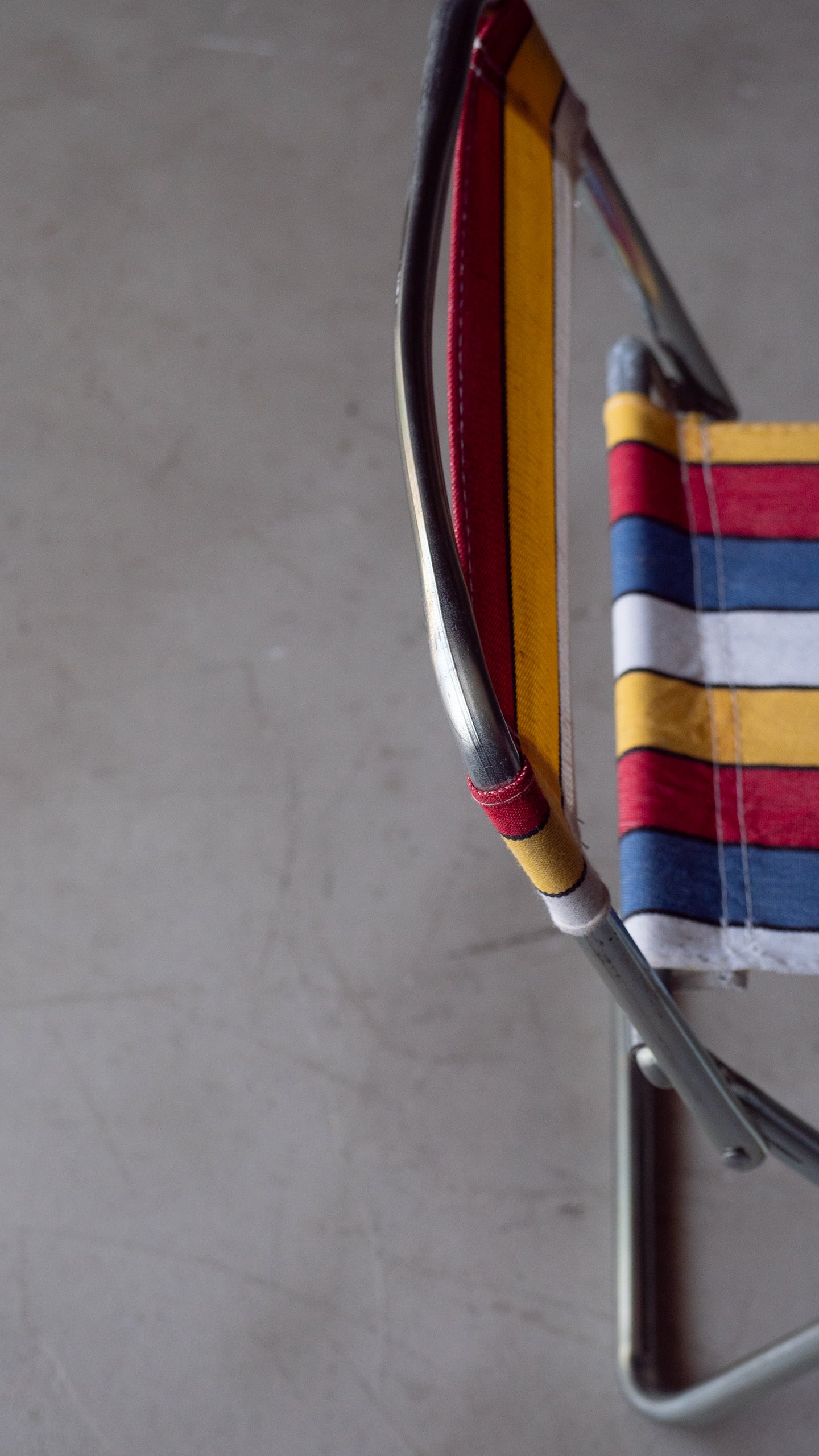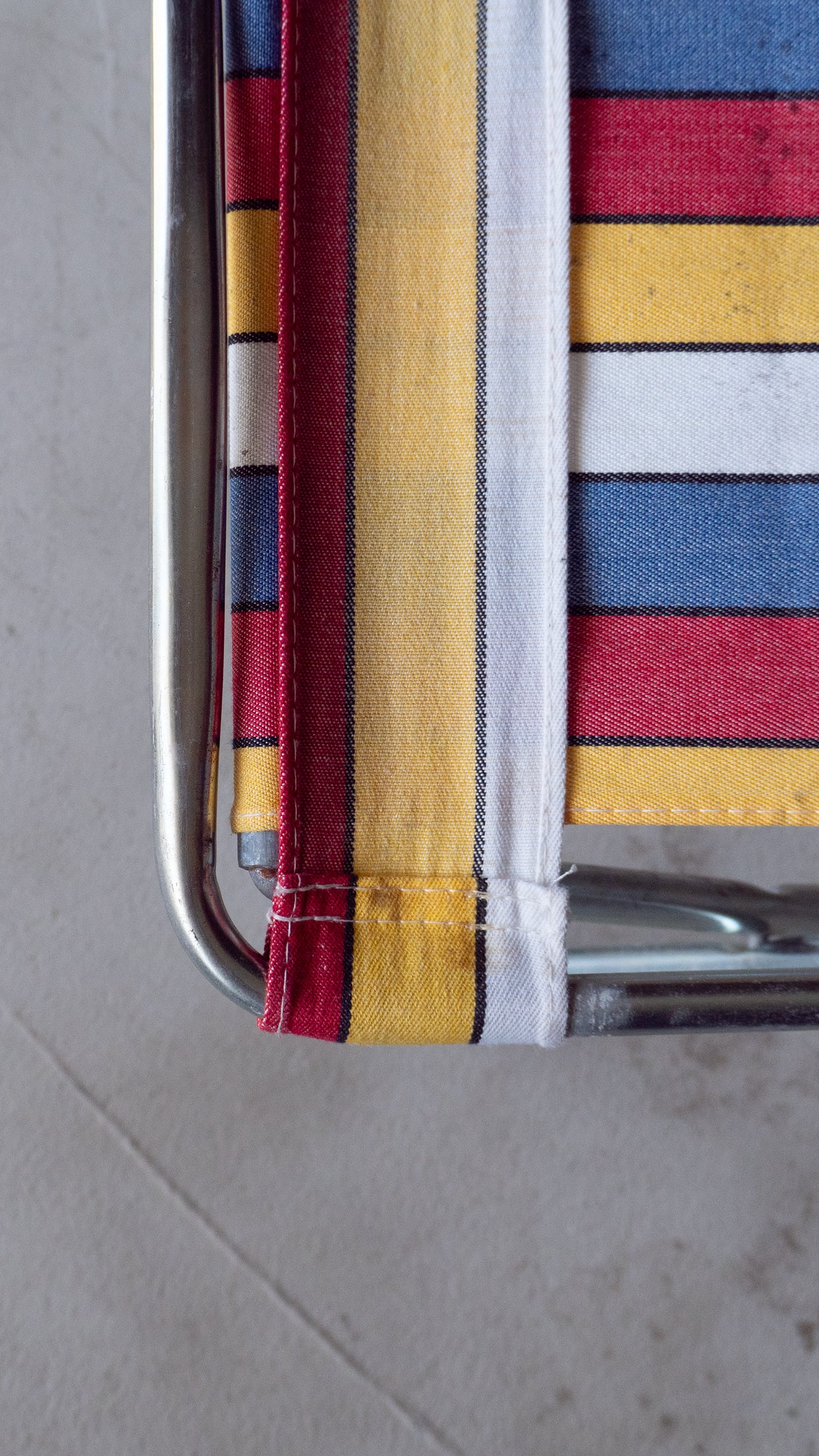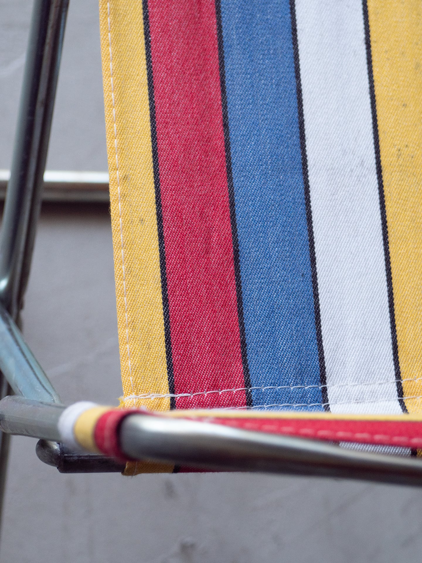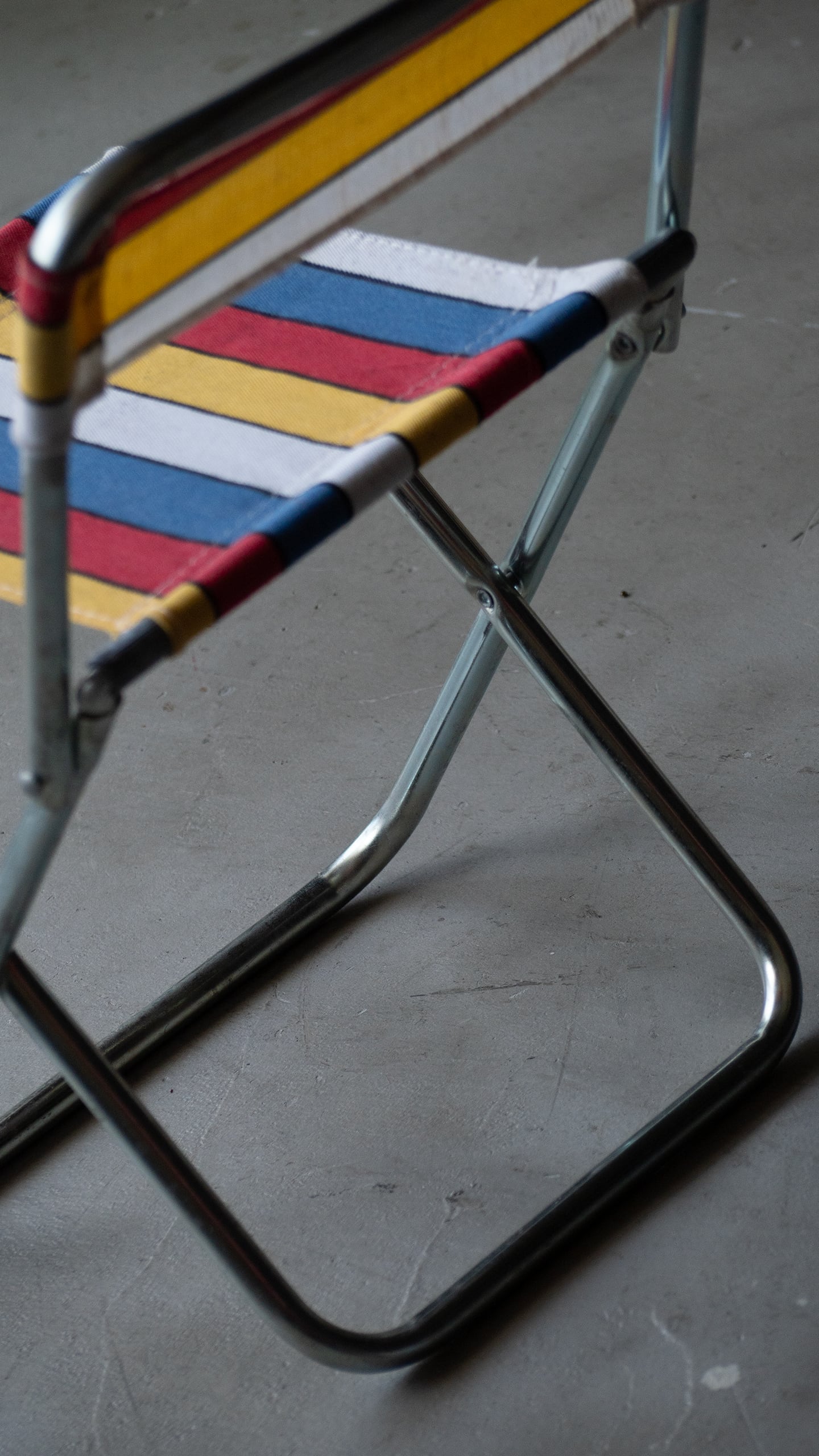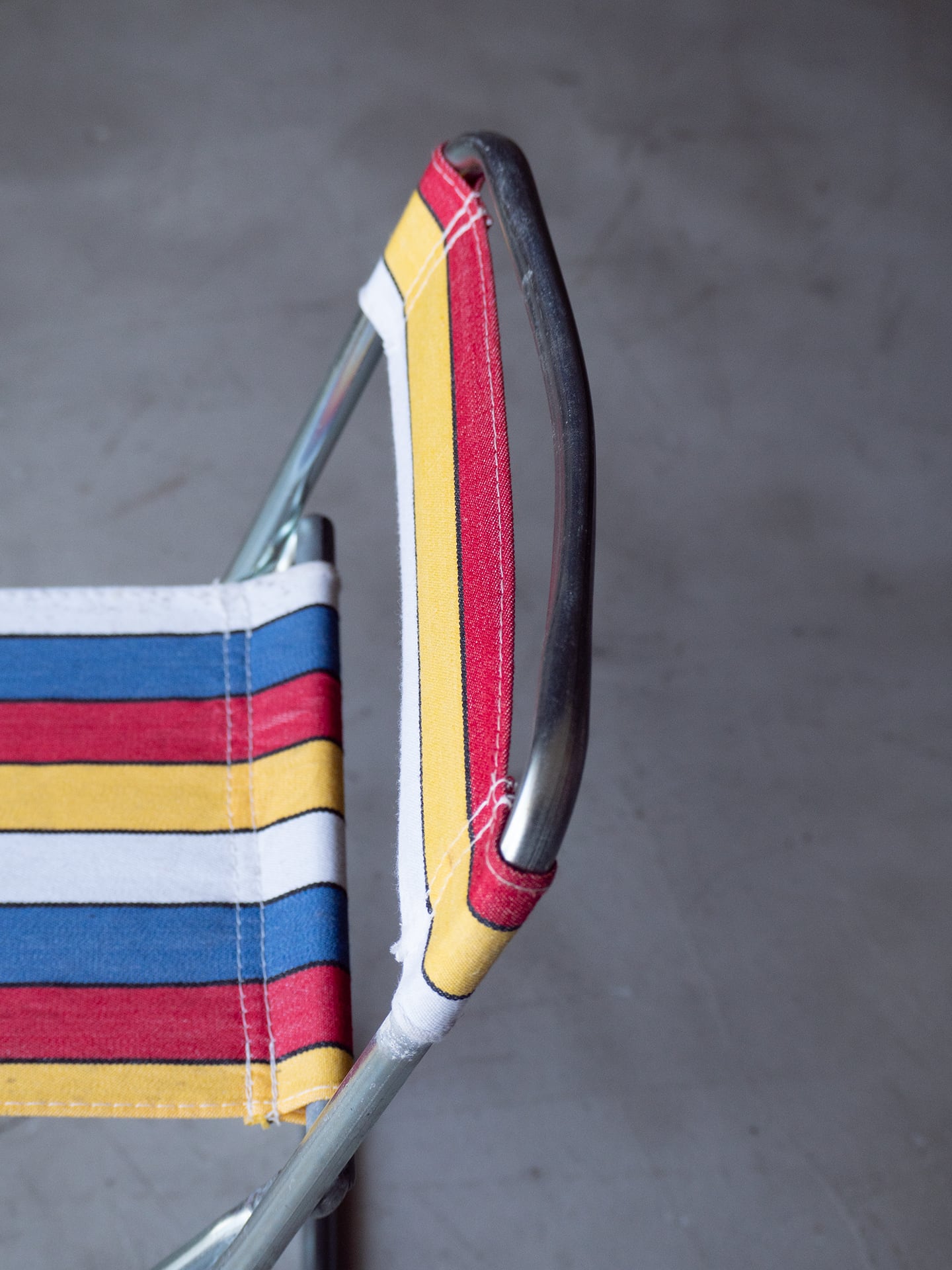ブルー・イエロー・レッド・ホワイトのマルチストライプ柄が良い雰囲気のミニフォールディングチェアです。
