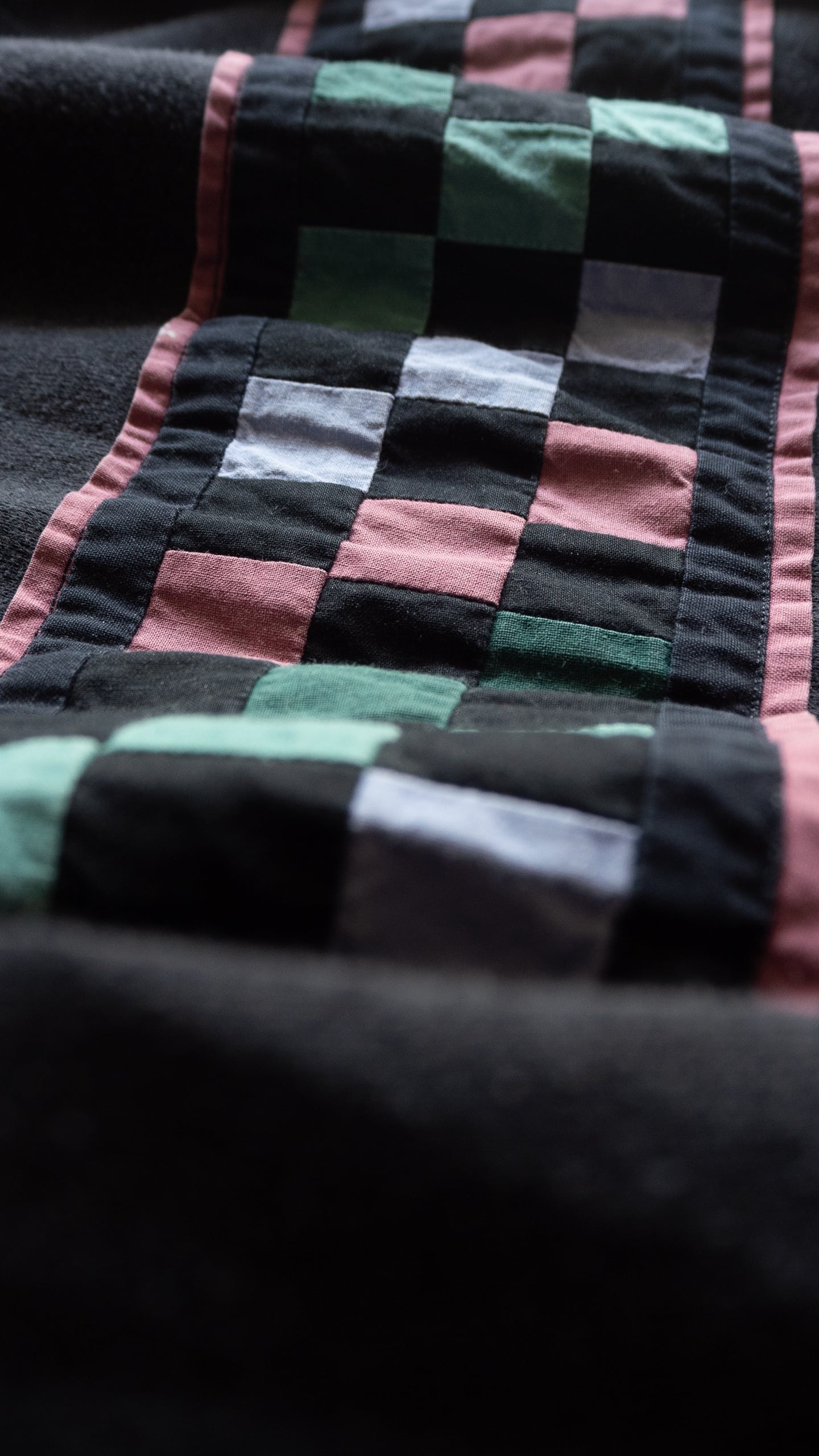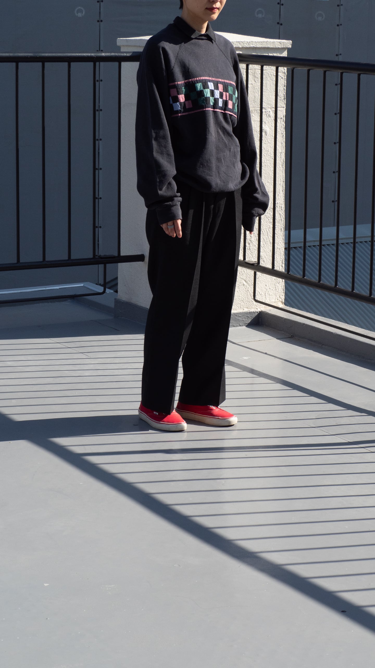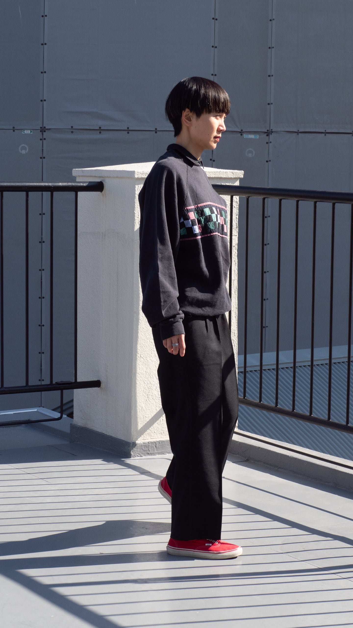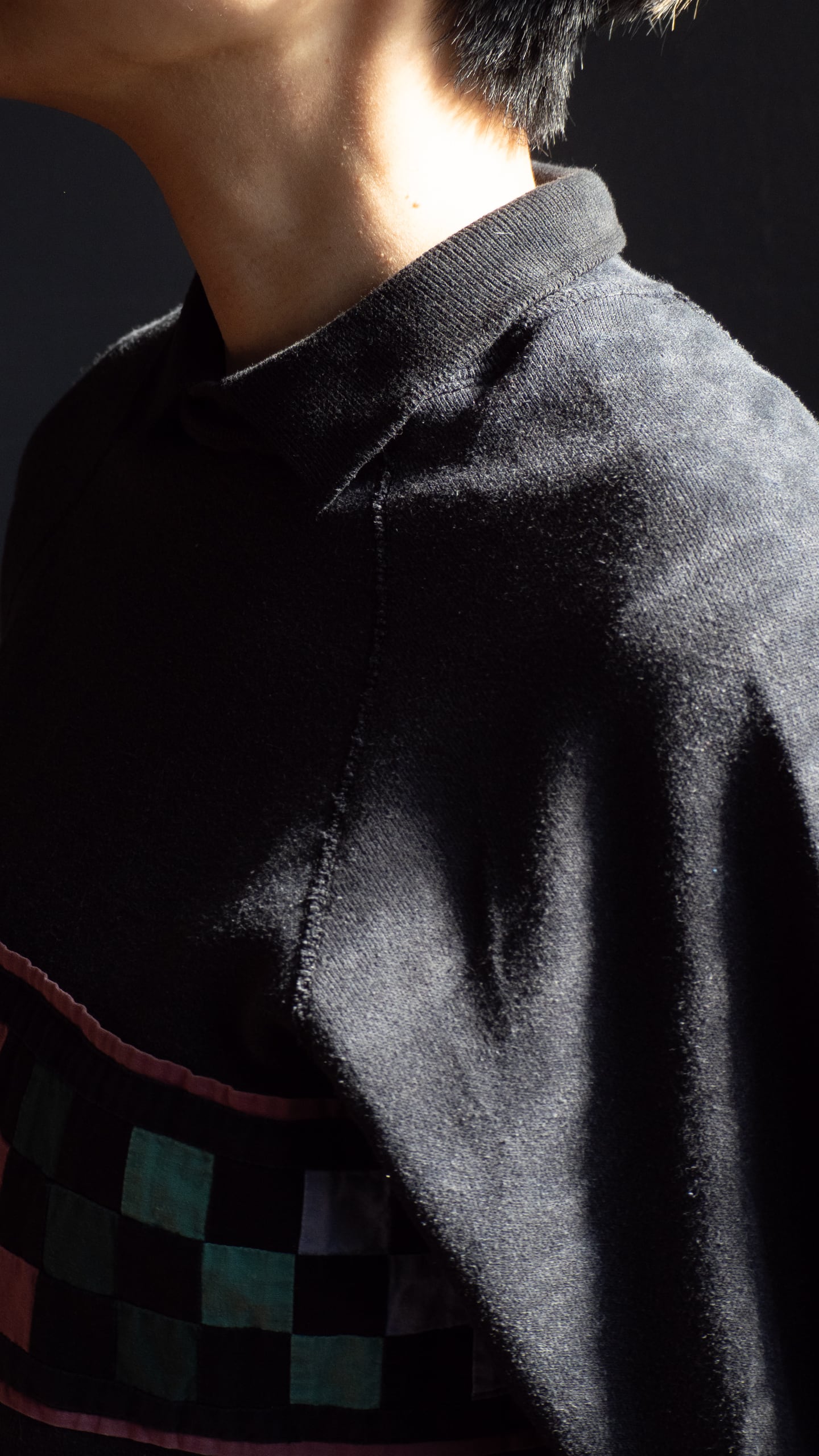 おそらくクルーネックのトレーナーをカスタムしたものだと思われ、胸にはシーチング生地を組み合わせたチェッカー柄が縫い付けられていて、襟にもリブ編みの羽衿が付属しています。