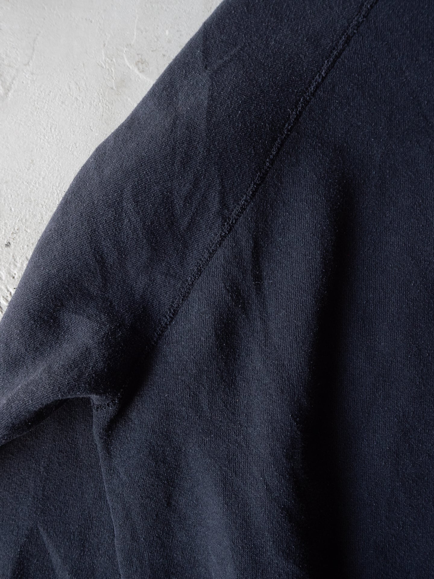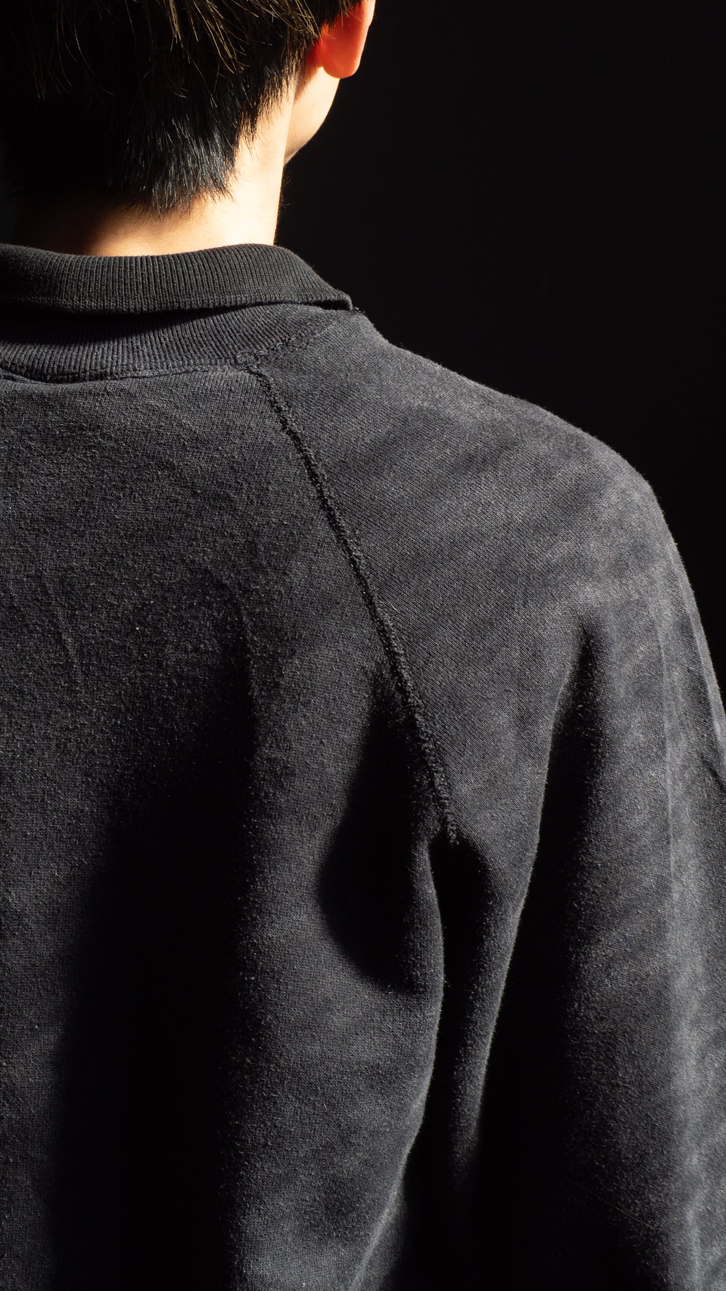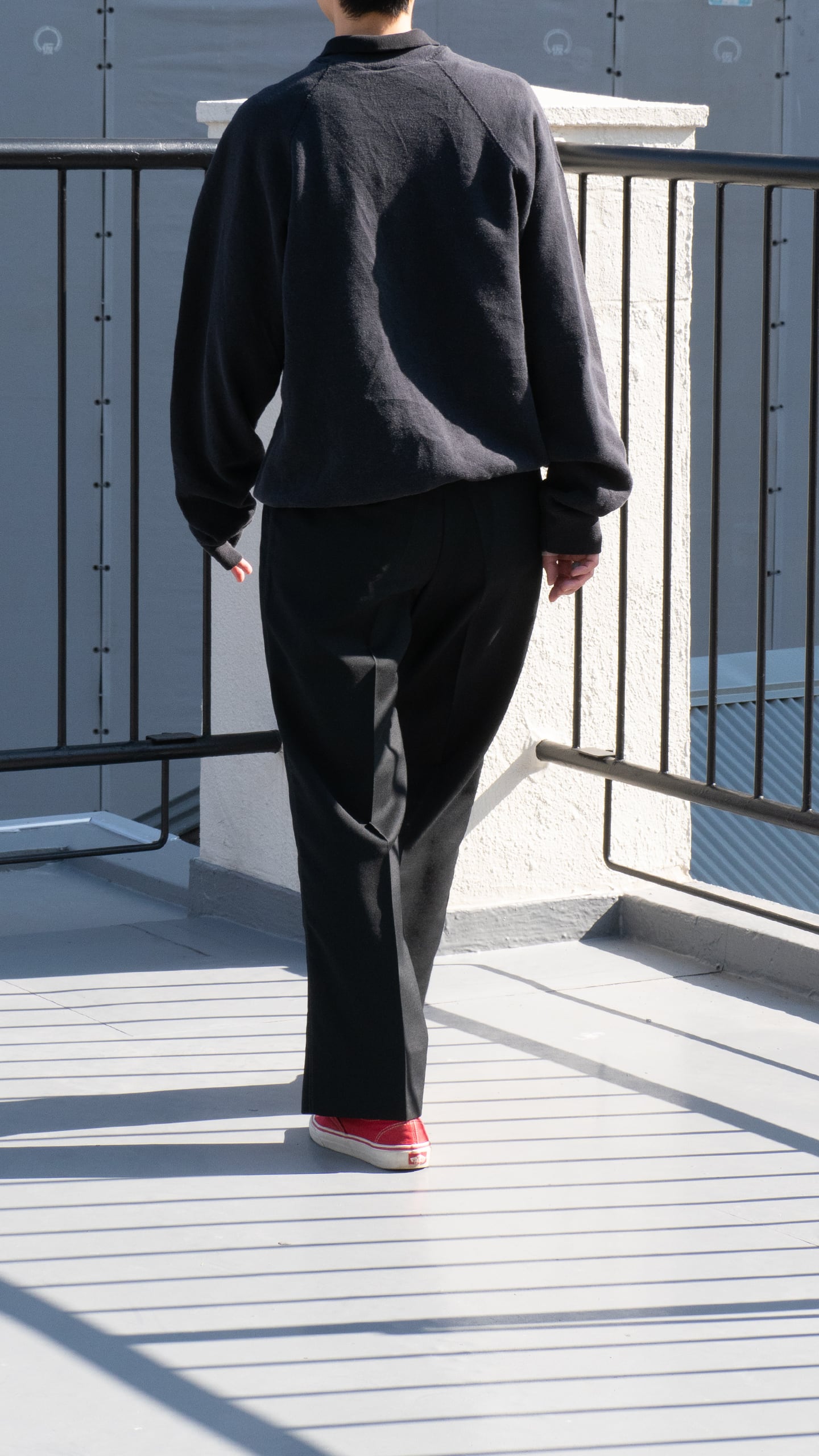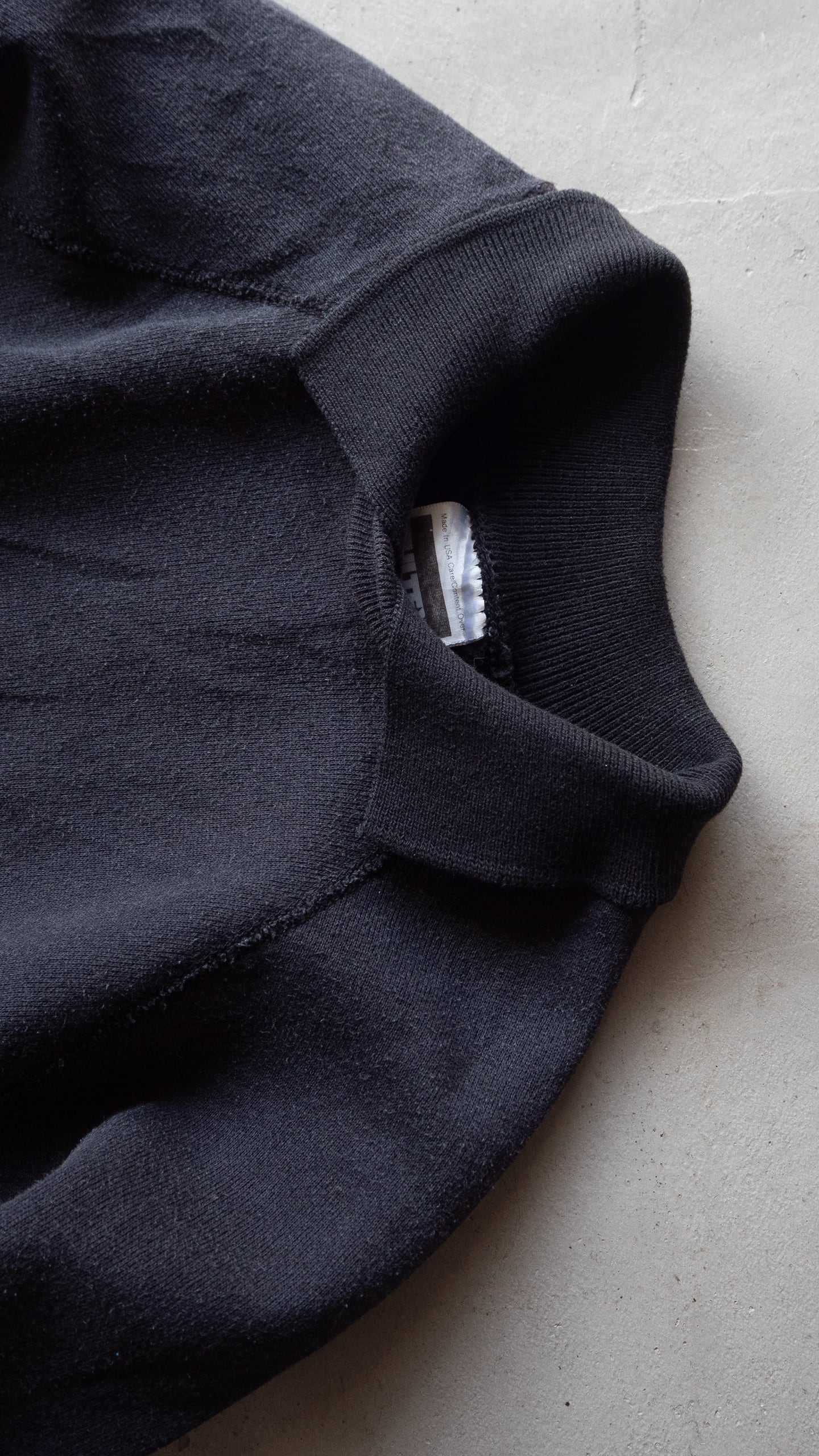 コットン50%ポリエステル50%の裏毛生地で、ラグランスリーブのボディにクルーネックというベーシックなスウェットをボディにしています。