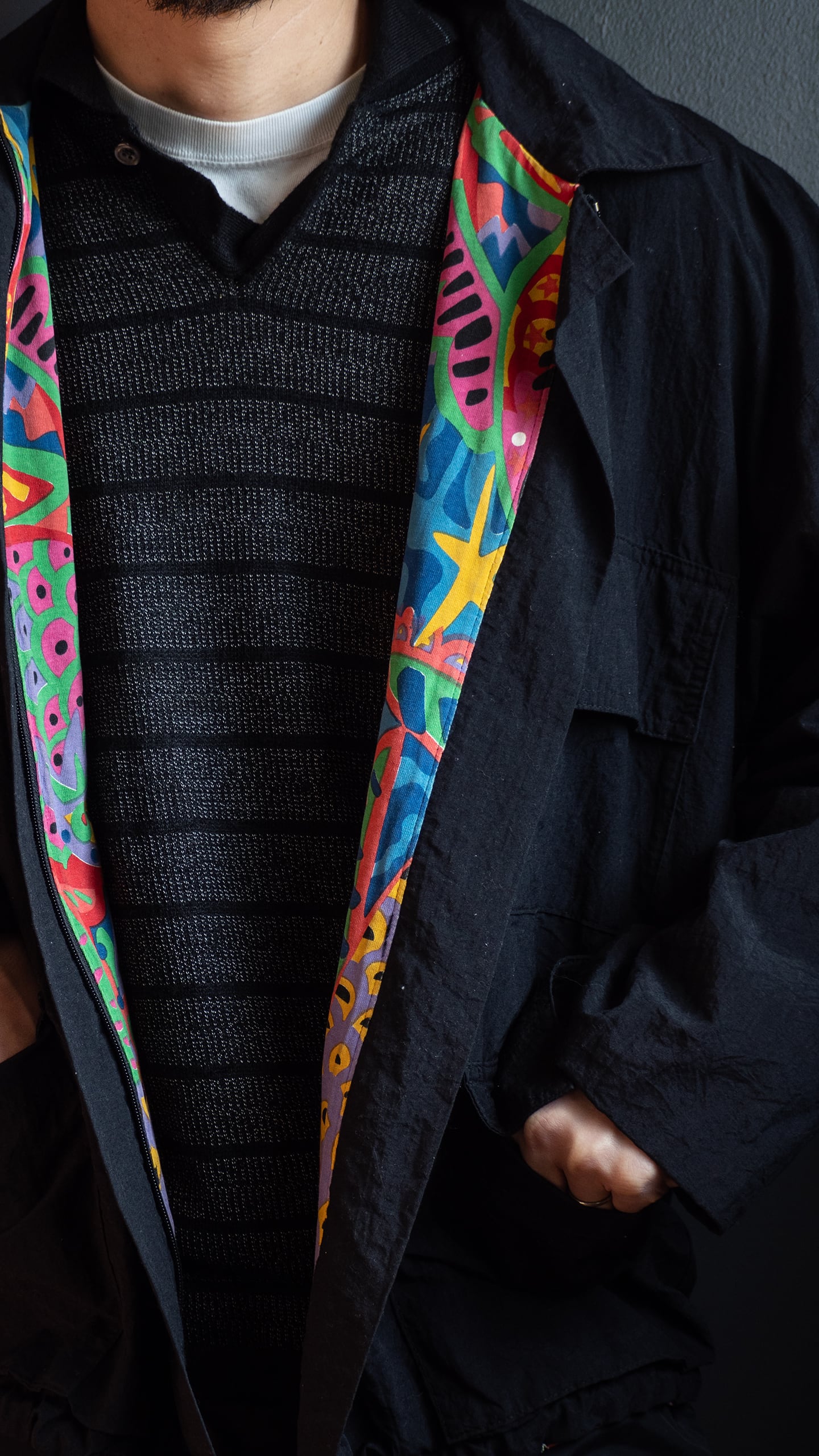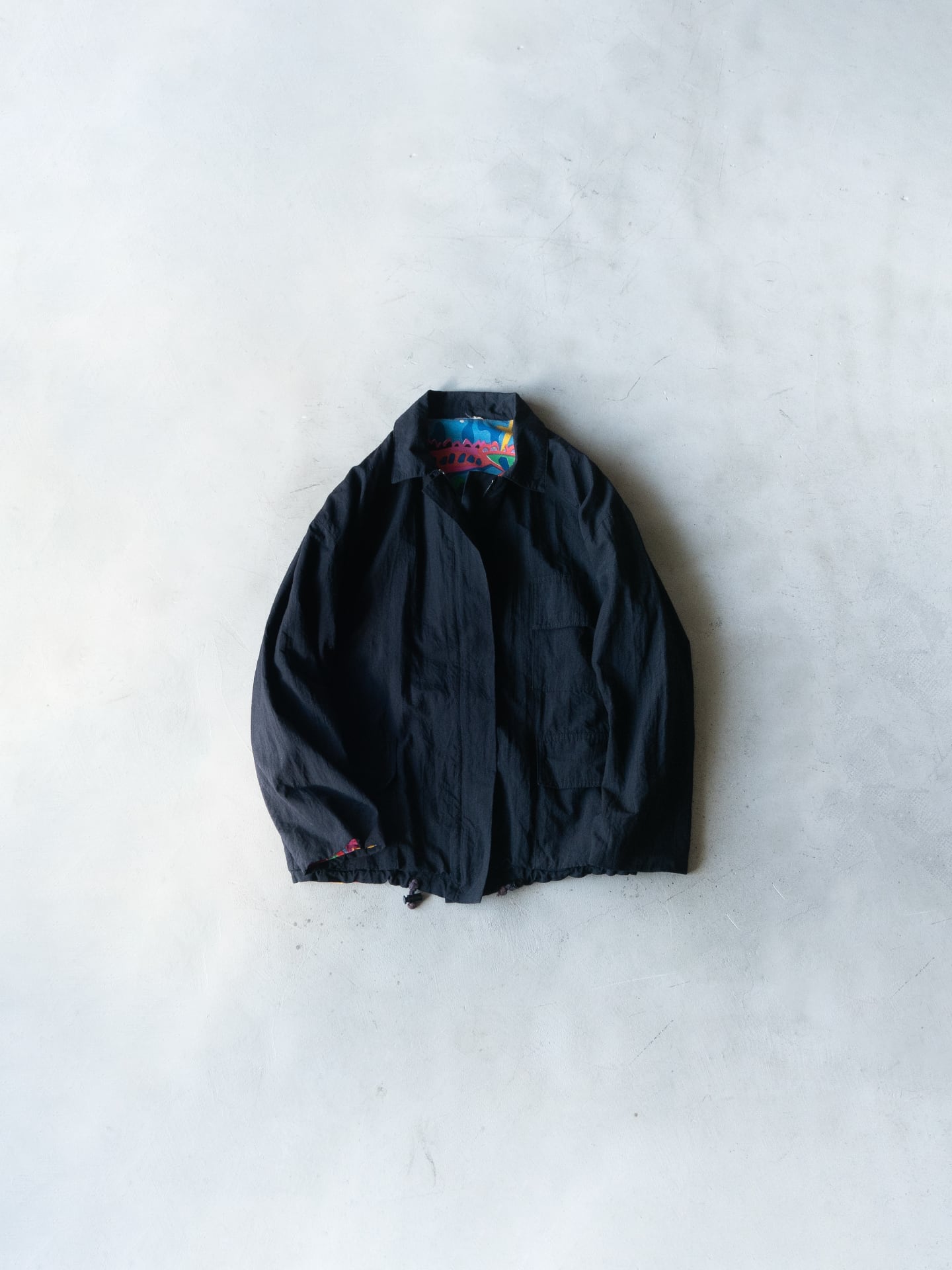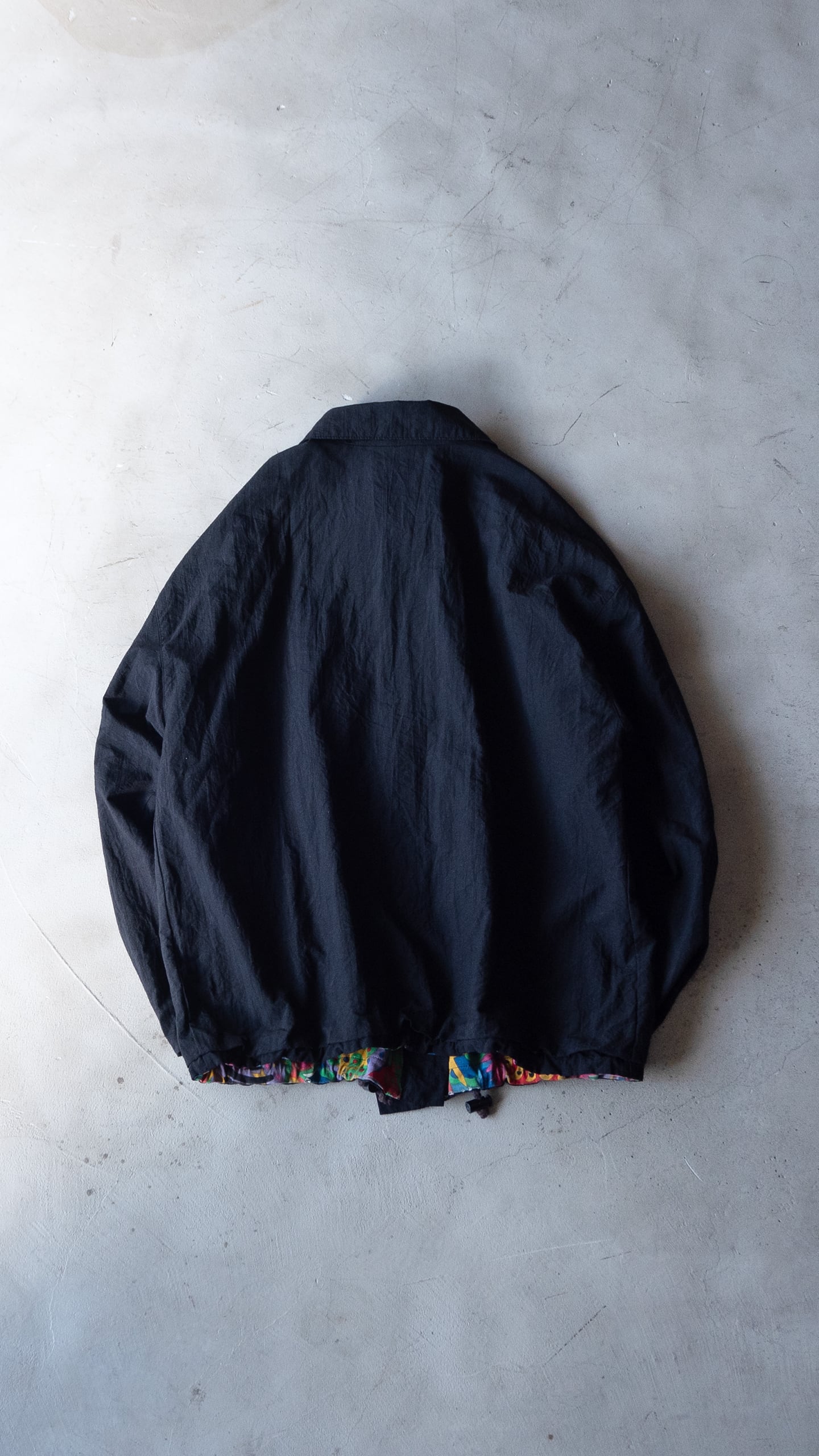 表地はブラックのライトシェル、裏地はジャージークロスにクレイジー柄をプリントした生地を組み合わせたブルゾンです。