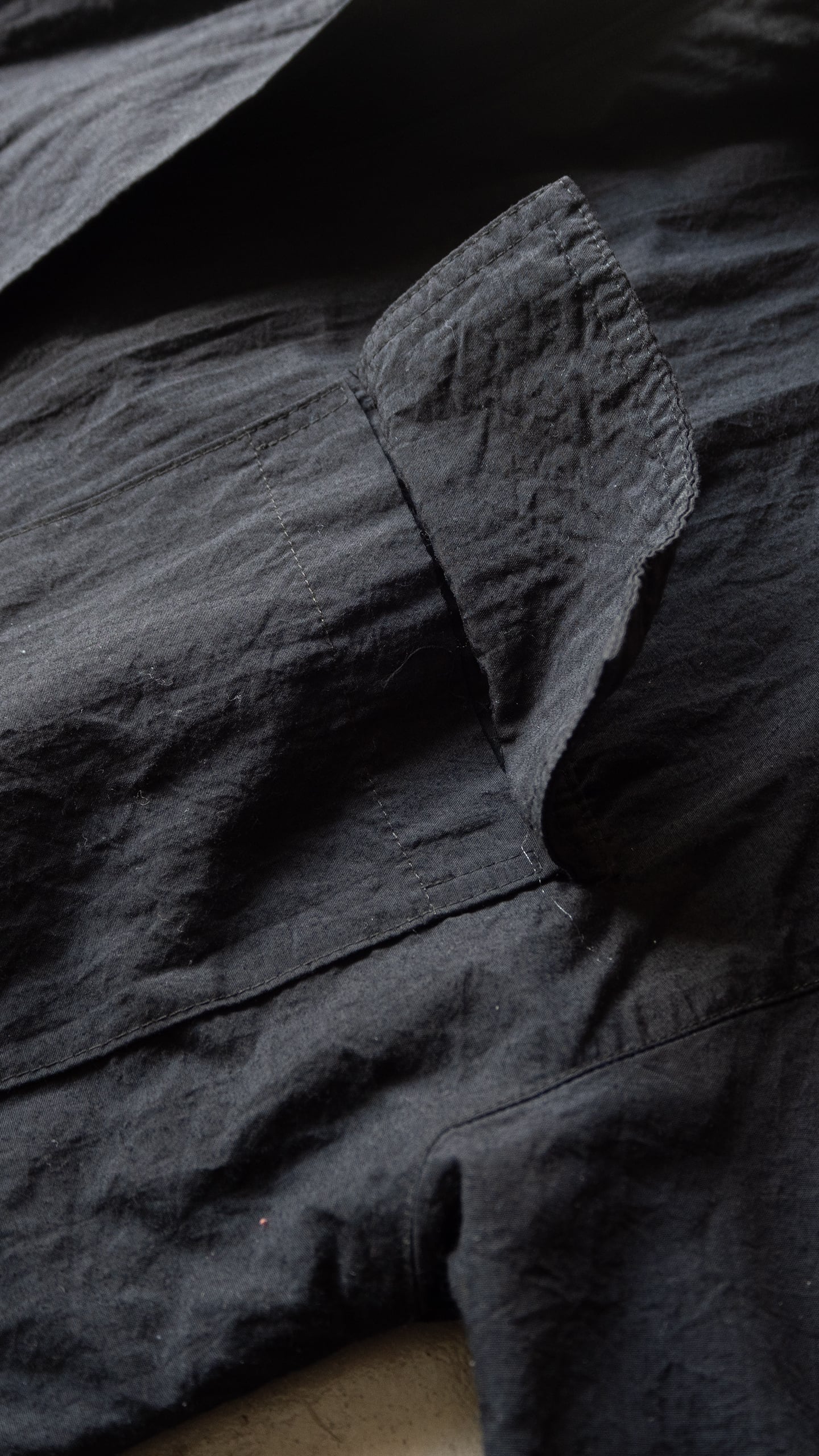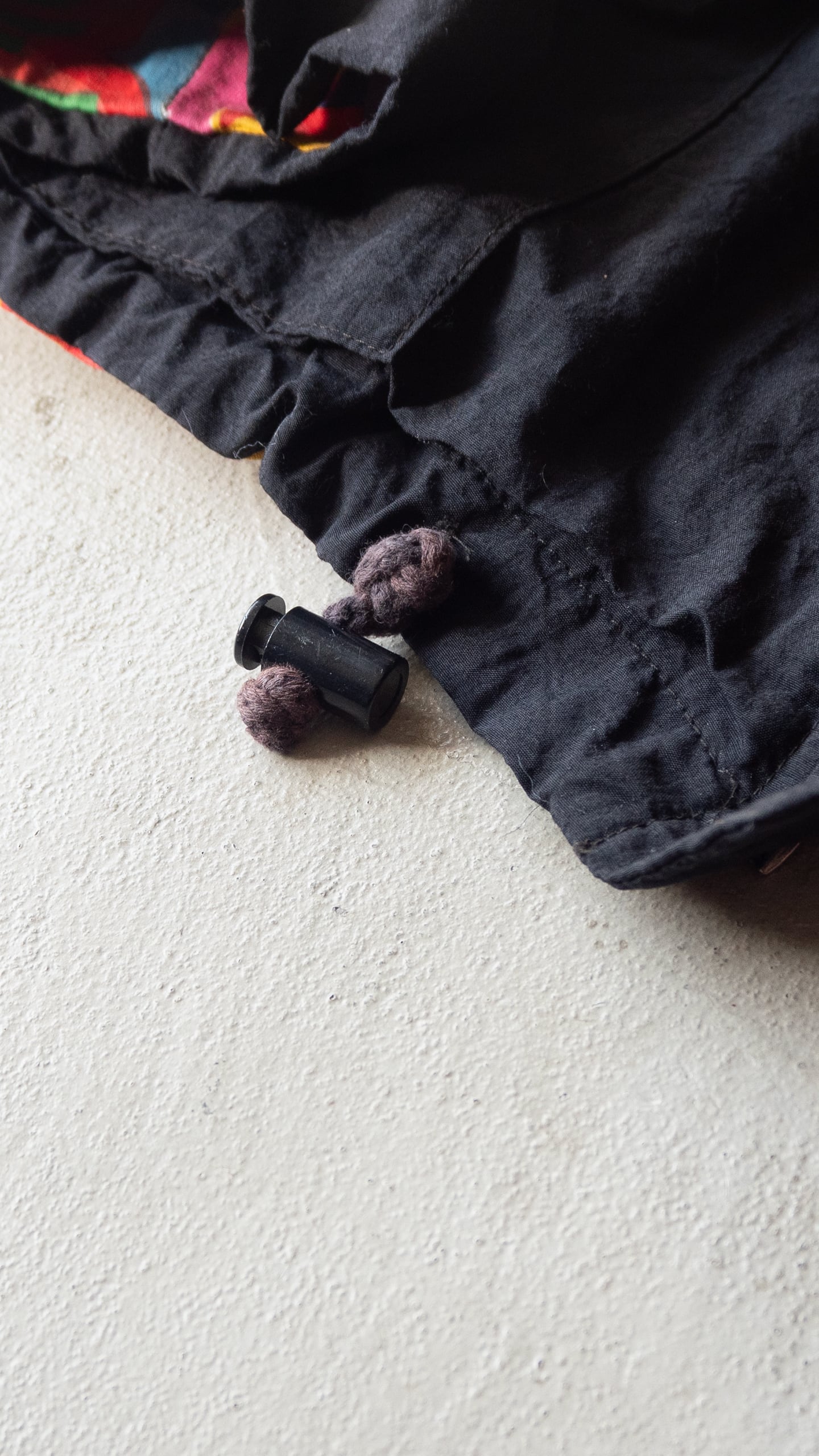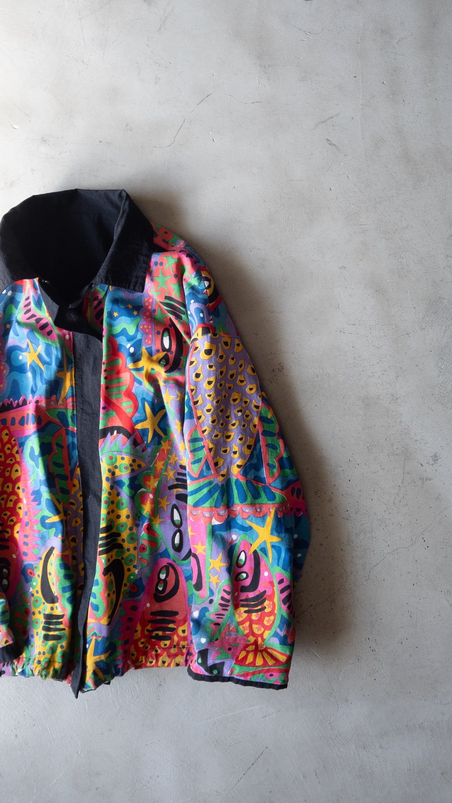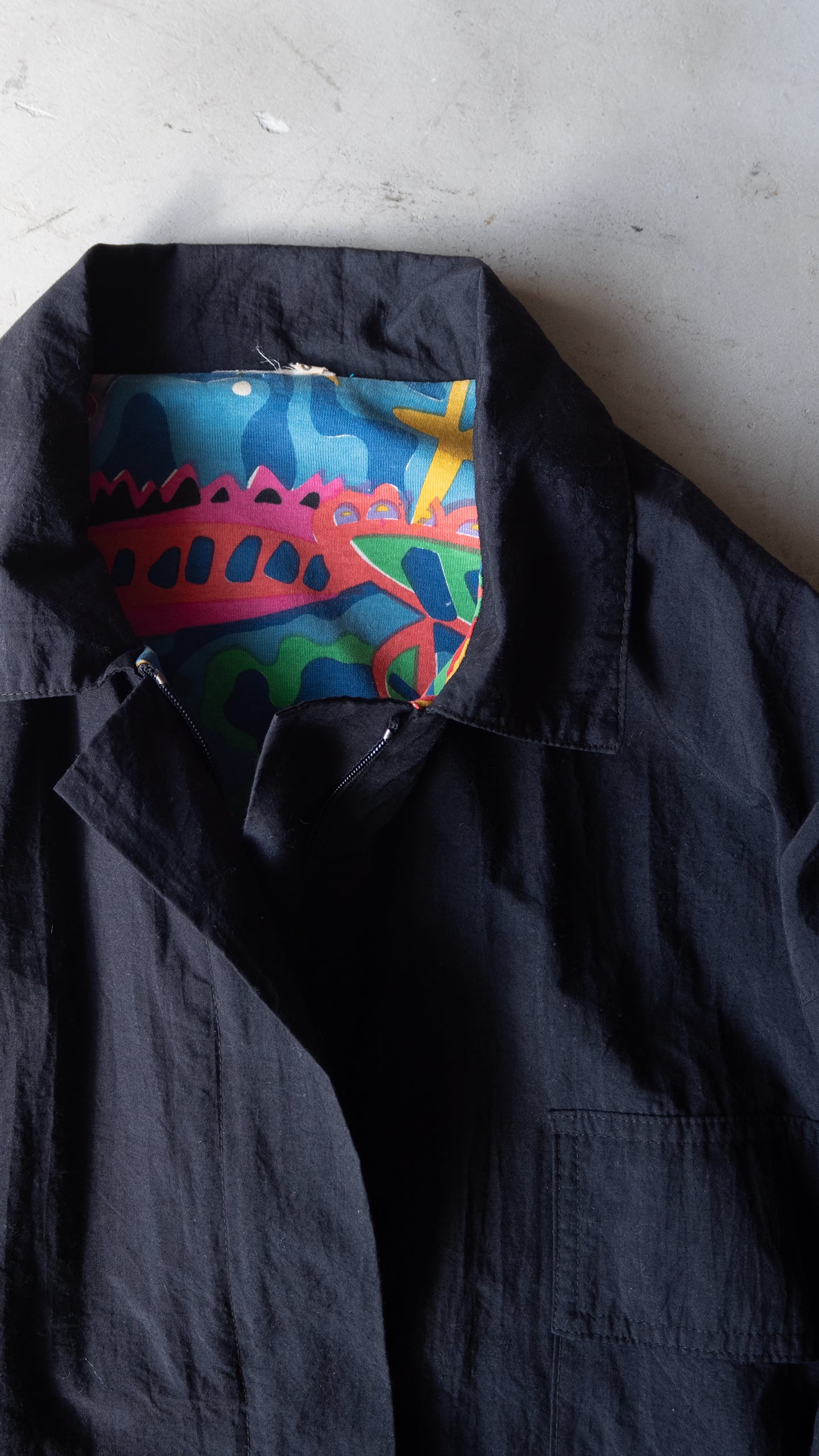表地はブラックのライトシェル、裏地はジャージークロスにクレイジー柄をプリントした生地を組み合わせたブルゾンです。