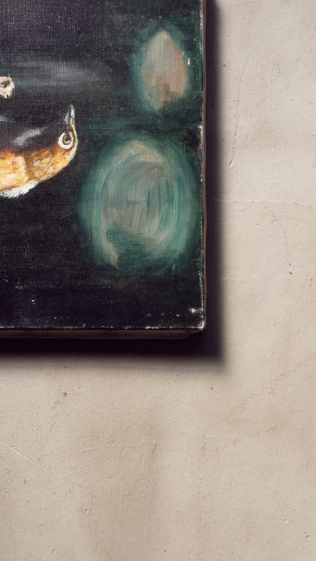 諸々のダメージがありますが、絵画そのもの魅力、見た目のパワー、麻キャンバスや木枠材質の魅力、そして年月が経過したからこそのダメージも含め、これに惹かれピックしました。