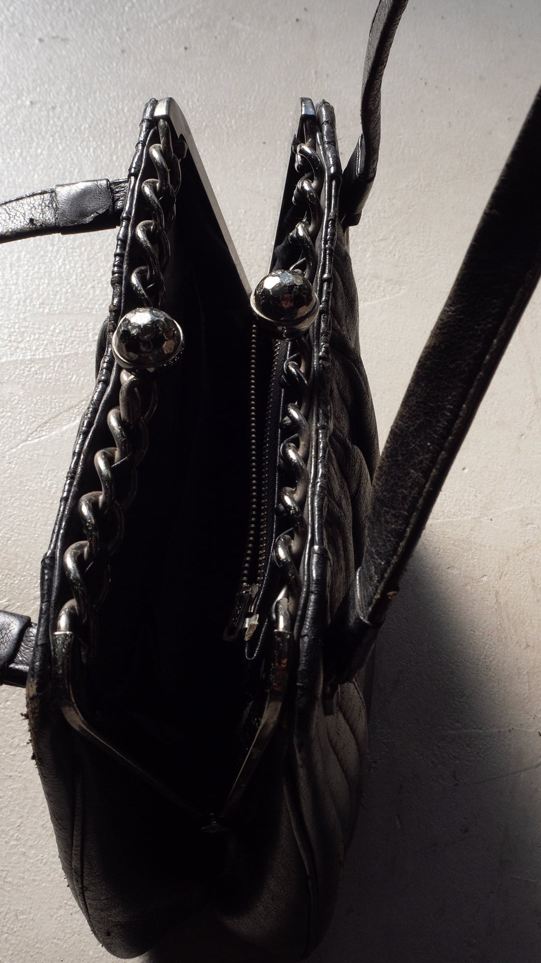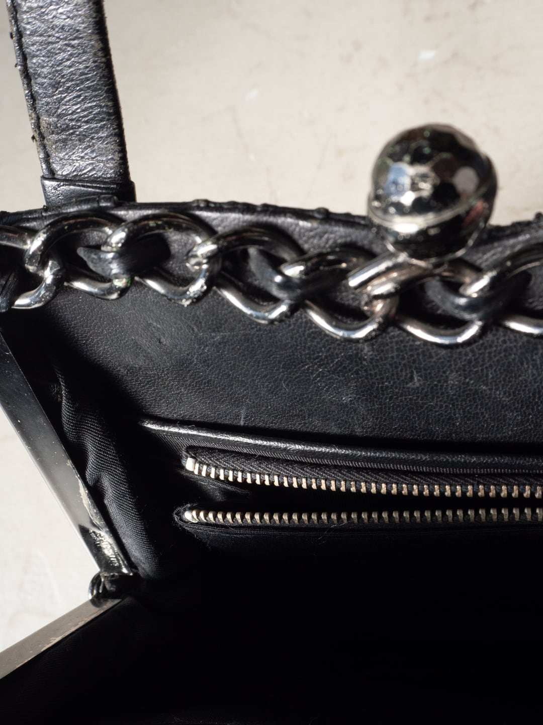 がま口の開閉部分は鎖型に、また革紐での縫い込みとしてデコラティブな作りです。