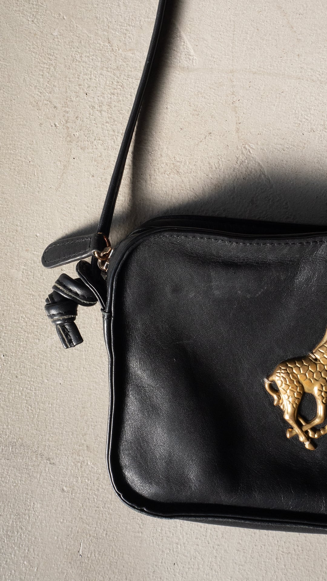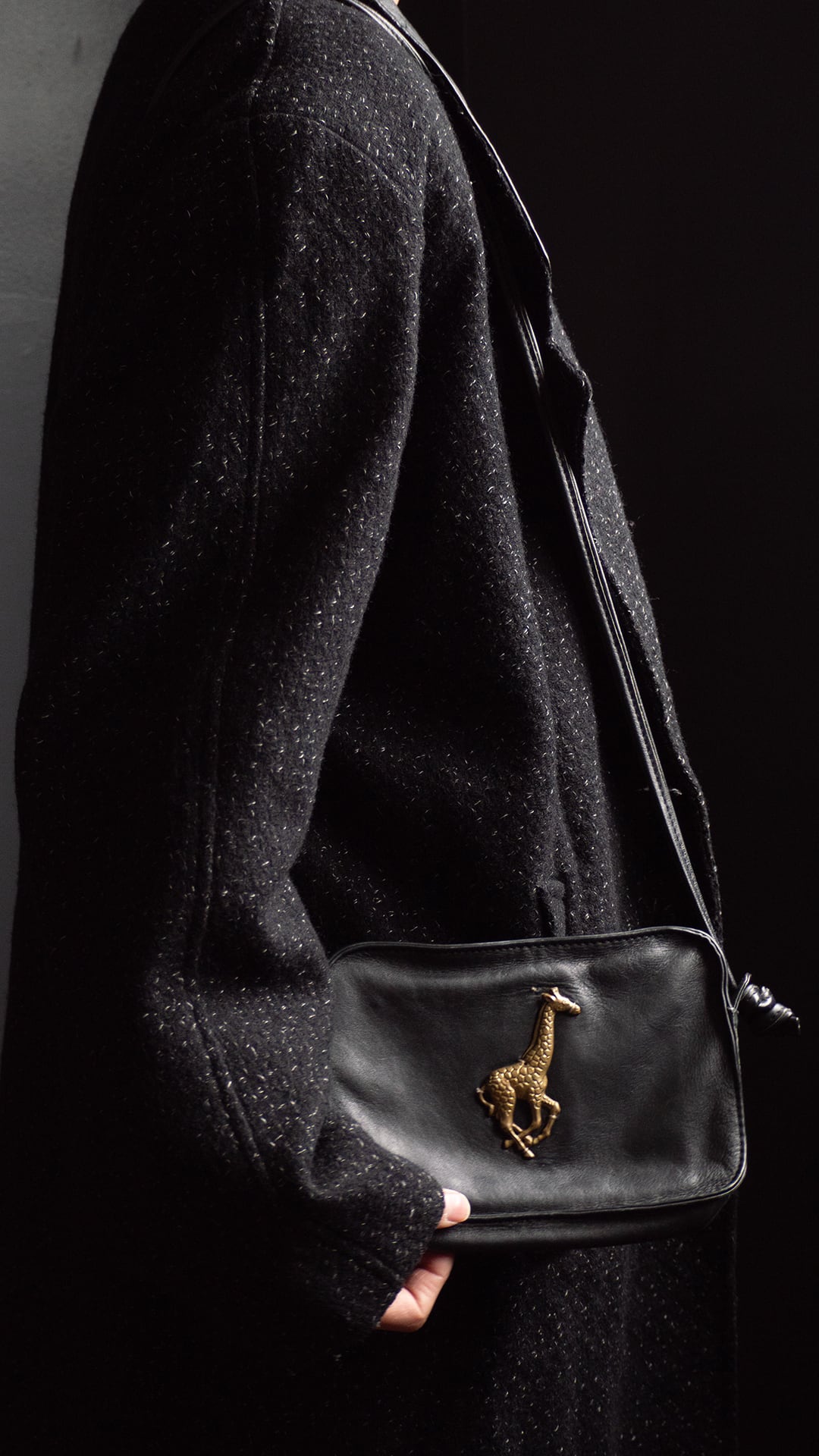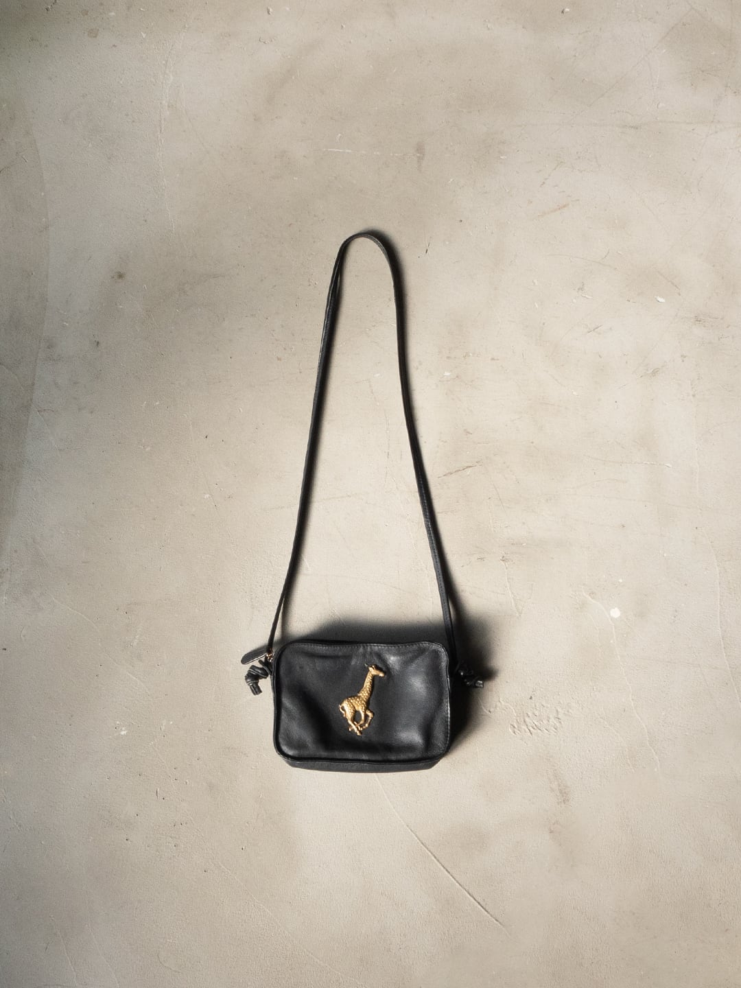 キリンのチャームがついたレザーの小さなショルダーバッグです。
