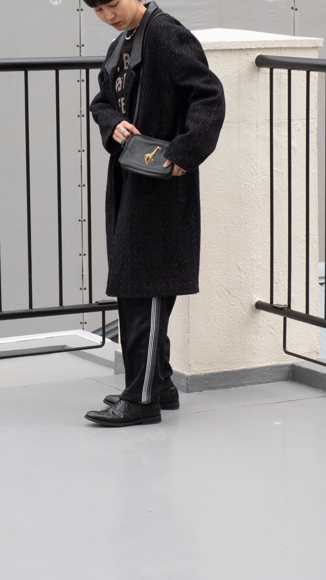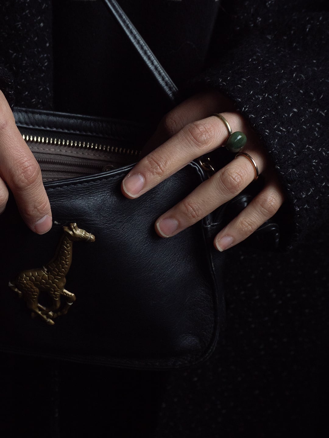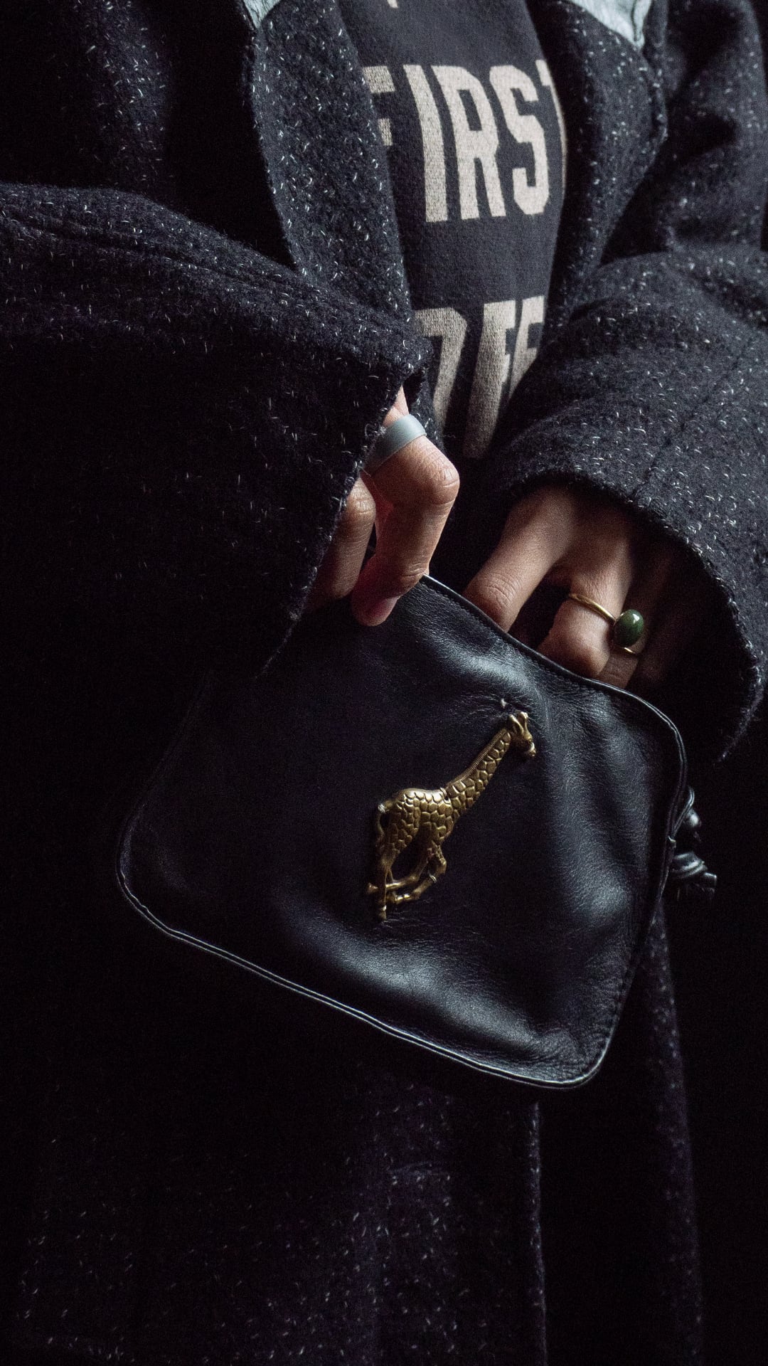 キリンのチャームがついたレザーの小さなショルダーバッグです。