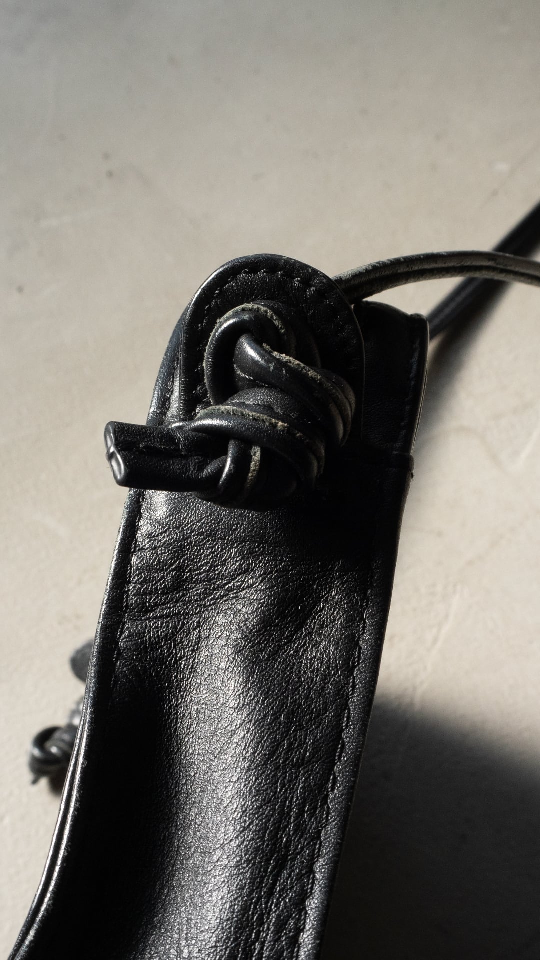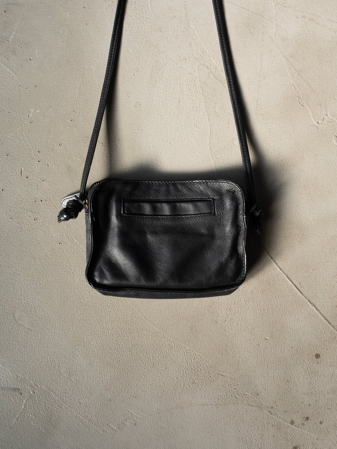 本個体は、本革(牛革)製で、ファスナー、マチ付きのポーチ型のボディに、レザーの紐がついたショルダーバッグです。