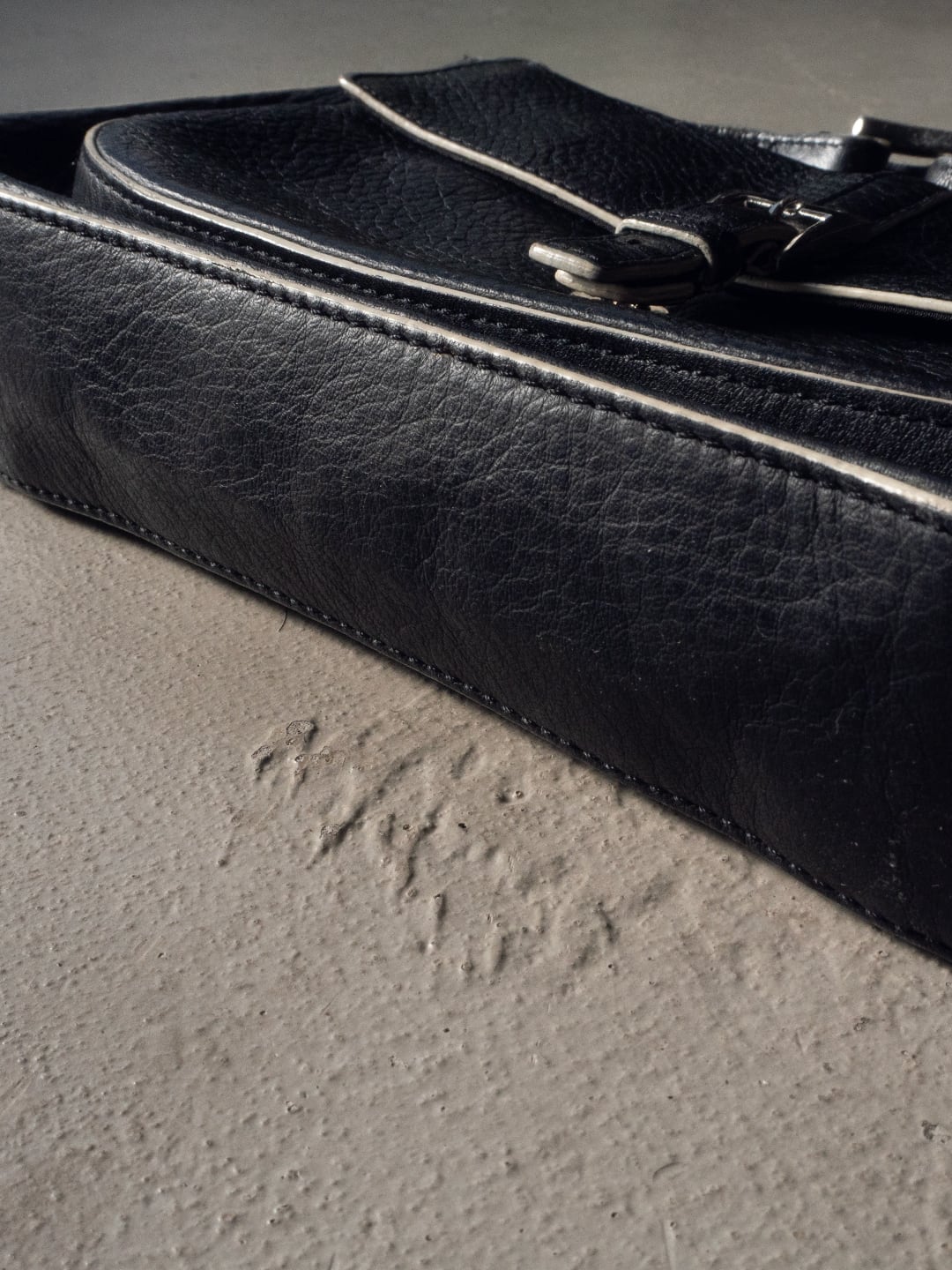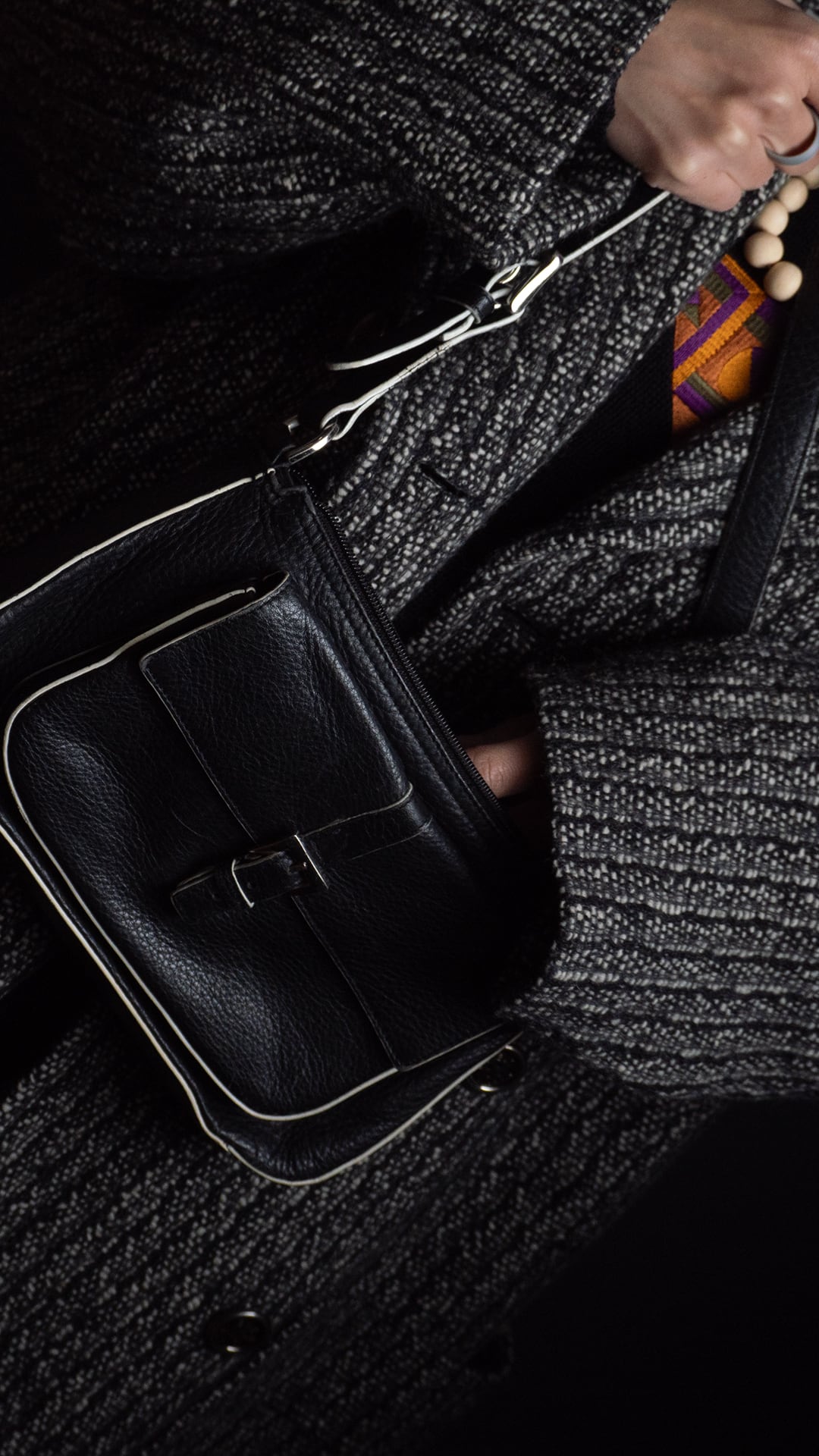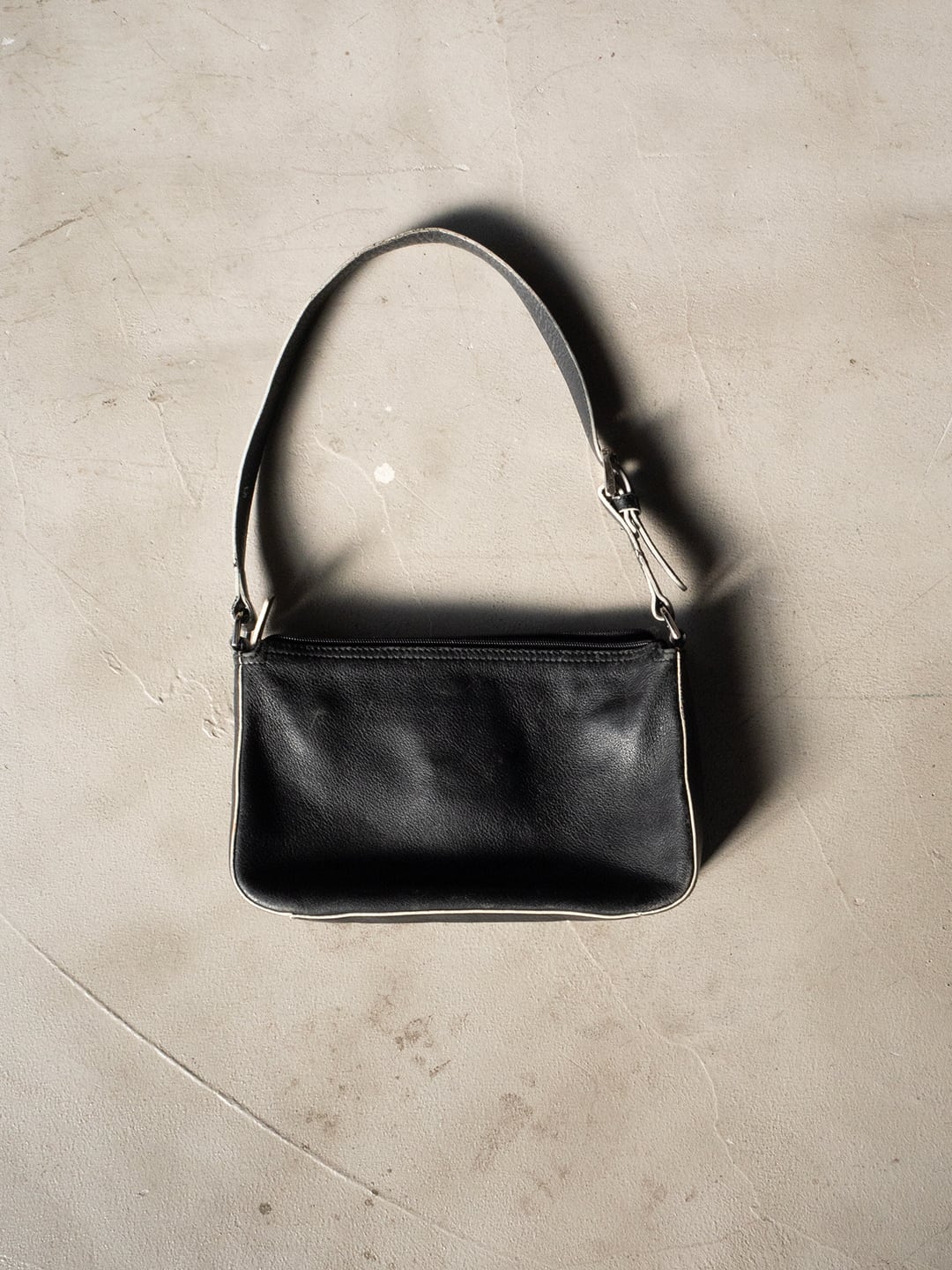 黒い革を本体に、革の裁断側面を白く塗ることで、白いラインが装飾となった、シンプルなレザーミニバッグです。