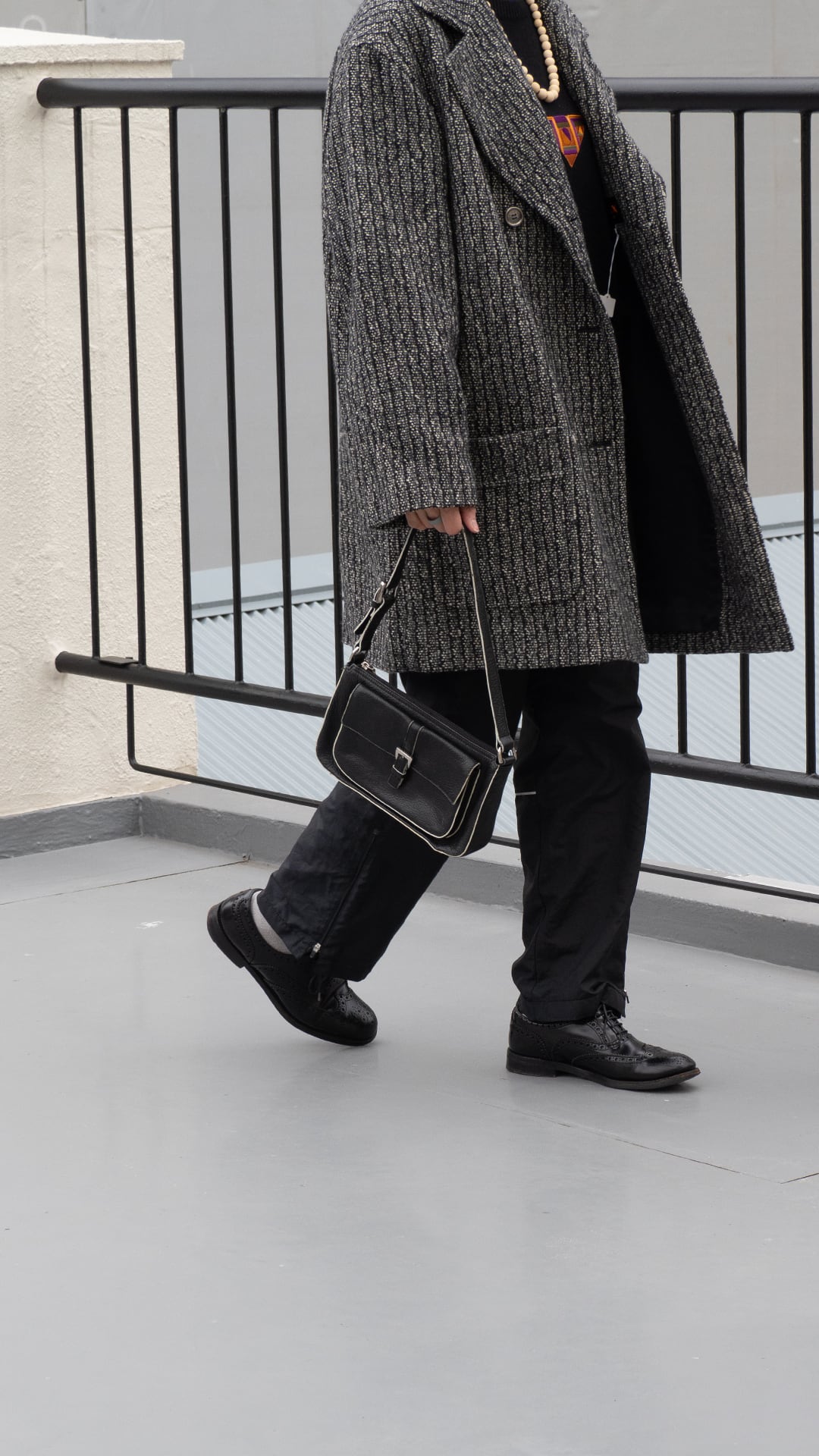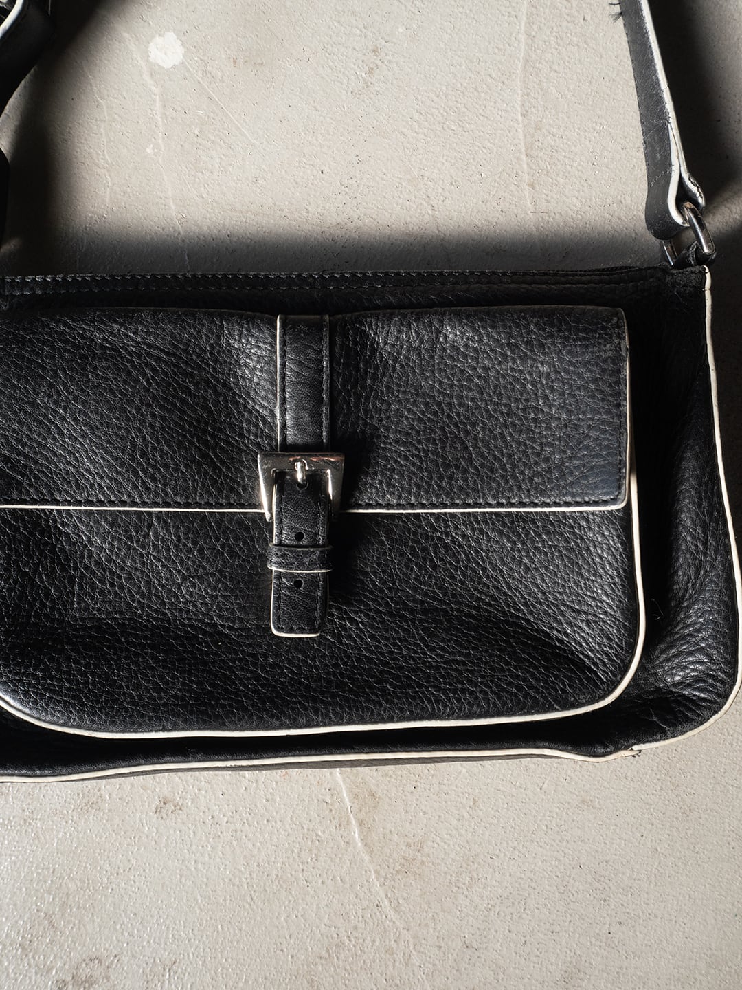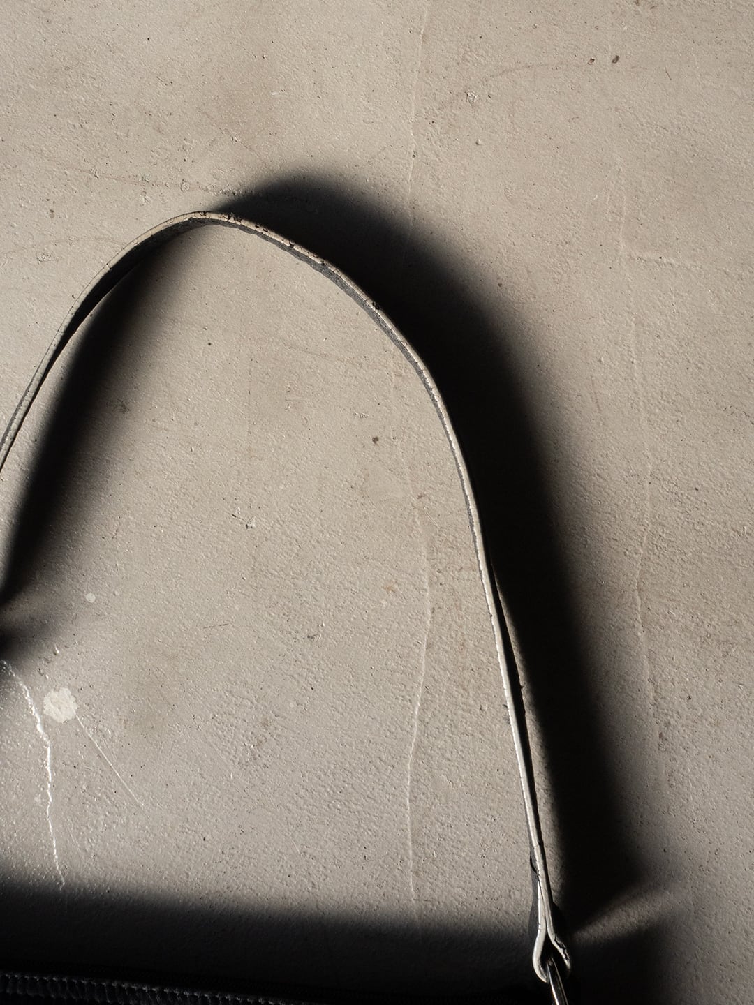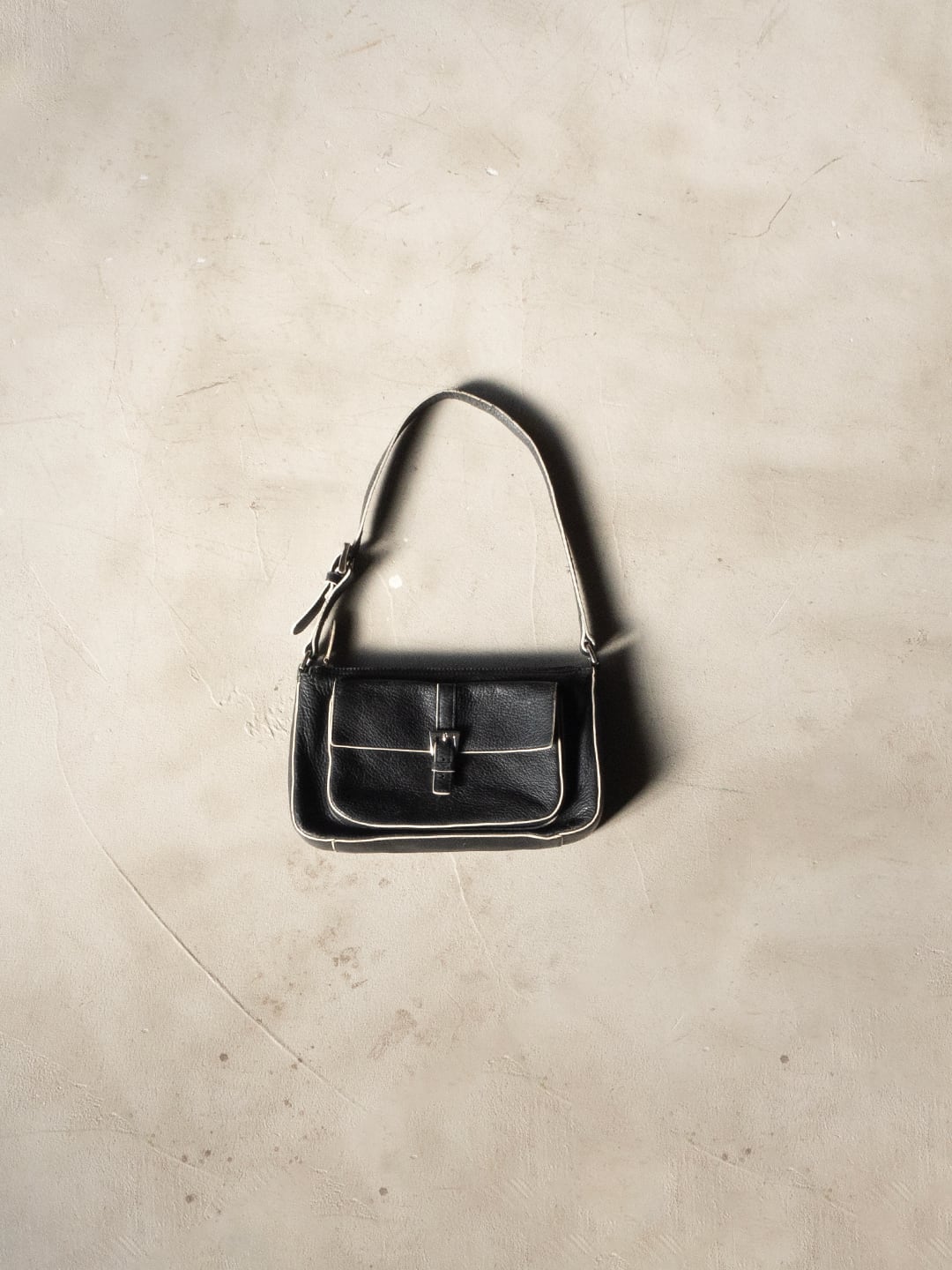 黒い革を本体に、革の裁断側面を白く塗ることで、白いラインが装飾となった、シンプルなレザーミニバッグです。