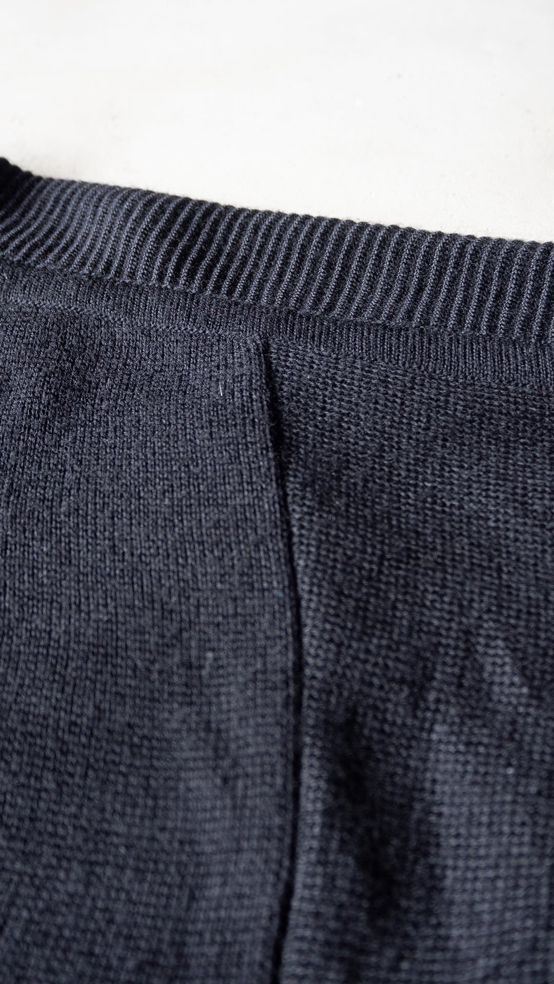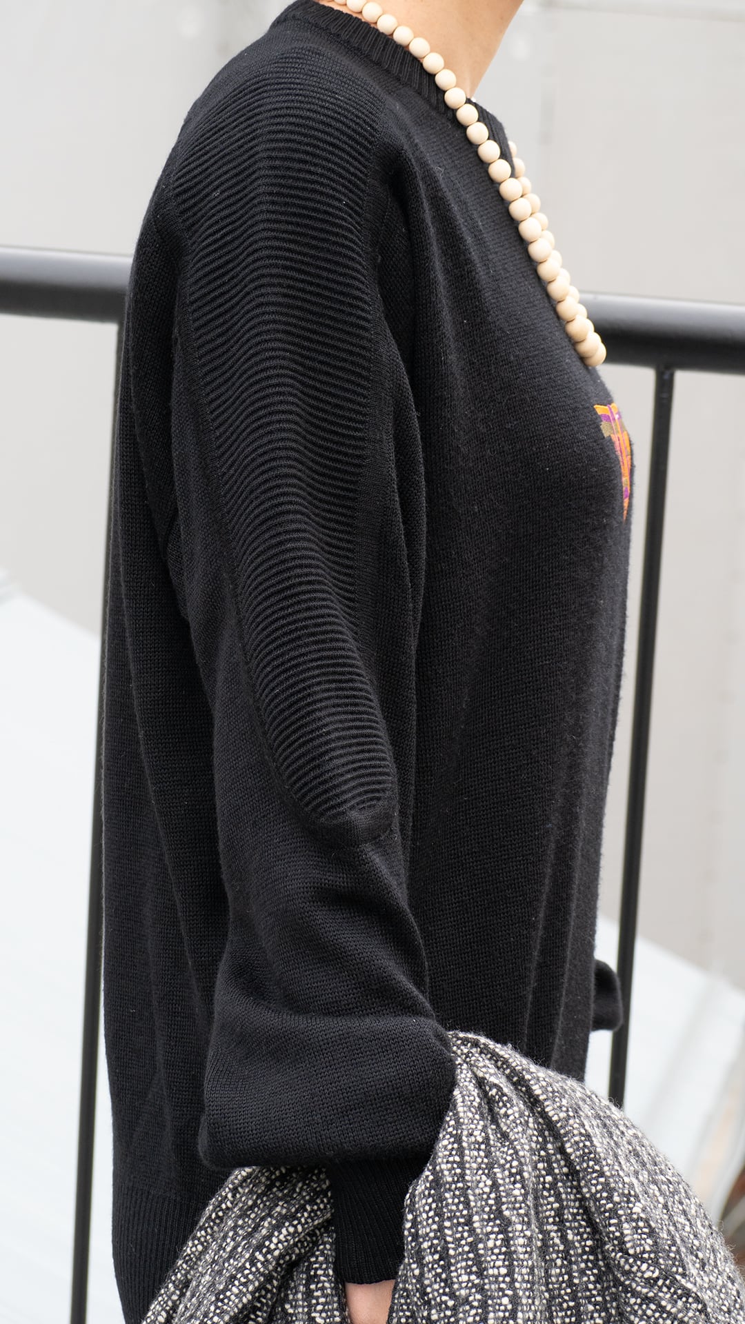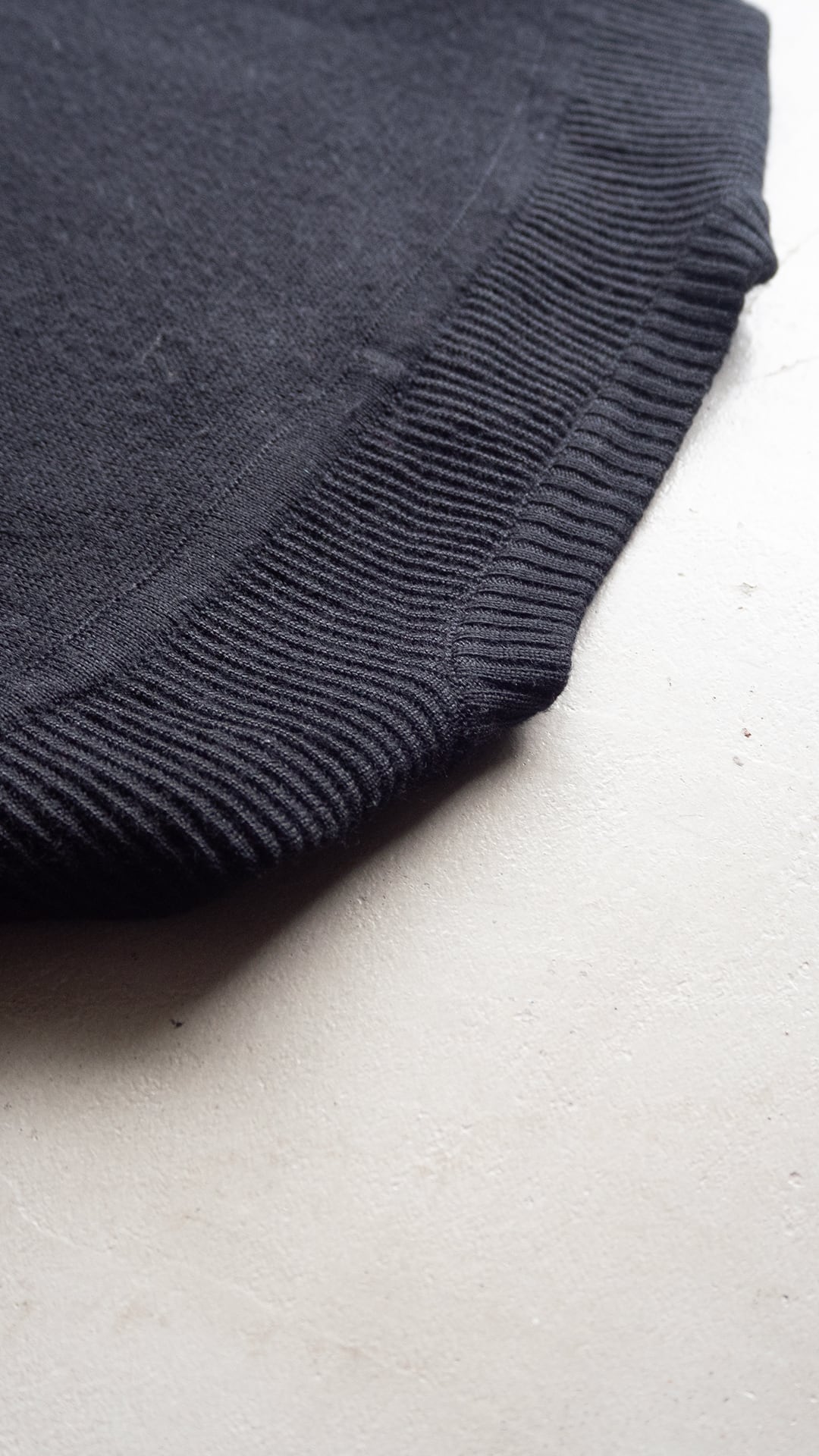 今回のニットは、ブラックのウール70%アクリル30%の糸で、中太番手の糸をハイゲージに編み立てた一着。
