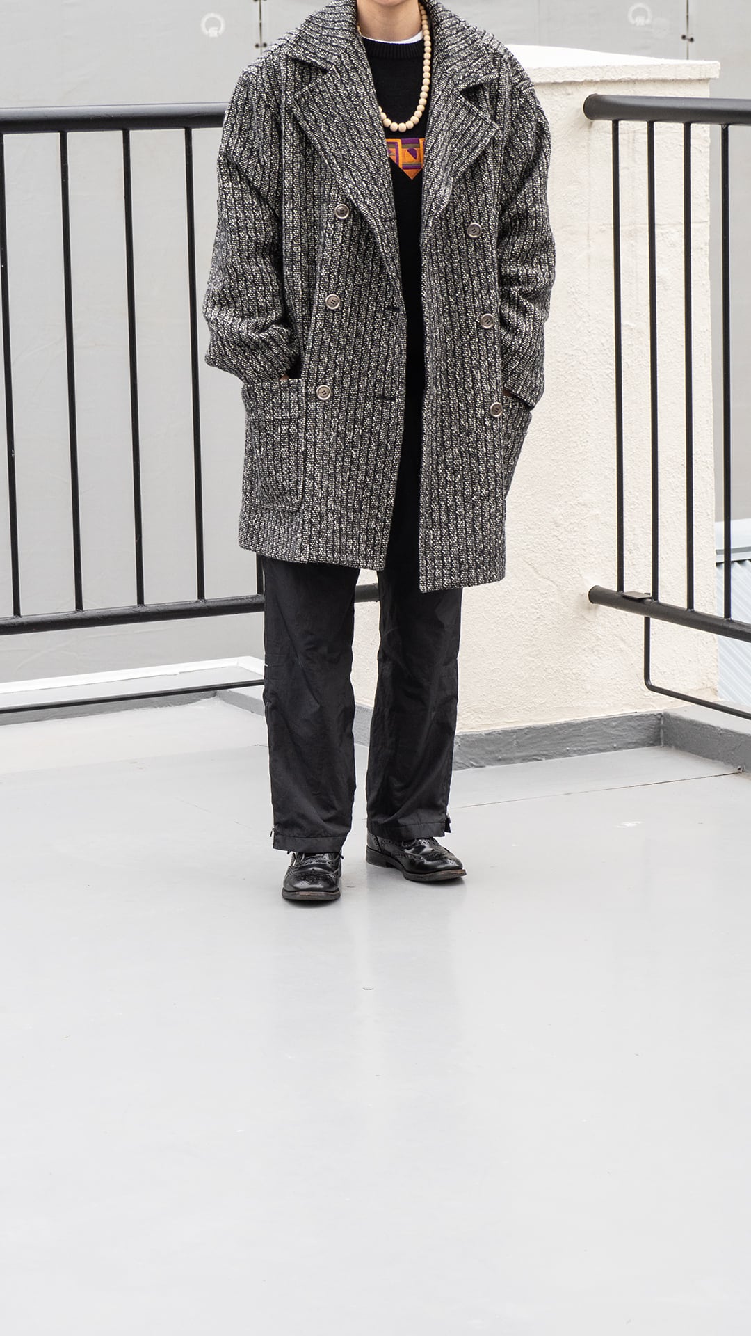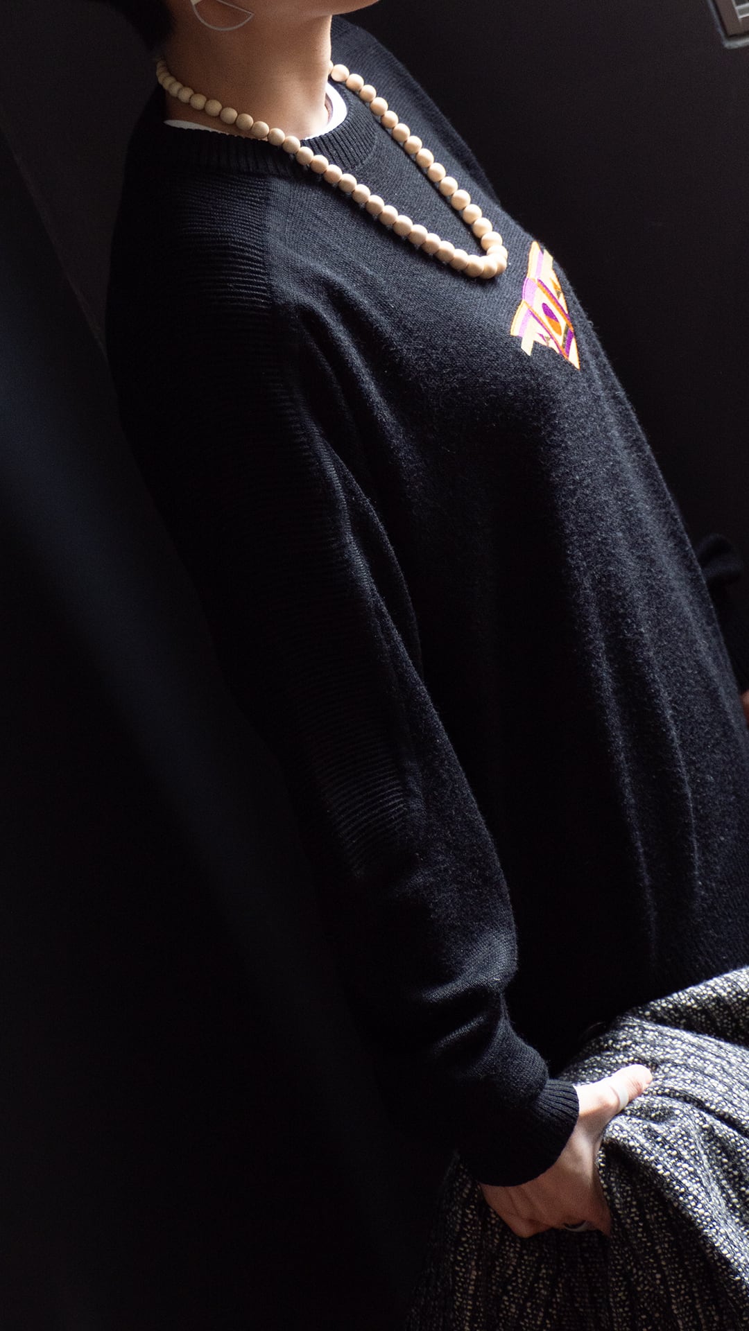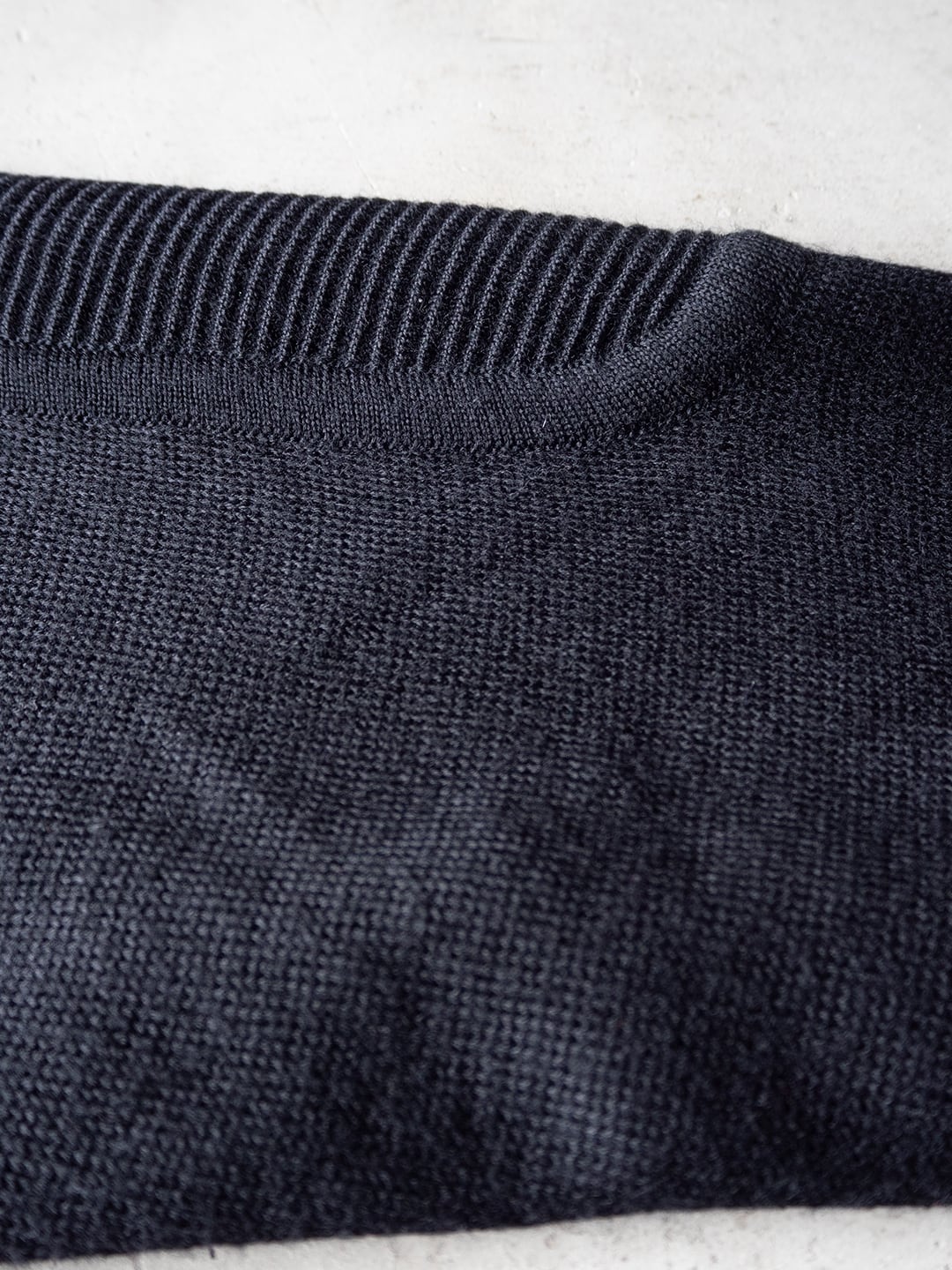 今回のニットは、ブラックのウール70%アクリル30%の糸で、中太番手の糸をハイゲージに編み立てた一着。