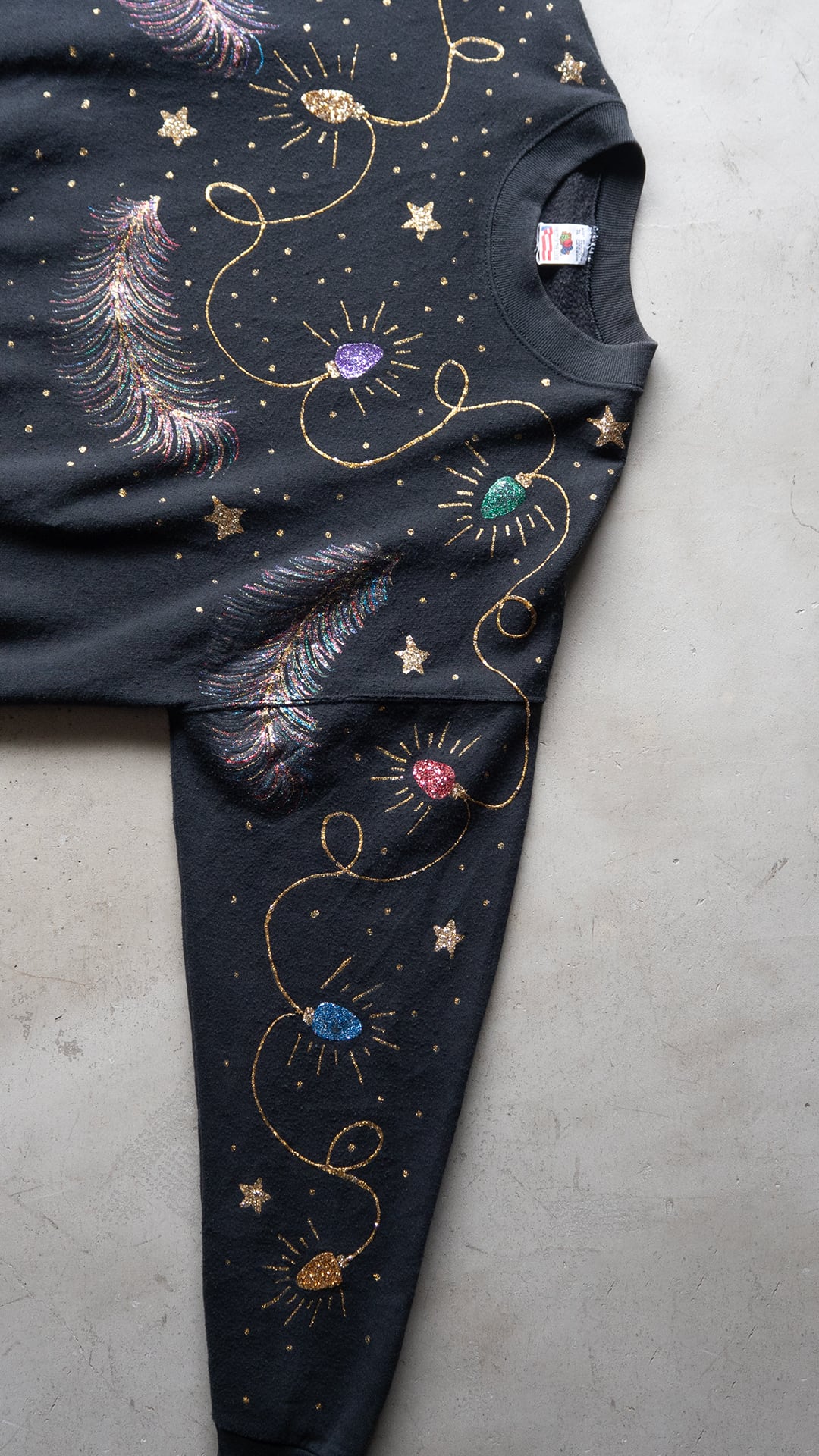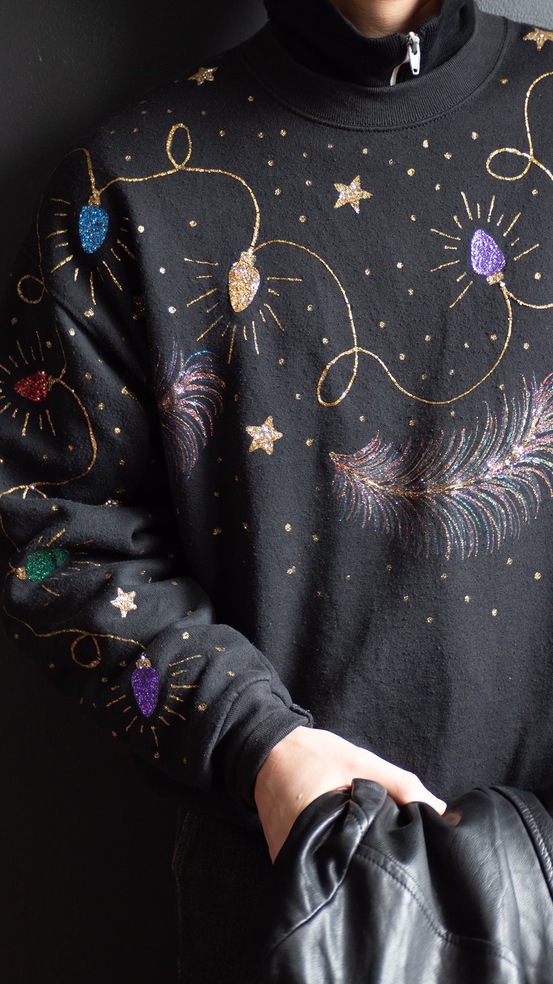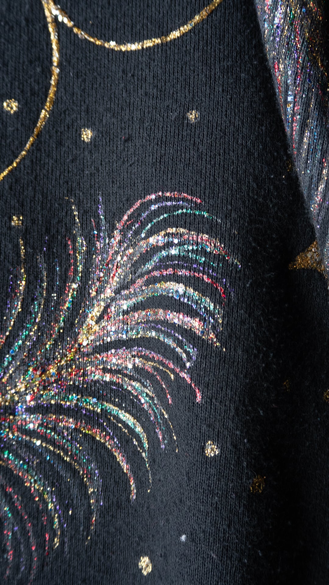 90年代前後のFRUIT OF THE LOOM社製ボディに、ラメ入りのペンによるデコレーションが施されたスウェットです。