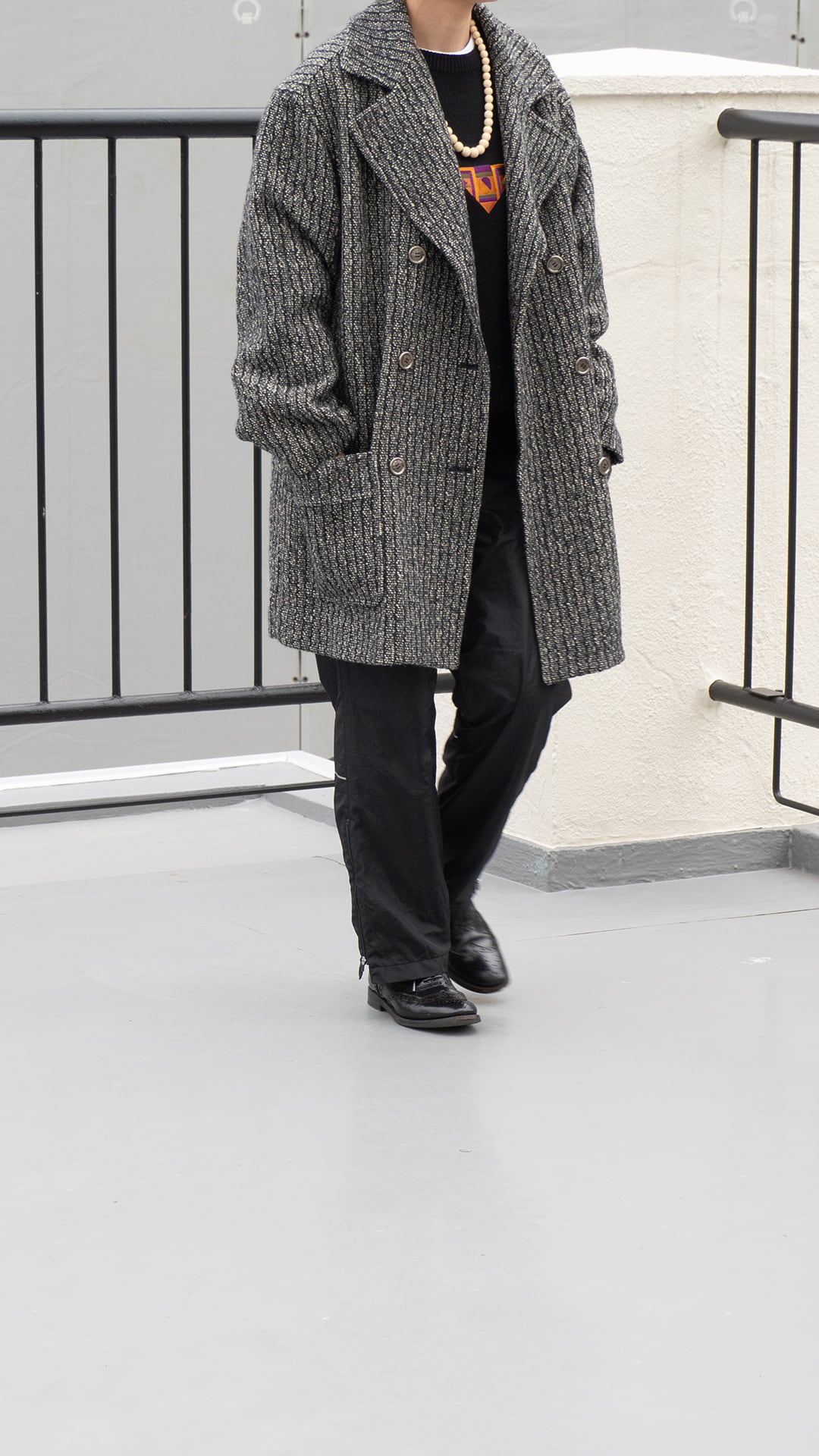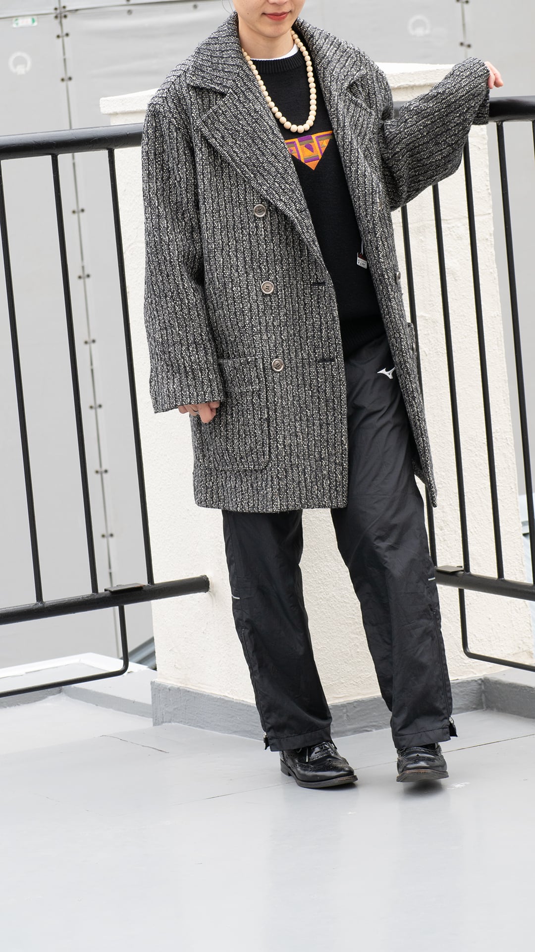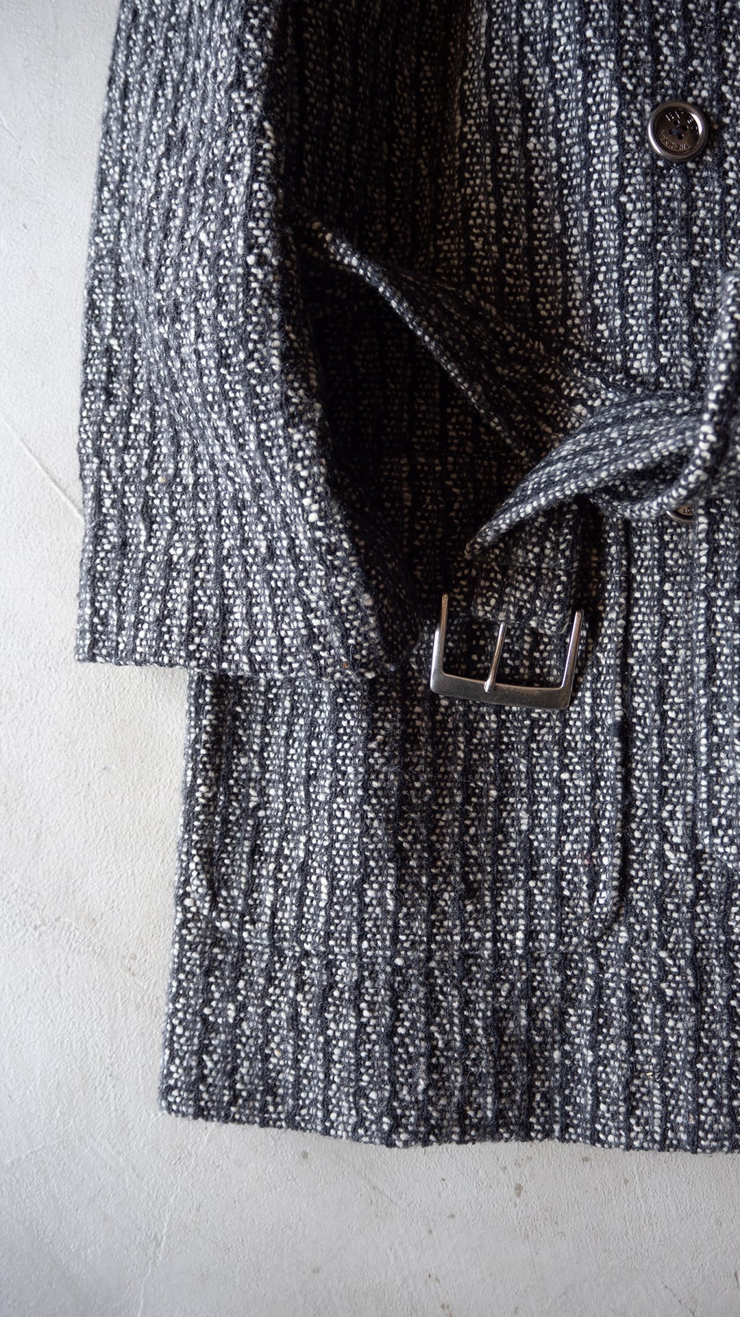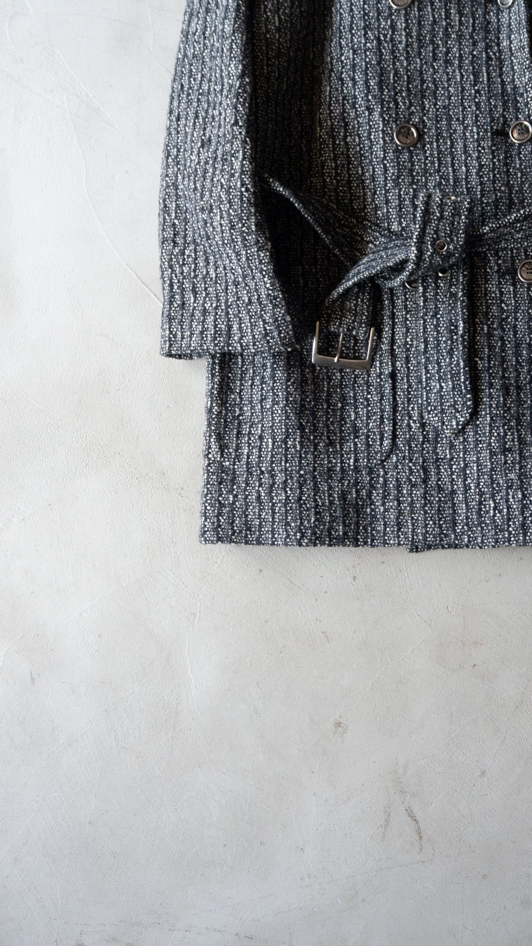 リングツイードを思わす、太く不揃いな紡毛糸で取られた厚手のツイードをメインファブリックに裏地を付きダブル型に仕立てています。