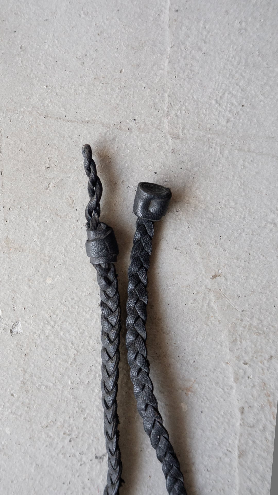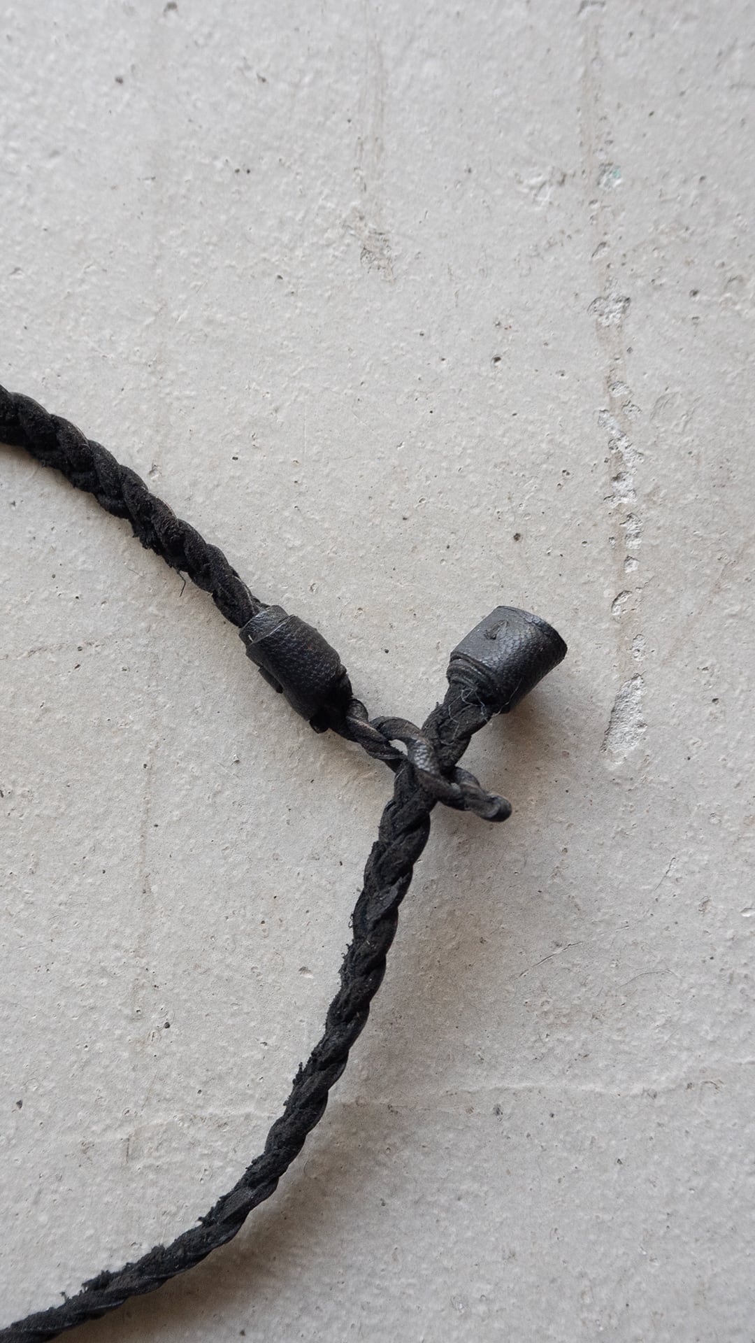 このネックレスは、レザー紐を編み込んだもので、接続部分は、片方は丸型に膨らませ、もう片方は紐を捻って、その逆回転反発で繋げられるようにできています。