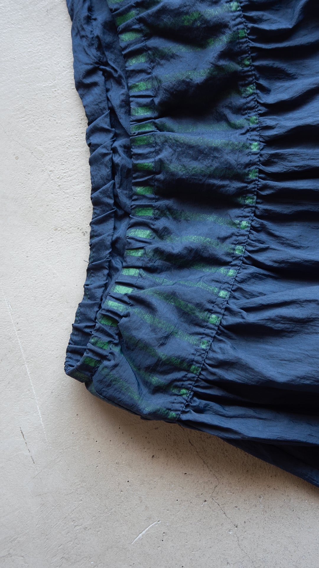 またハイネックになる襟部分、裾部分には、グリーンの縞々ラインがプリントされています。